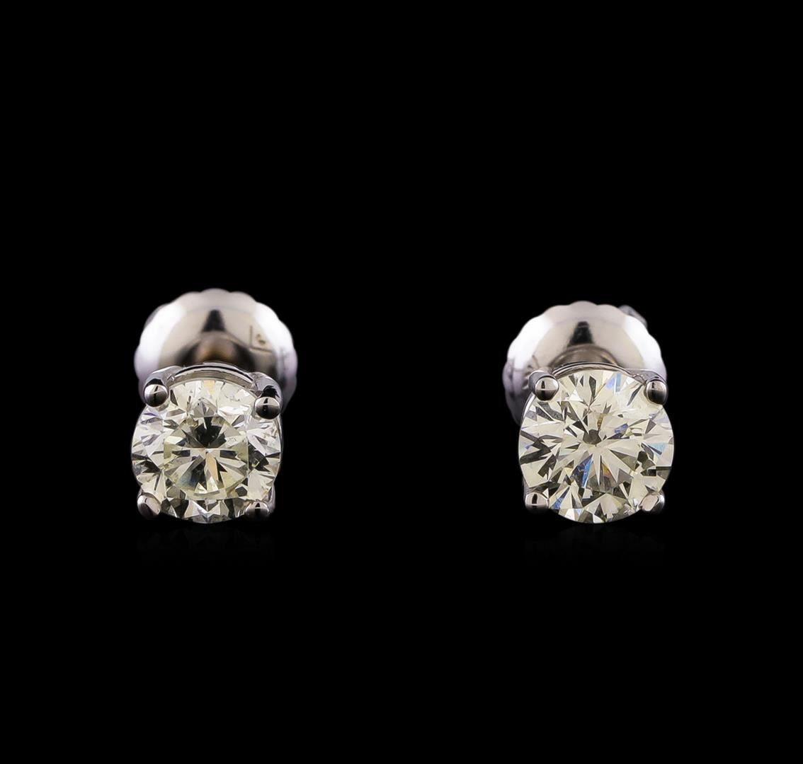 One pair electronically tested 14KT white gold cast & assembled diamond solitaire earrings with screw backs. Condition is new, good workmanship. Containing: One prong set round brilliant cut diamond, measuring 5.03 - 5.01 x 3.31mm (depth est.), 2.00% GTCF approximate weight of 0.52ct with a very strong blue fluorescence. Graded in the setting. Clarity: SI-2. Color: 65.9%. Table 53.4%. One prong set round brilliant cut diamond, measuring 4.83 - 4.80 x 3.01mm (depth est.), 10.00% GTCF approximate weight of 0.48ct with a very strong blue fluorescence. Graded in the setting. Clarity: SI-2. Color: K. Depth 62.5%. Table 61.2%. Total Weight of Diamonds 1.00ct. Total Weight of Earrings 1.00 grams. AIG Appraised at $4,200.00.