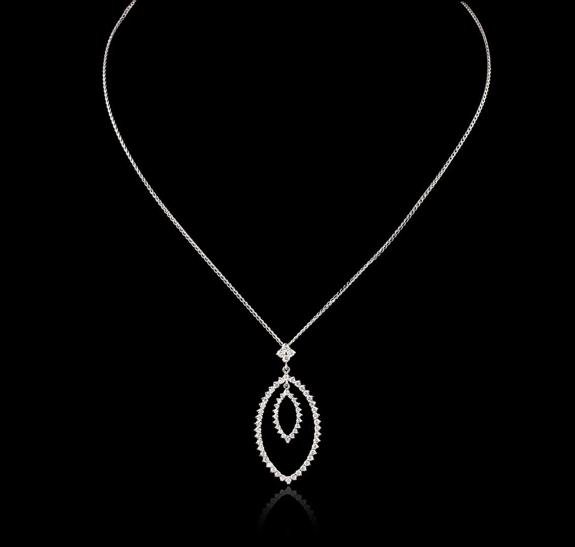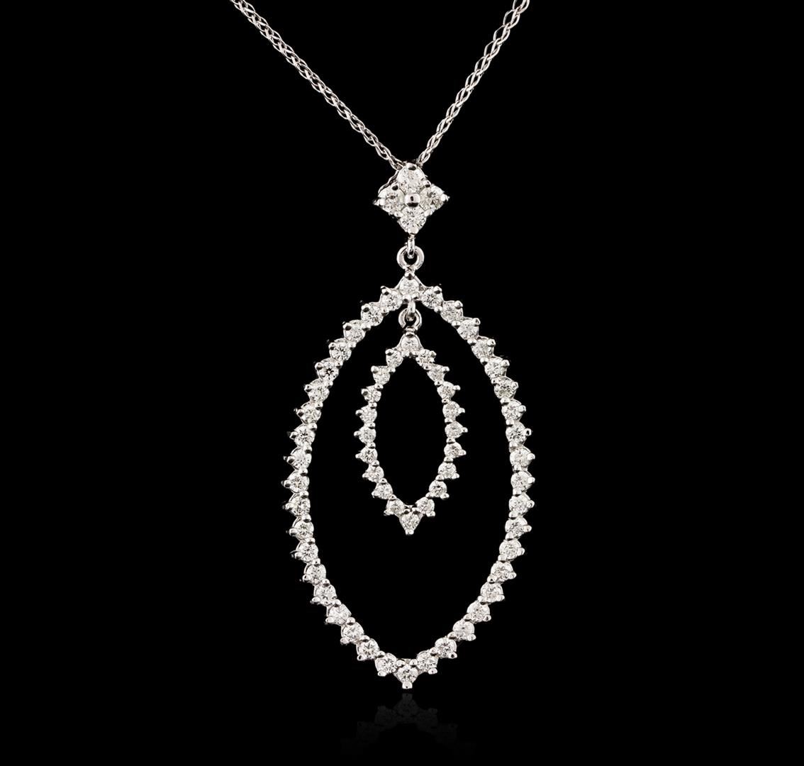 One electronically tested 14KT white gold ladies cast diamond pendant & chain 18.0" long, with a spring ring clasp with a bright polish finish. Identified with markings of "14K". Condition is new. Containing: Sixty-Four prong set round brilliant cut diamonds, measuring 1.90 - 1.50 x 1.02mm (depth est.) approximate total weight of 64 Stones = 1.00ct. Clarity: SI-2 to I-1. Color: H - I, Cut is Good. All diamonds are graded in the mounting, unless otherwise stated. Total Weight of Diamonds 1.00ct. Total Weight of Pendant & Chain 4.60 grams. GGL Appraised at $2,790.00.