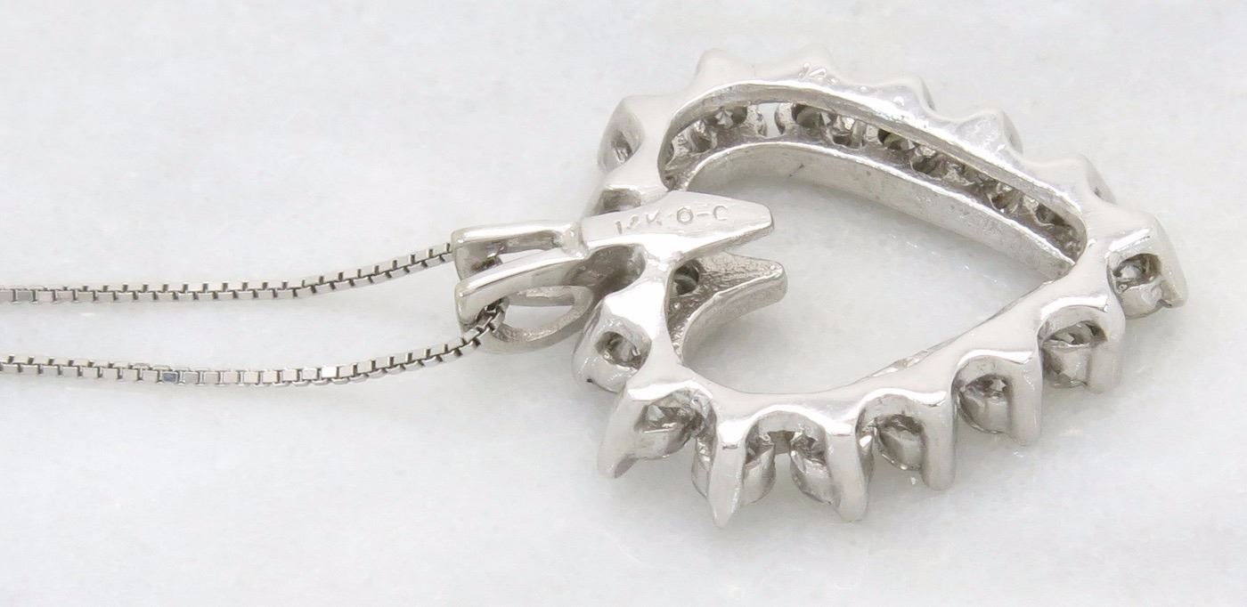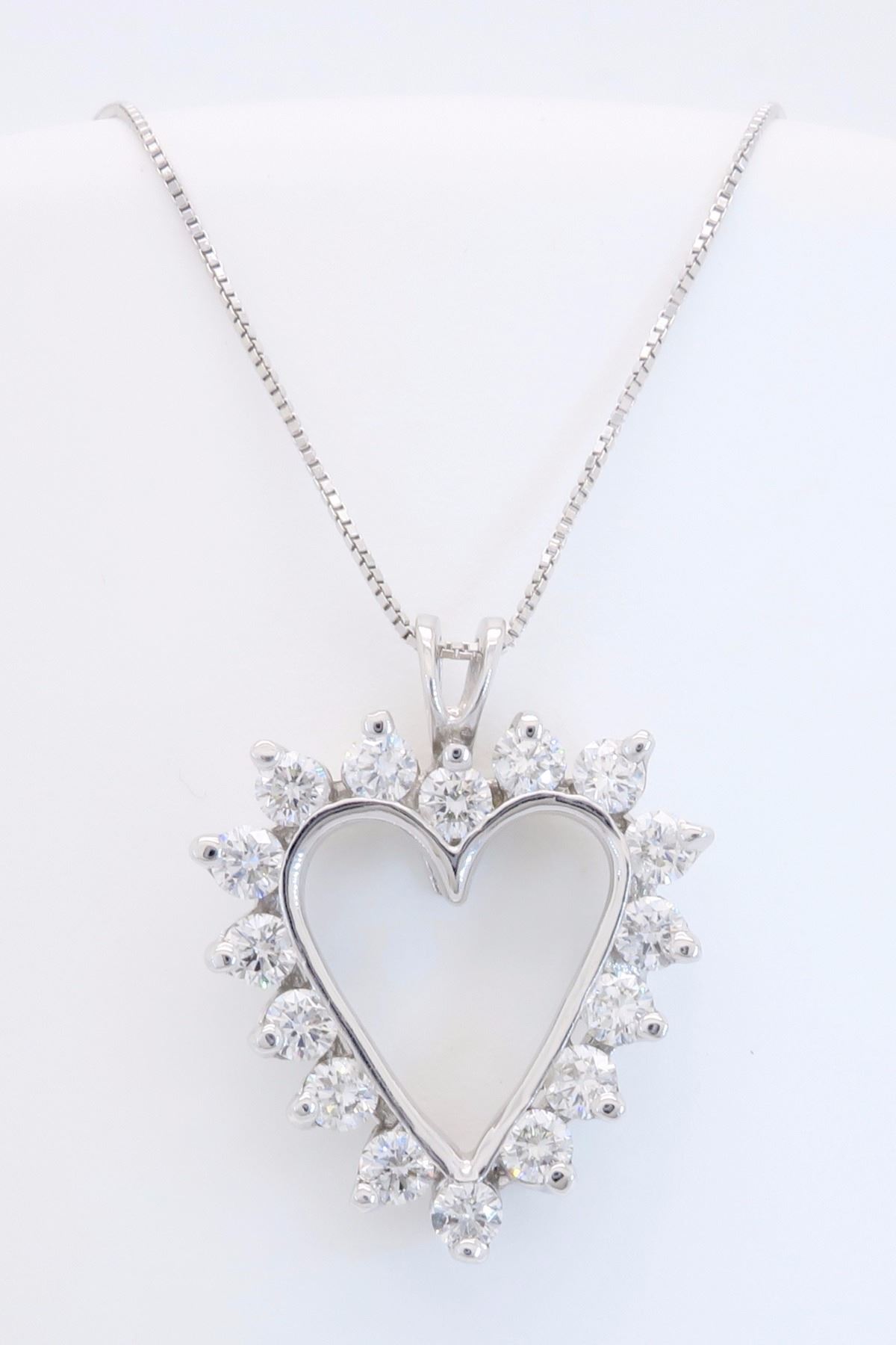 One 14KT White Gold 1.00ctw Diamond Pendant with Chain. Round Diamonds with a total weight of 1.00cts with a color of G-H and clarity of SI-1. 18 inch chain. Total weight of this pendant with chain is 3.9 grams.
