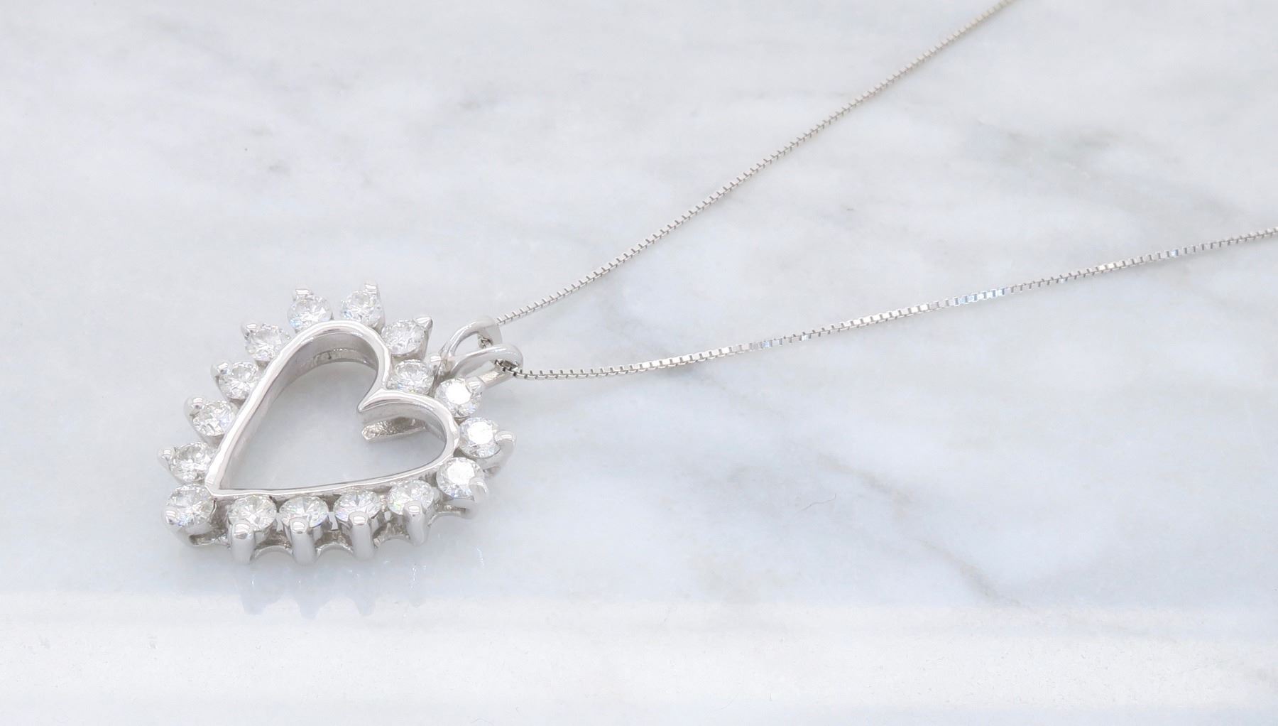 One 14KT White Gold 1.00ctw Diamond Pendant with Chain. Round Diamonds with a total weight of 1.00cts with a color of G-H and clarity of SI-1. 18 inch chain. Total weight of this pendant with chain is 3.9 grams.
