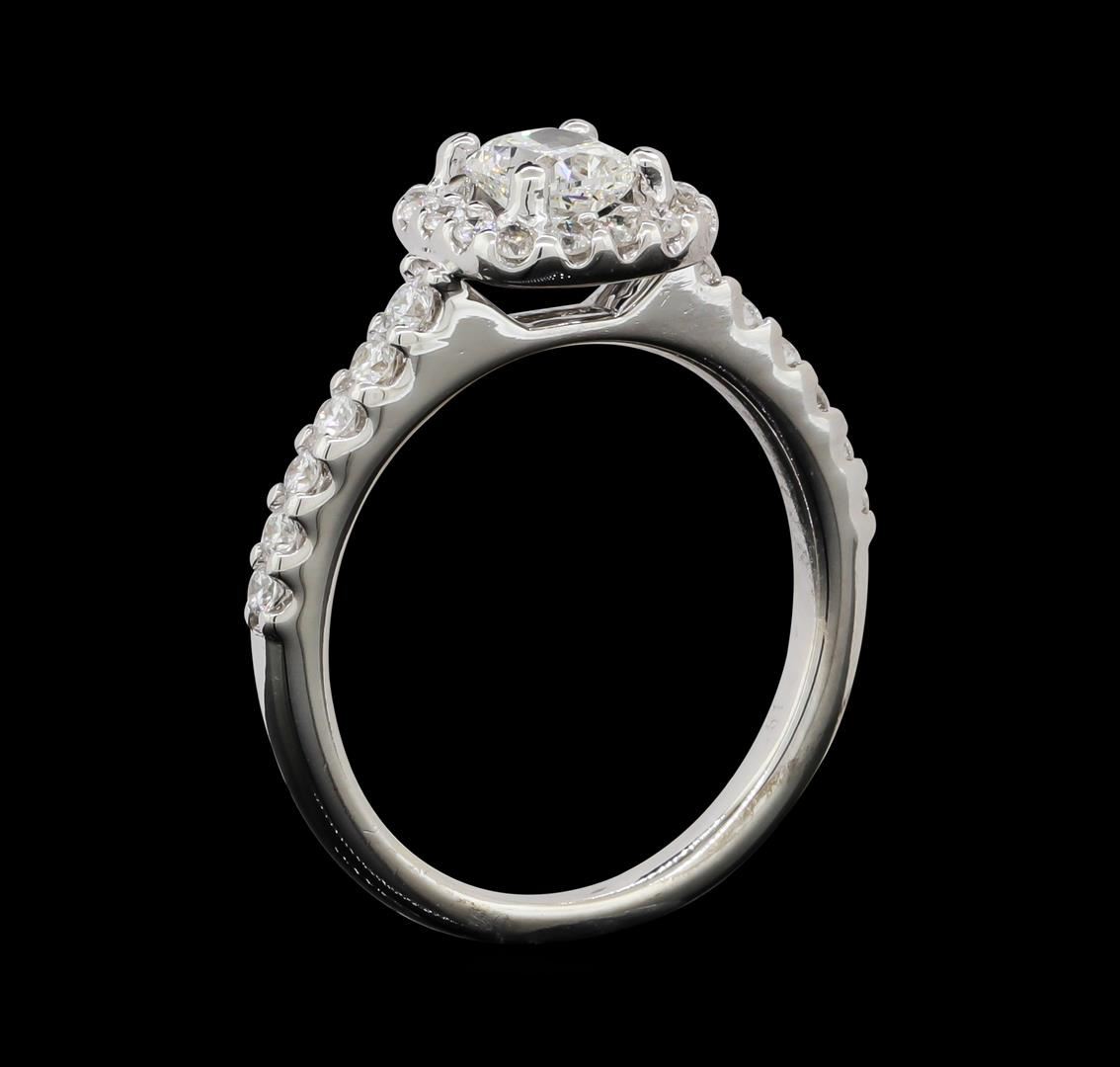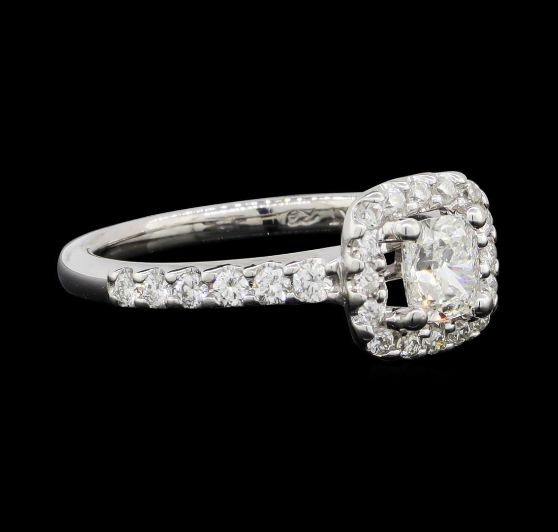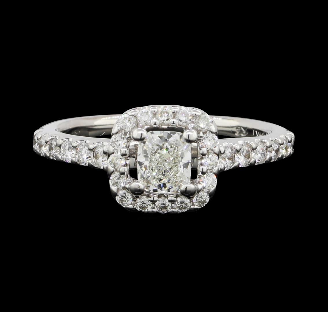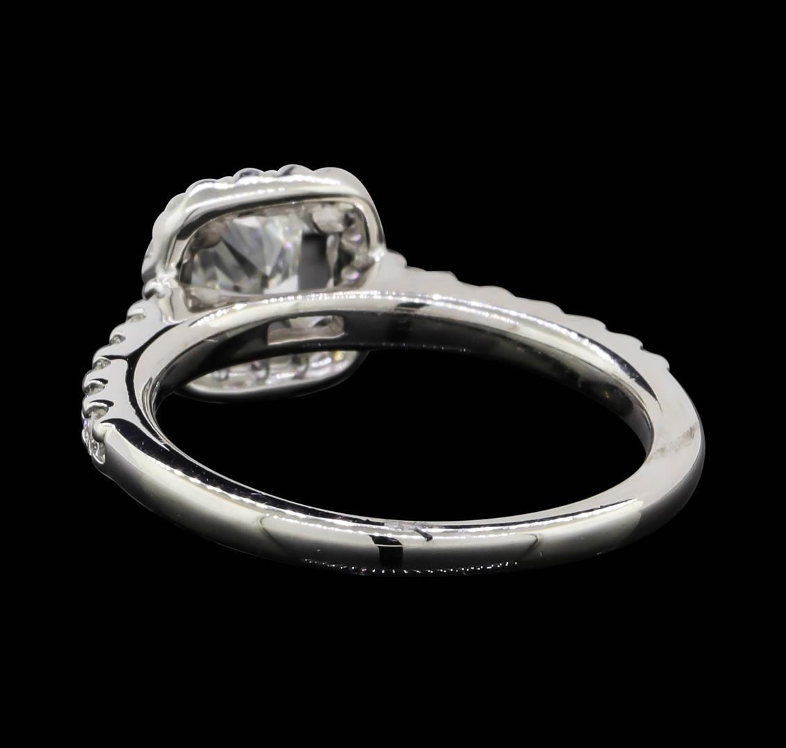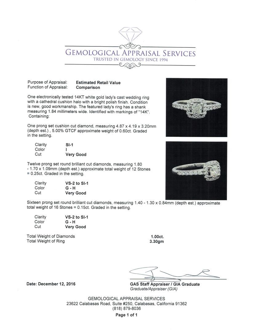 One electronically tested 14KT white gold lady's cast wedding ring with a cathedral cushion halo with a bright polish finish. The featured lady's ring has a shank measuring 1.84 millimeters wide. Identified with markings of "14K". Condition is new, good workmanship. Containing: One prong set cushion cut diamond, measuring 4.87 x 4.19 x 3.20mm (depth est.) , 5.00.%. GTCF approximate weight of 0.60ct. Graded in the setting. Clarity: SI-1. Color: ICut Very Good Twelve prong set round brilliant cut diamonds, measuring 1.80 - 1.70 x 1.09mm (depth est.) approximate total weight of 12 Stones = 0.25ct. Graded in the setting. Clarity: VS-2 to SI-1. Color: G - HCut Very Good Sixteen prong set round brilliant cut diamonds, measuring 1.40 - 1.30 x 0.84mm (depth est.) approximate total weight of 16 Stones = 0.15ct. Graded in the setting. Clarity: VS-2 to SI-1. Color: G - HCut Very Good. Total Weight of Diamonds 1.00ct. Total Weight of Ring 3.30gm. GAS Appraised.