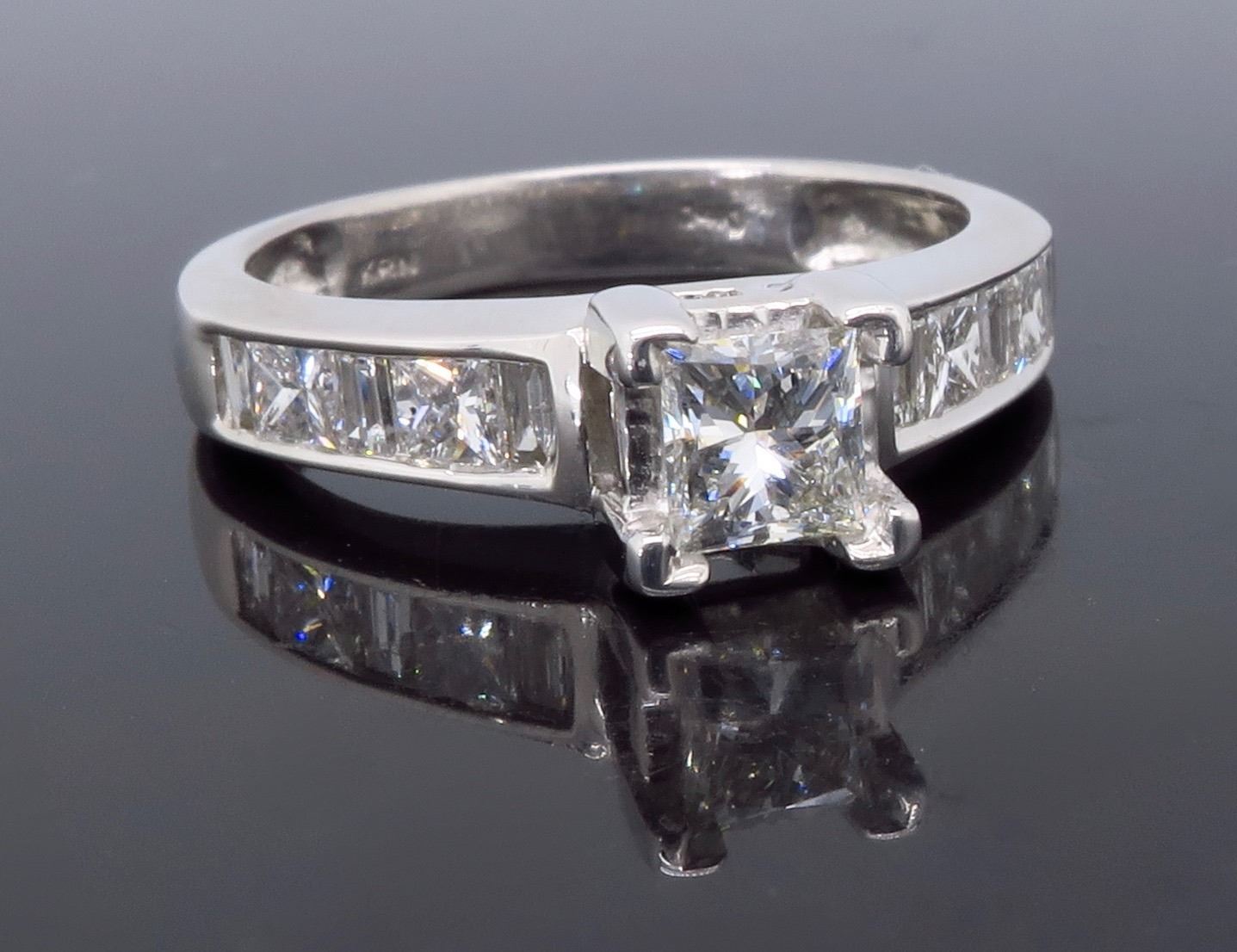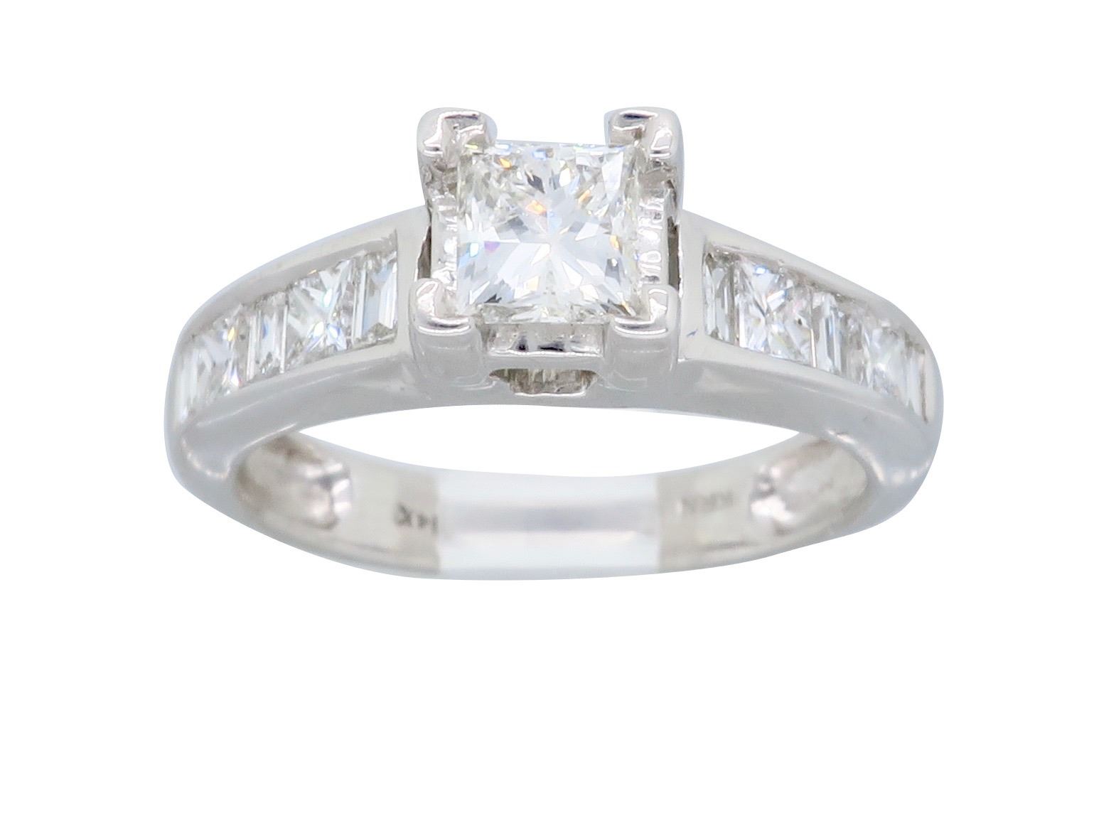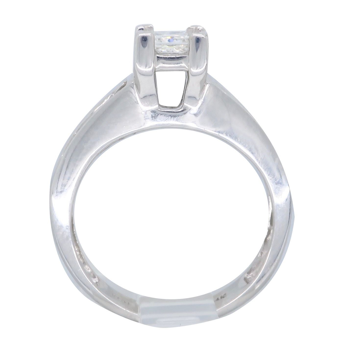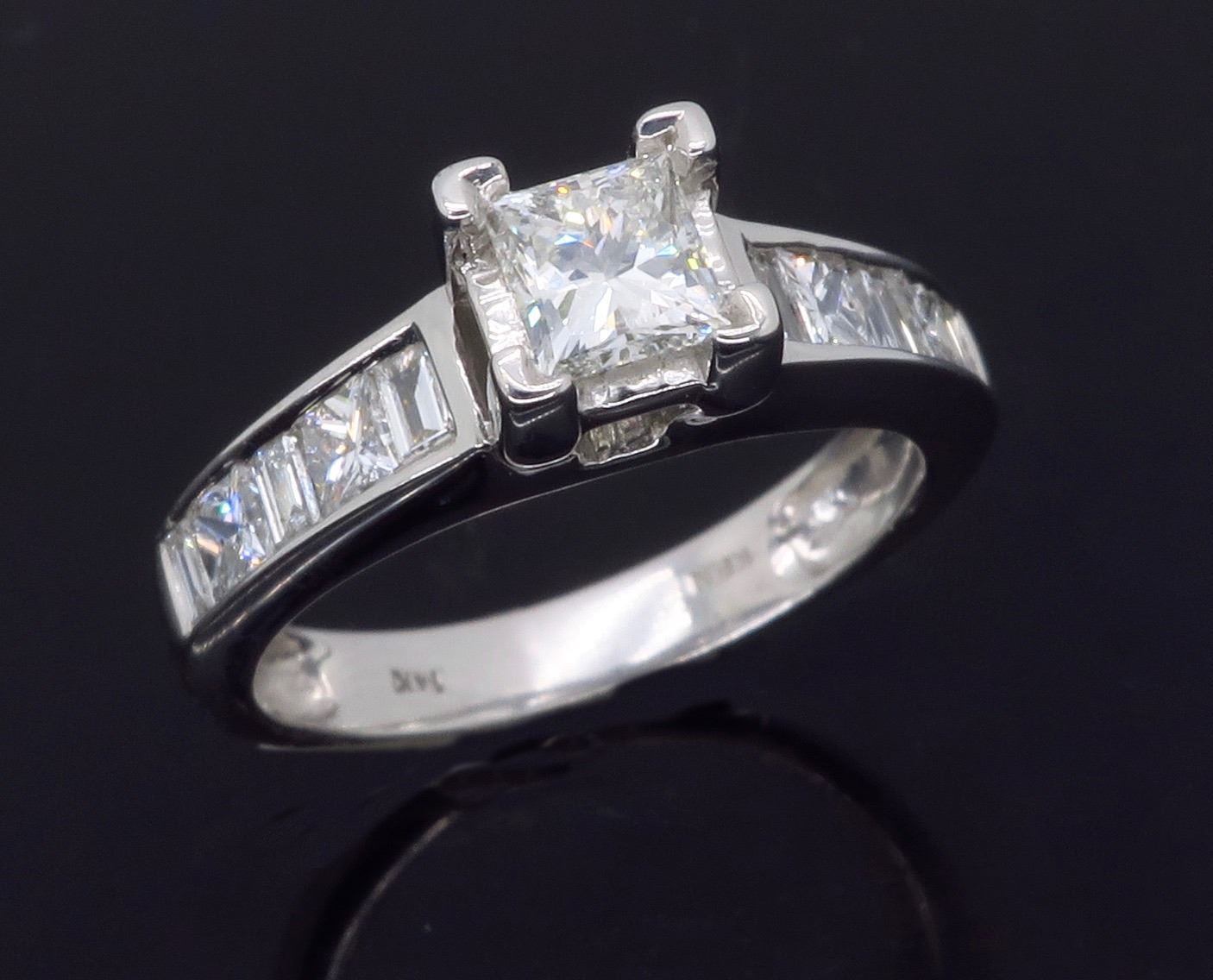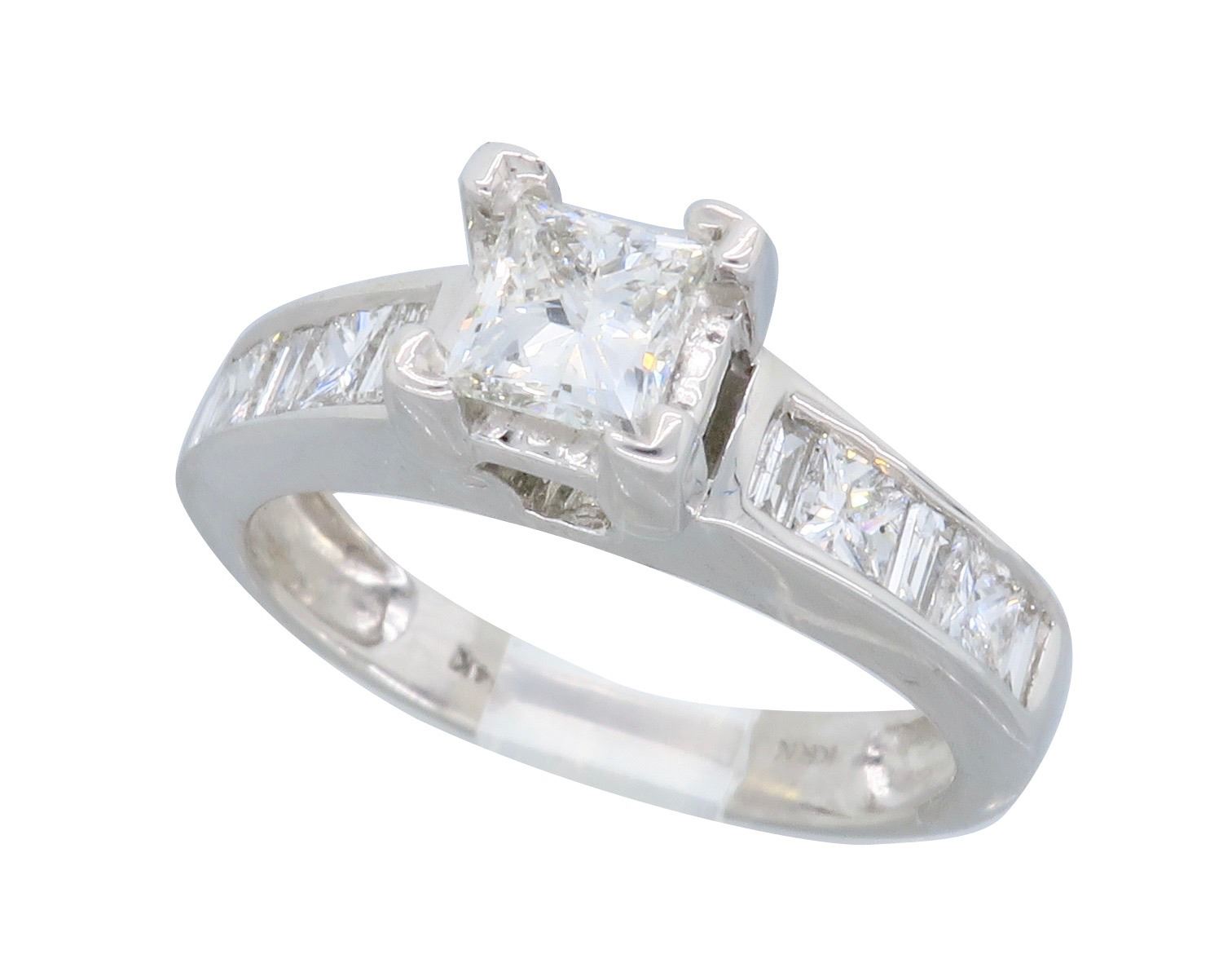 One 14KT White Gold 1.00ctw Diamond Ring. (1) Princess cut center Diamond with a total weight of 0.40cts with a color of G-H and clarity of SI-2. Side Diamonds with a total weight of 0.60cts. Total weight of this ring is 3.2 grams.