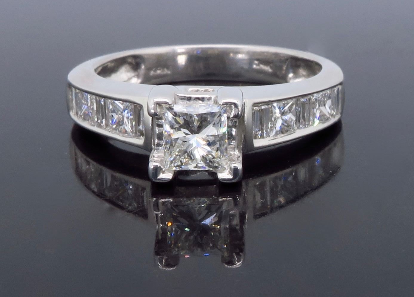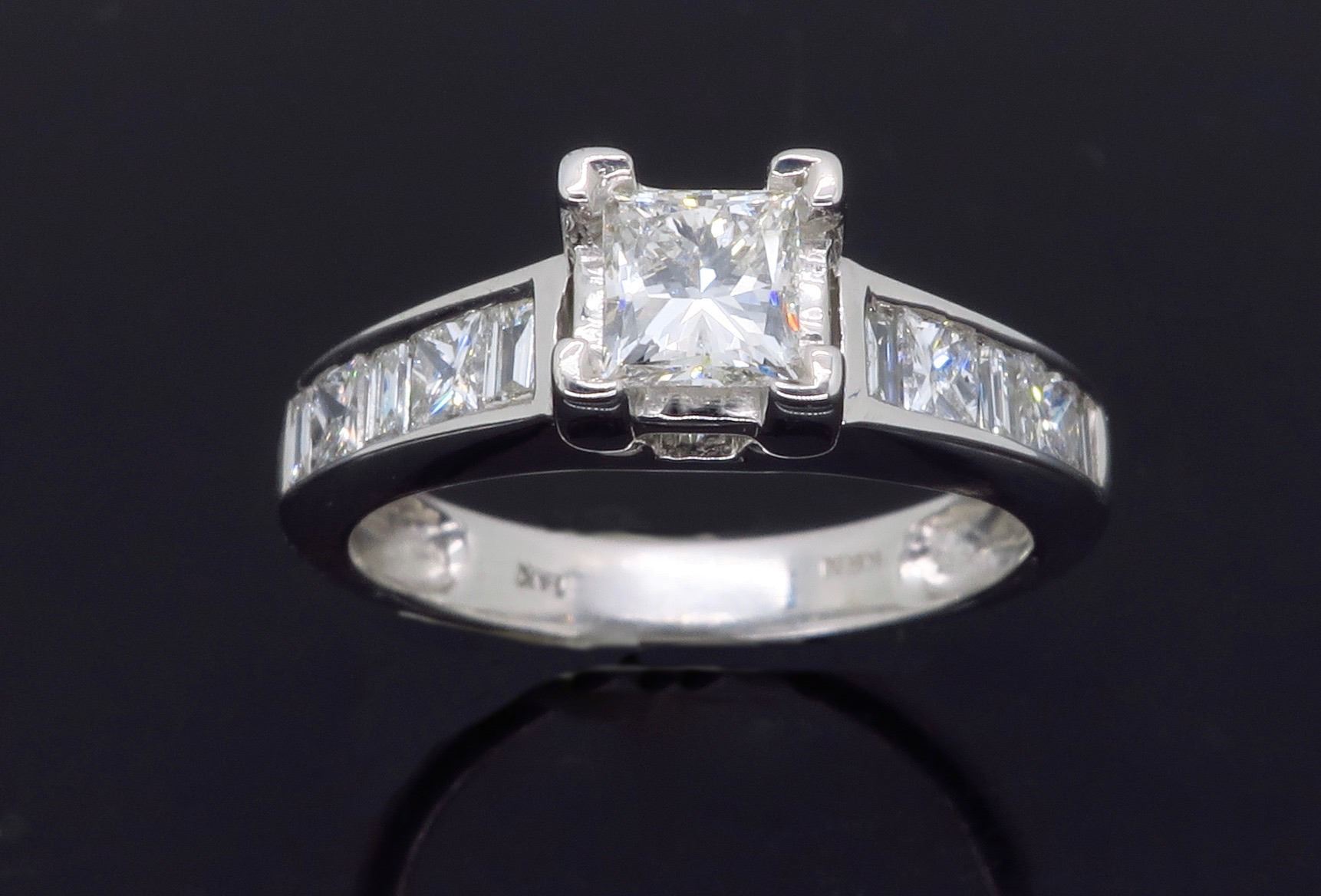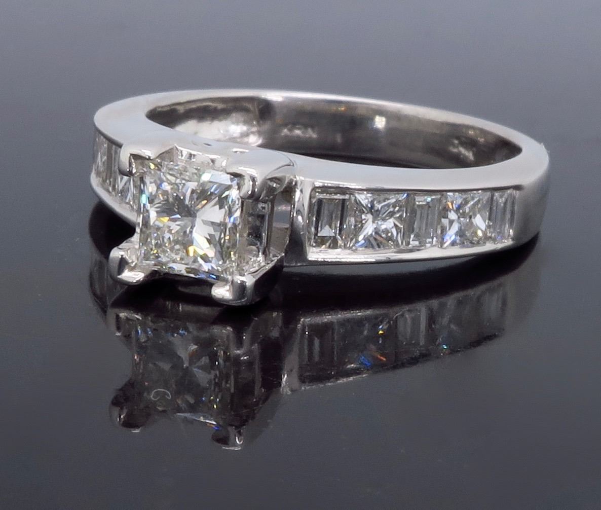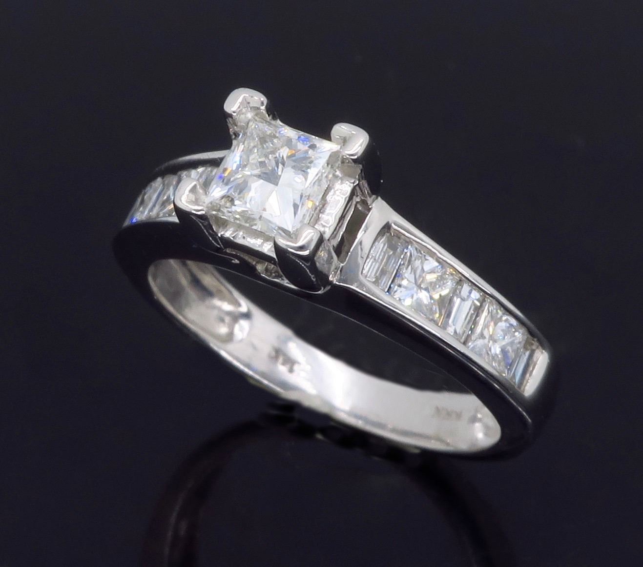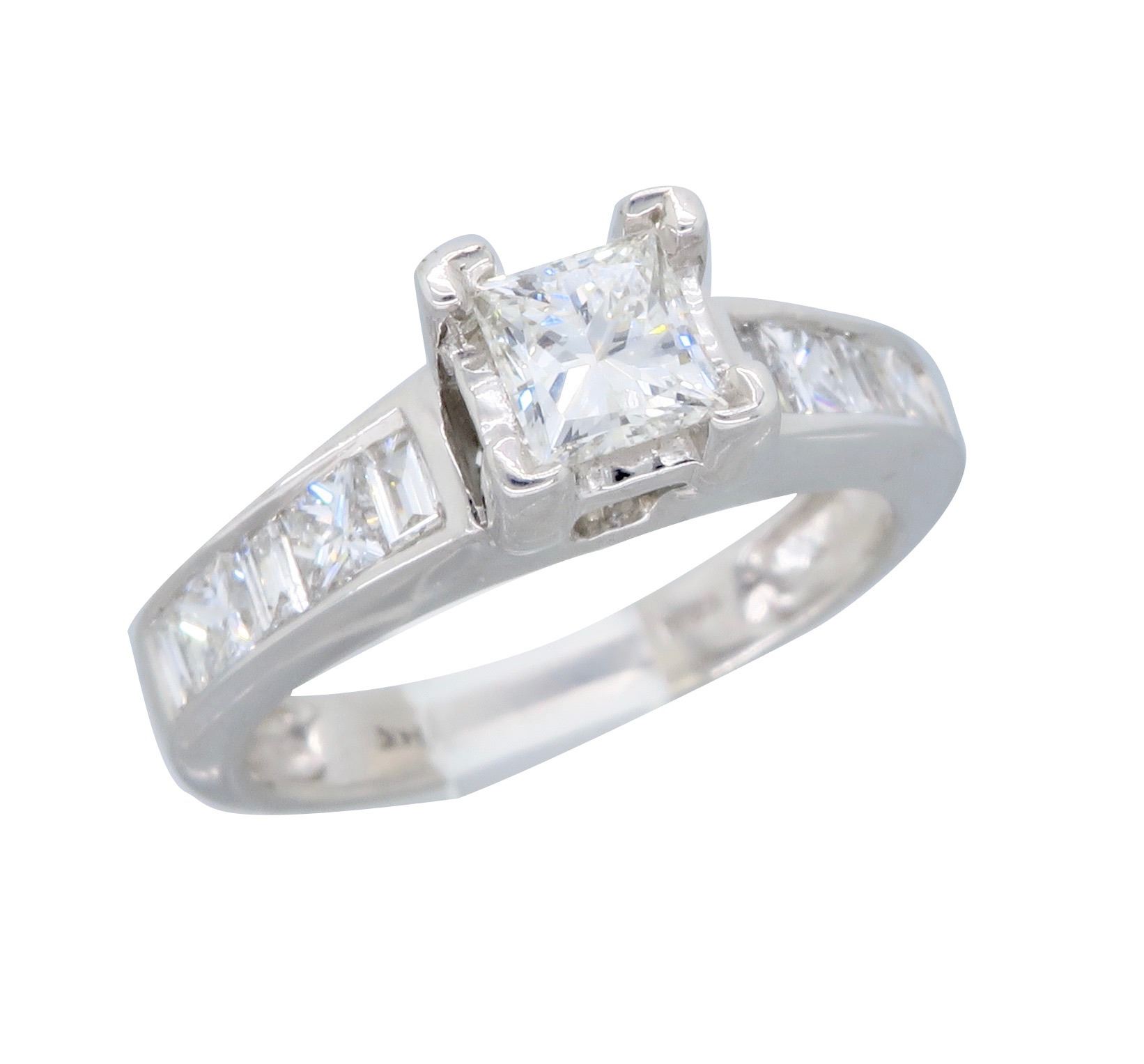 One 14KT White Gold 1.00ctw Diamond Ring. (1) Princess cut center Diamond with a total weight of 0.40cts with a color of G-H and clarity of SI-2. Side Diamonds with a total weight of 0.60cts. Total weight of this ring is 3.2 grams.
