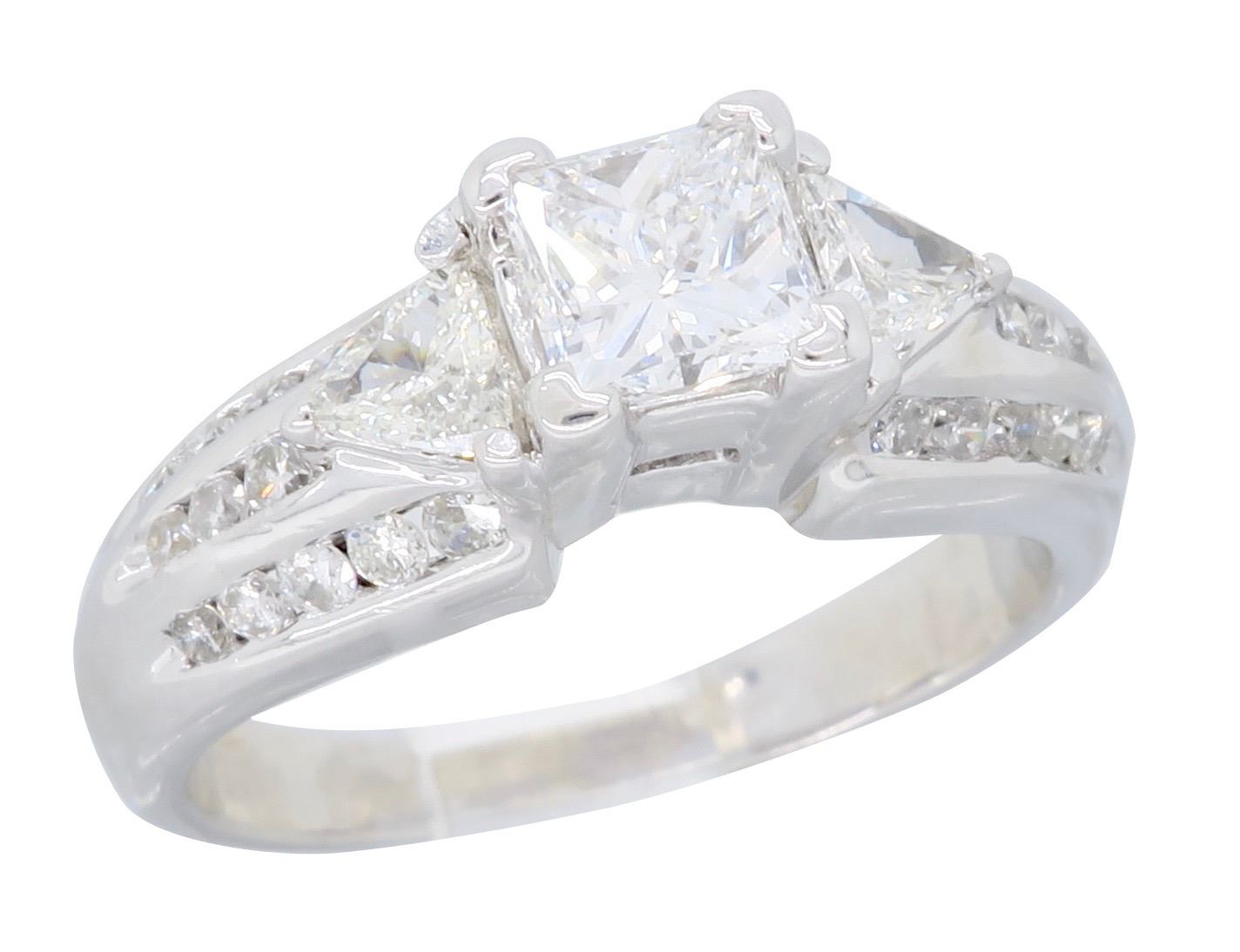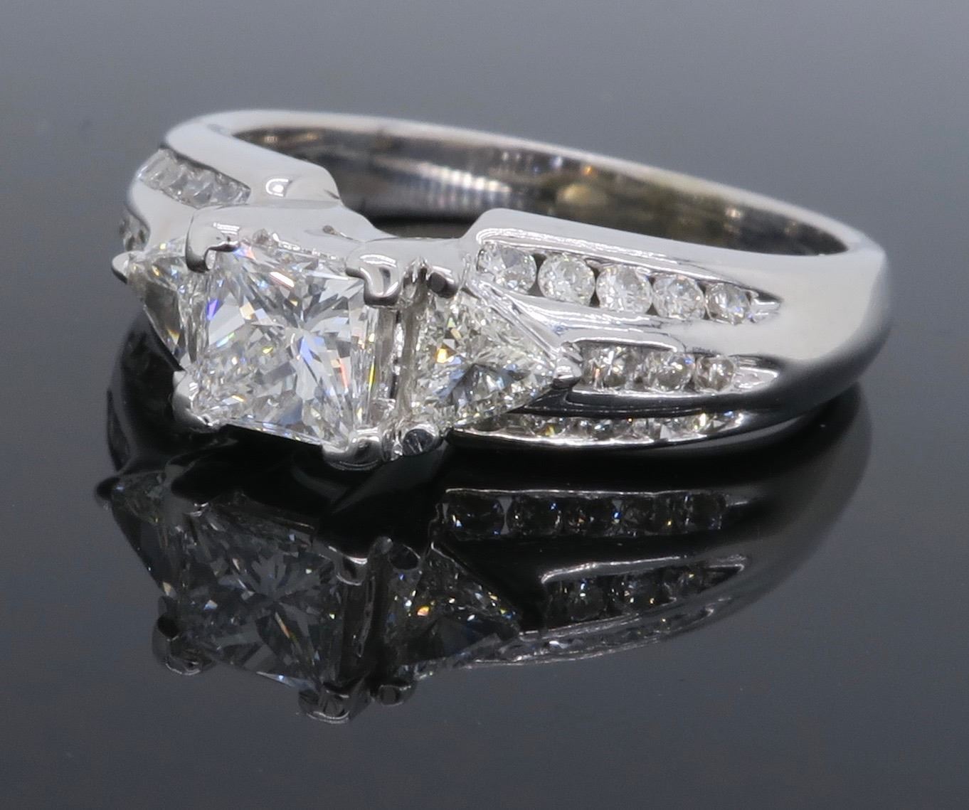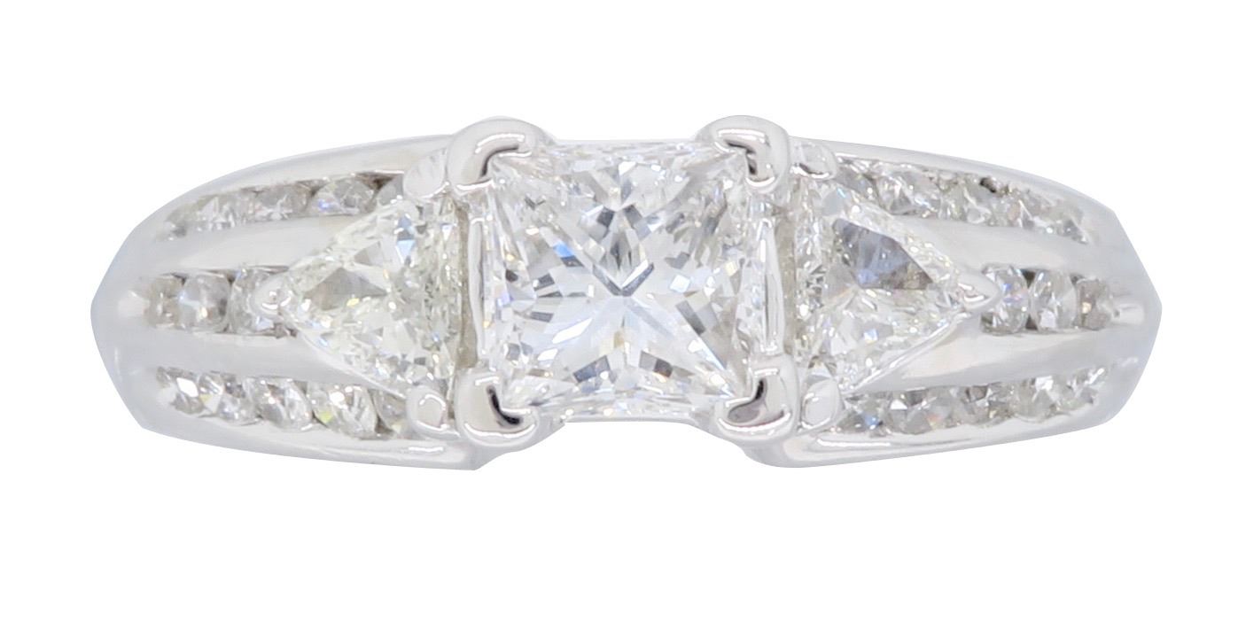 One 14KT White Gold 1.00ctw Diamond Ring. (1) Princess cut center Diamond with a total weight of 0.50cts with a color of F-G and clarity of VS-2. Side diamonds with a total weight of 0.50cts. Total weight of this ring is 5.0 grams.