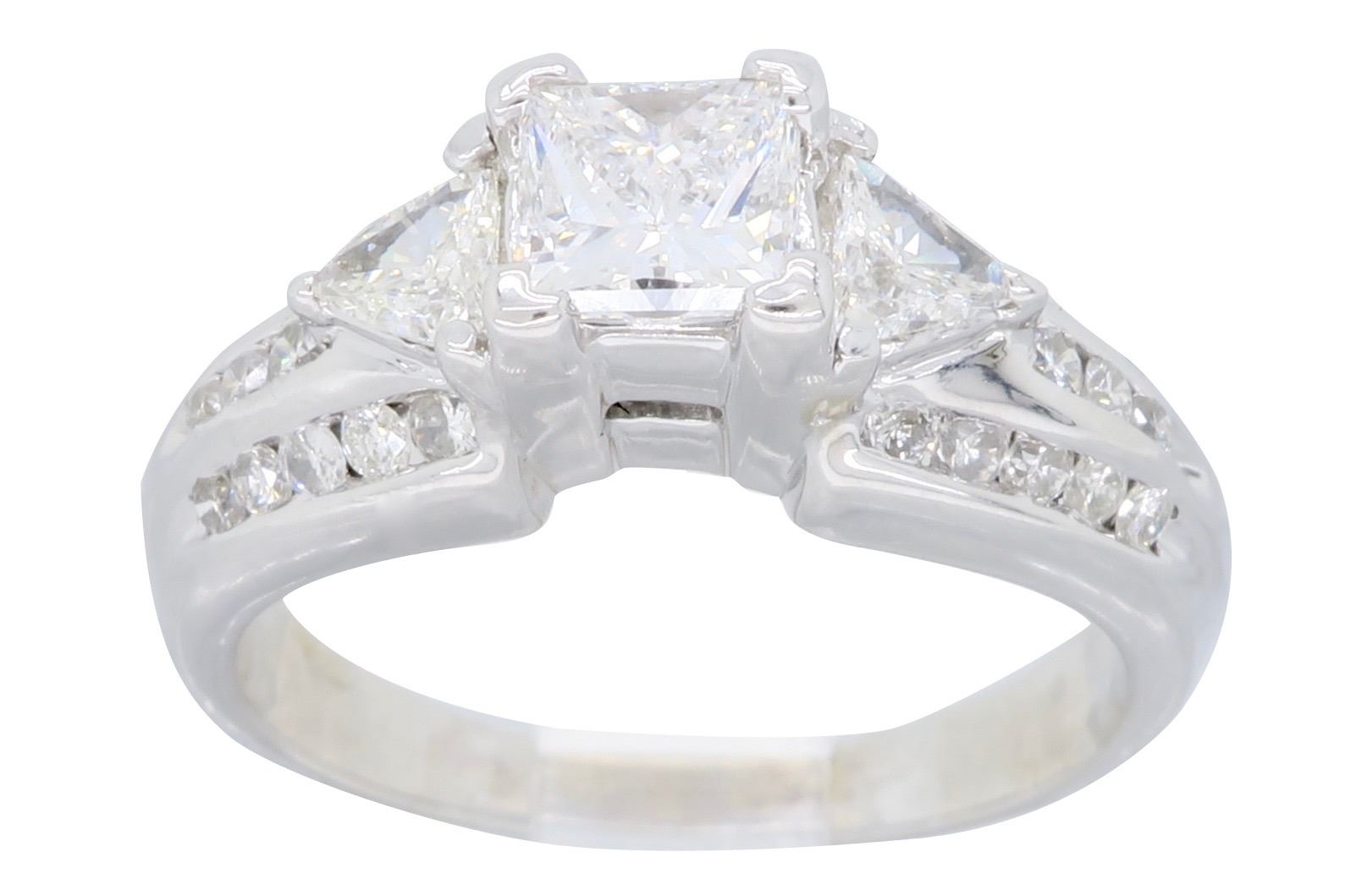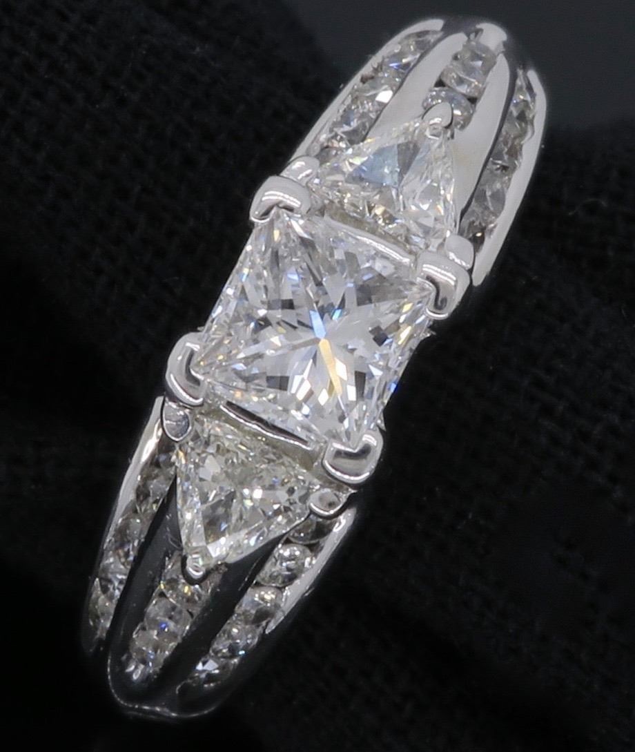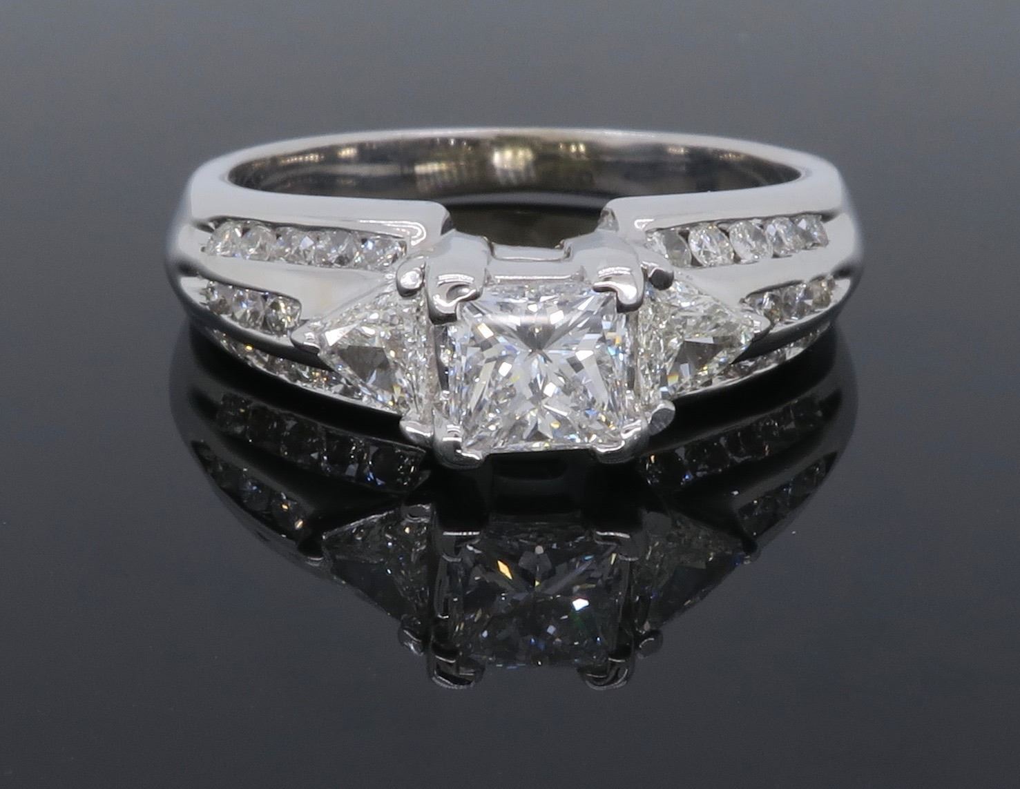 One 14KT White Gold 1.00ctw Diamond Ring. (1) Princess cut center Diamond with a total weight of 0.50cts with a color of F-G and clarity of VS-2. Side diamonds with a total weight of 0.50cts. Total weight of this ring is 5.0 grams.