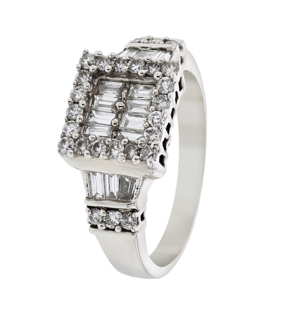 One 14KT White Gold 1.00ctw Diamond Ring. (14) Baguette Diamonds with a total weight of 0.55cts with a color of I and clarity of I-1. (26) Round Diamonds with a total weight of 0.45cts with a color of I and clarity of I-1. Total weight of this ring is 4.85 grams.