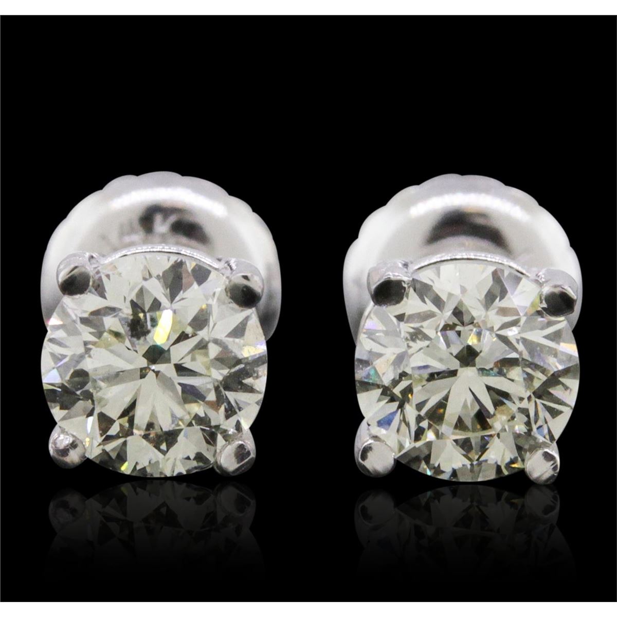 One pair electronically tested 14KT white gold cast & assembled diamond solitaire earrings with screw backs. Identified with markings of "14K". Condition is new, good workmanship. Containing: One prong set round brilliant cut diamond, measuring 4.90 - 4.90 x 3.25mm (depth est.), 3.00% GTCF approximate weight of 0.50ct with a strong blue fluorescence. Graded in the setting. Clarity: SI-2. Color: 66.3%. Table 57.1%. One prong set round brilliant cut diamond, measuring 4.90 - 4.90 x 3.20mm (depth est.), 4.00% GTCF approximate weight of 0.50ct with a medium blue fluorescence. Graded in the setting. Clarity: SI-2. Color: 65.3%. Table 52.0%. Total Weight of Diamonds 1.00ct. Total Weight of Earrings 1.01 grams. AIG Appraised at $3,980.00.