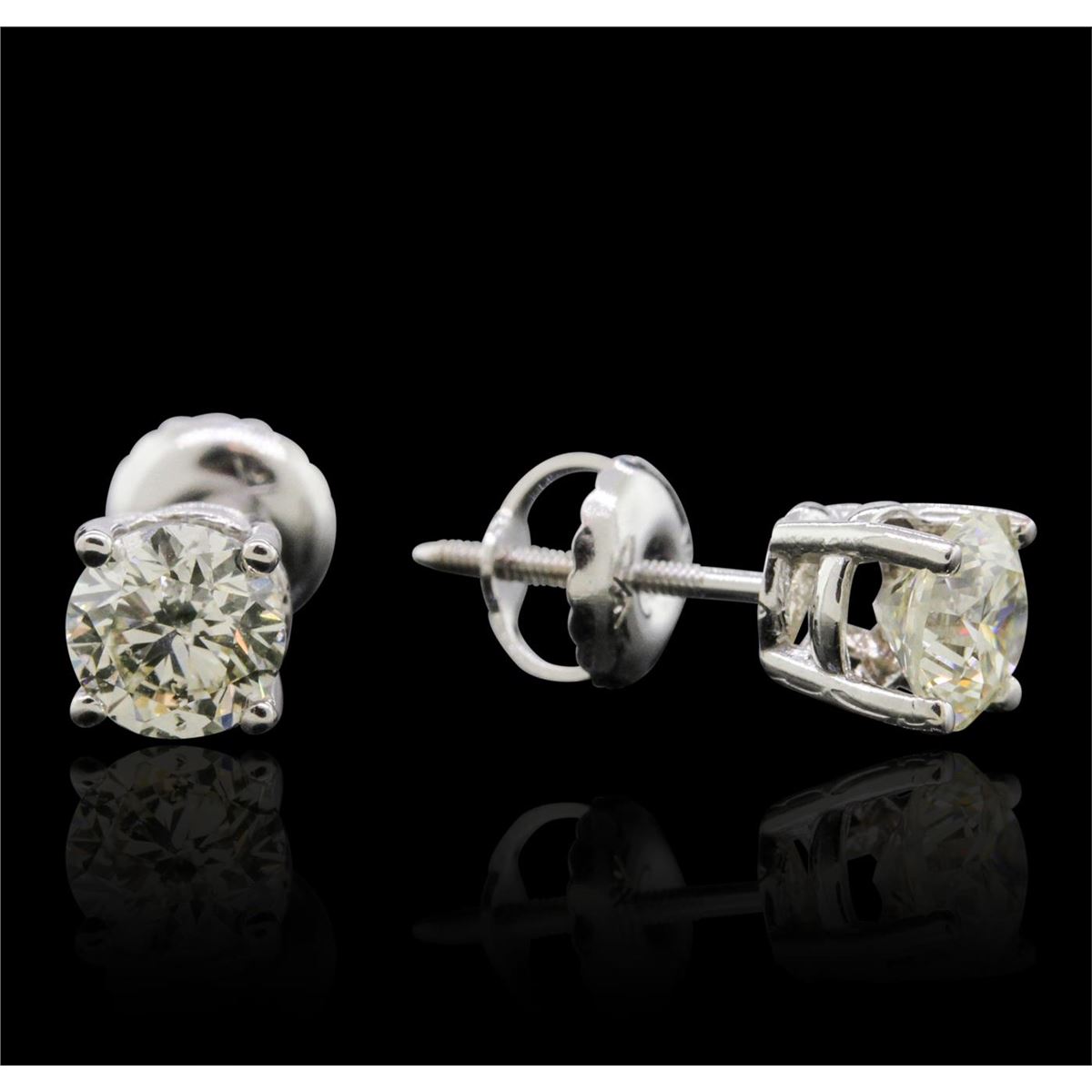 One pair electronically tested 14KT white gold cast & assembled diamond solitaire earrings with screw backs. Condition is new, good workmanship. Containing: One prong set round brilliant cut diamond, measuring 4.90 - 4.90 x 3.15mm (depth est.), 6.00% GTCF approximate weight of 0.50ct with a medium strong green blue fluorescence. Graded in the setting. Clarity: SI-2. Depth: 64.3%. Table 61.2%. One prong set round brilliant cut diamond, measuring 5.00 - 4.90 x 3.15mm (depth est.), 4.00% GTCF approximate weight of 0.50ct. Graded in the setting. Clarity: SI-2. Depth: 63.6%. Table 56.2%. Total Weight of Diamonds 1.00ct. Total Weight of Earrings 1.01 grams. AIG Appraised at $3,100.00.