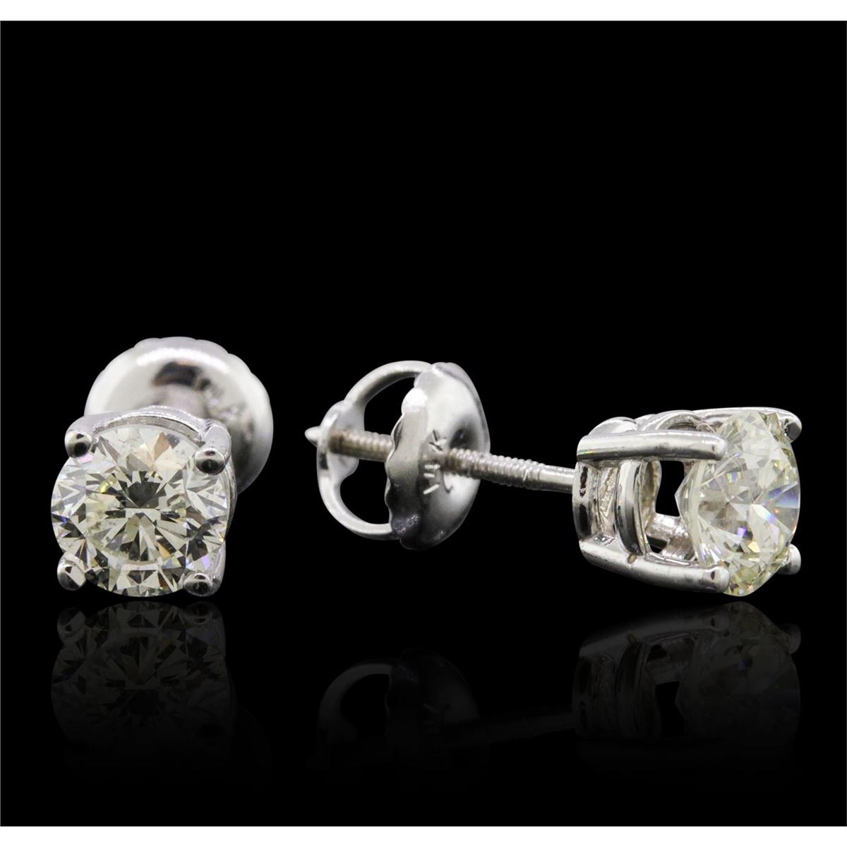 One pair electronically tested 14KT white gold cast & assembled diamond solitaire earrings with screw backs. Condition is new, good workmanship. Containing: One prong set round brilliant cut diamond, measuring 5.03 - 5.01 x 3.31mm (depth est.), 2.00% GTCF approximate weight of 0.52ct with a very strong blue fluorescence. Graded in the setting. Clarity: SI-2. Color: 65.9%. Table 53.4%. One prong set round brilliant cut diamond, measuring 4.83 - 4.80 x 3.01mm (depth est.), 10.00% GTCF approximate weight of 0.48ct with a very strong blue fluorescence. Graded in the setting. Clarity: SI-2. Color: K. Depth 62.5%. Table 61.2%. Total Weight of Diamonds 1.00ct. Total Weight of Earrings 1.00 grams. AIG Appraised at $4,200.00.