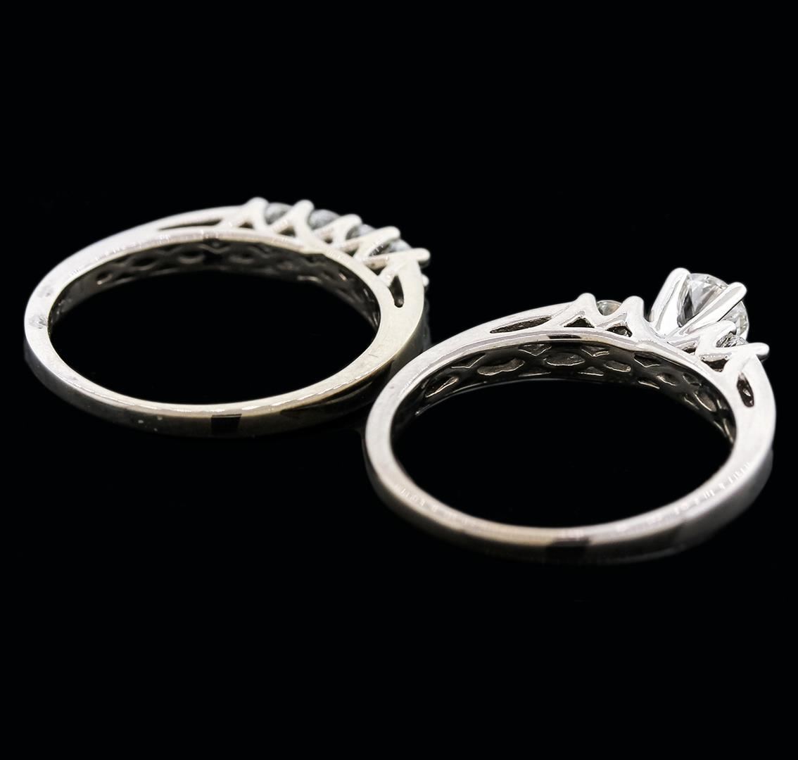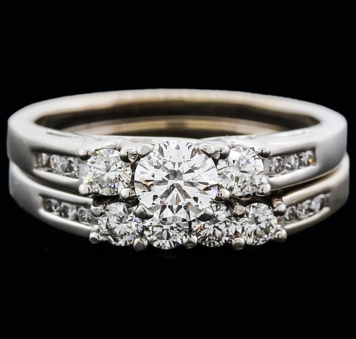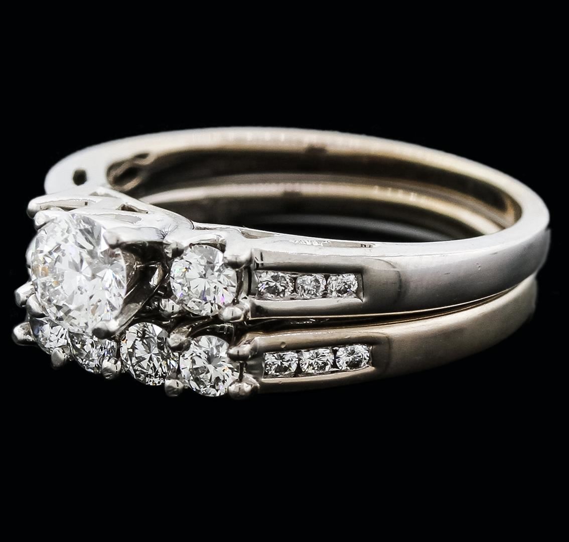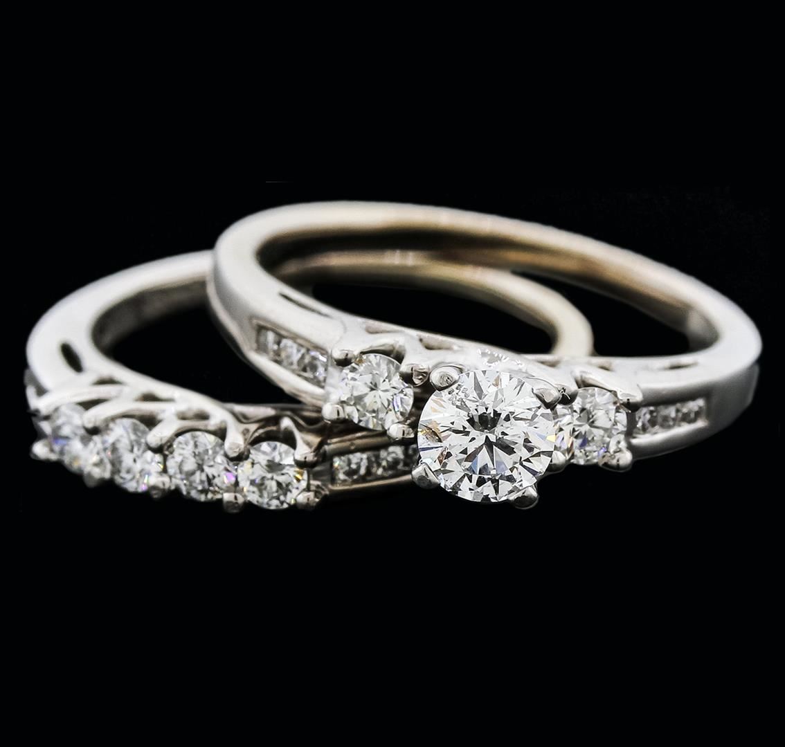 One wedding ring set featuring: 14KT white gold weighing 5.80 grams containing diamonds with a total weight of 1.00ct.