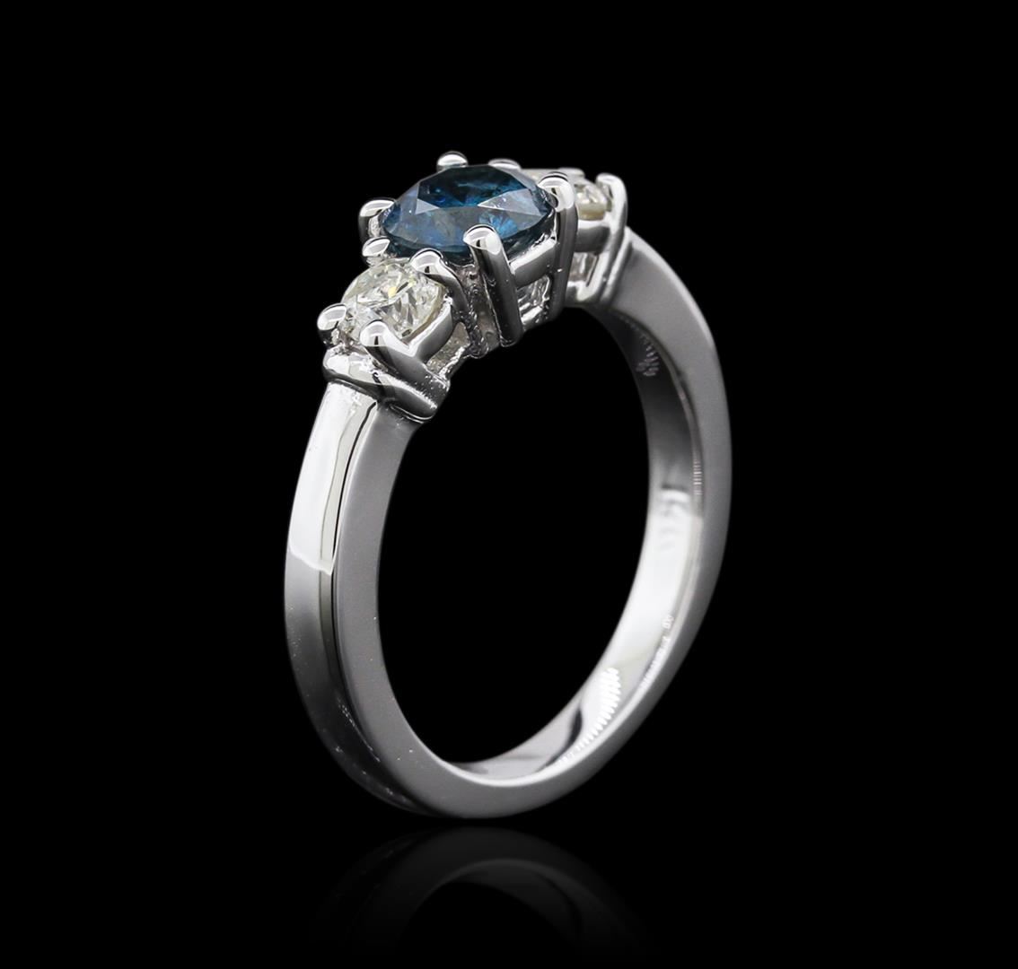 One ring featuring: 14KT white gold weighing 4.00 grams containing one blue diamond center stone with a total weight of 0.64ct and two side diamonds with a total weight of 0.37ct.