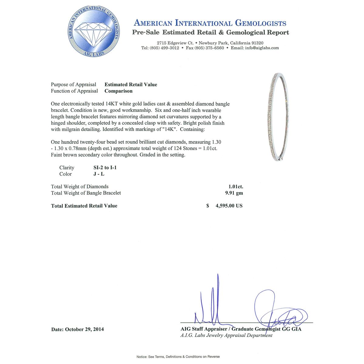 One electronically tested 14KT white gold ladies cast & assembled diamond bangle bracelet. Six and one-half inch wearable length bangle bracelet features mirroring diamond set curvatures supported by a hinged shoulder, completed by a concealed clasp with safety. Bright polish finish with milgrain detailing. Identified with markings of "14K". Condition is new, good workmanship. Containing: One Hundred Twenty-Four bead set round brilliant cut diamonds, measuring 1.30 - 1.30 x 0.78mm (depth est.) approximate total weight of 124 Stones = 1.01ct. Faint brown secondary color throughout. Graded in the setting. Clarity: SI-2 to I-1. Color: J - L. Total Weight of Diamonds 1.01ct. Total Weight of Bangle Bracelet 9.91 grams. AIG Appraised at $4,595.00.