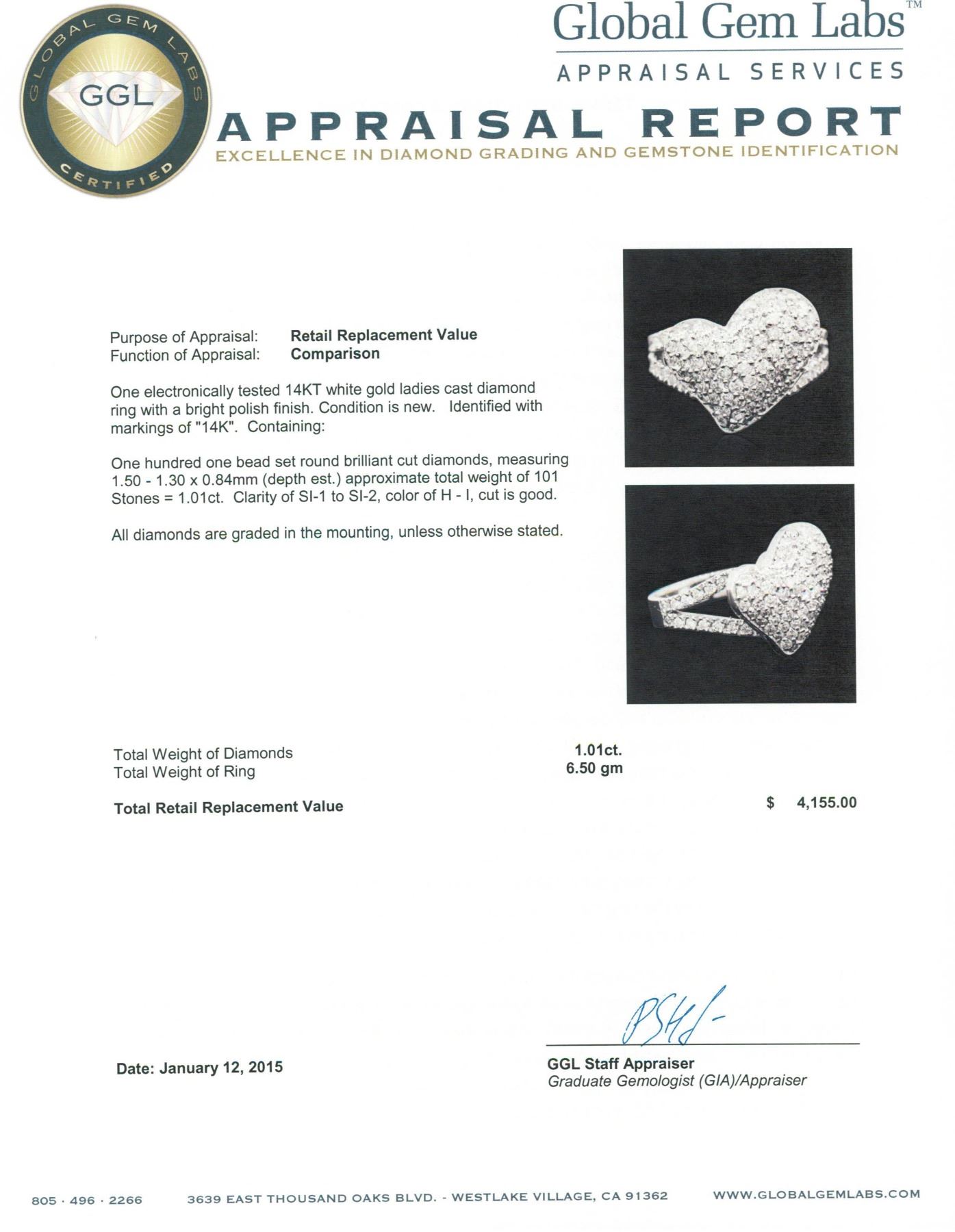 One electronically tested 14KT white gold ladies cast diamond ring with a bright polish finish. Identified with markings of "14K". Condition is new. Containing: One Hundred One bead set round brilliant cut diamonds, measuring 1.50 - 1.30 x 0.84mm (depth est.) approximate total weight of 101 Stones = 1.01ct. Clarity: SI-1 to SI-2. Color: H - I, Cut is Good. All diamonds are graded in the mounting, unless otherwise stated. Total Weight of Diamonds 1.01ct. Total Weight of Ring 6.50 grams. GGL Appraised.