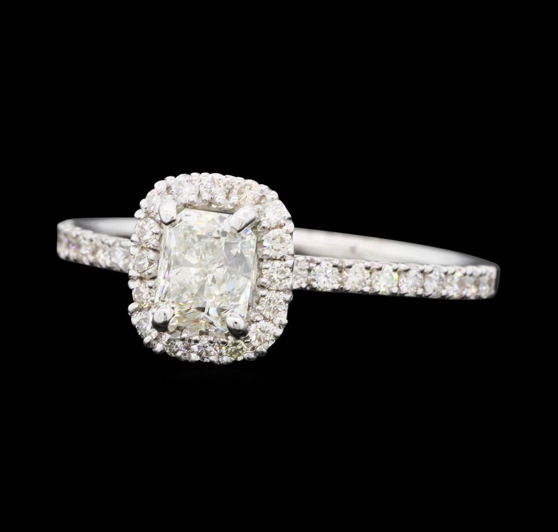 One electronically tested 14KT white gold lady's cast wedding ring with a halo with a bright polish finish. The featured lady's ring has a shank measuring 1.52 millimeters wide. Identified with markings of "14K". Condition is new, good workmanship. Containing: One prong set radiant shaped cut diamond, measuring 5.15 x 4.26 x 3.78mm (depth est.) approximate weight of 0.71ct. Graded in the setting. Color J-K, Clarity VS-1, Cut Very Good. Thirty-Four prong set round brilliant cut diamonds, measuring 1.40 - 1.30 x 0.81mm (depth est.) approximate total weight of 34 Stones = 0.30ct. Graded in the setting. Color H-I, Clarity SI-1 - SI-2, Cut is Good. Total Weight of Diamonds = 1.01ctw. Total Weight of Ring 1.90gm. GAS Appraised at $6,110.00.