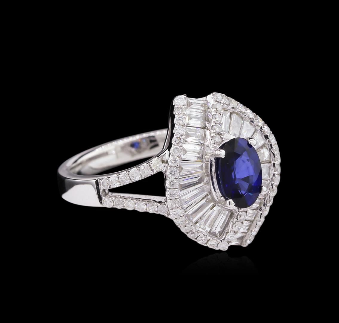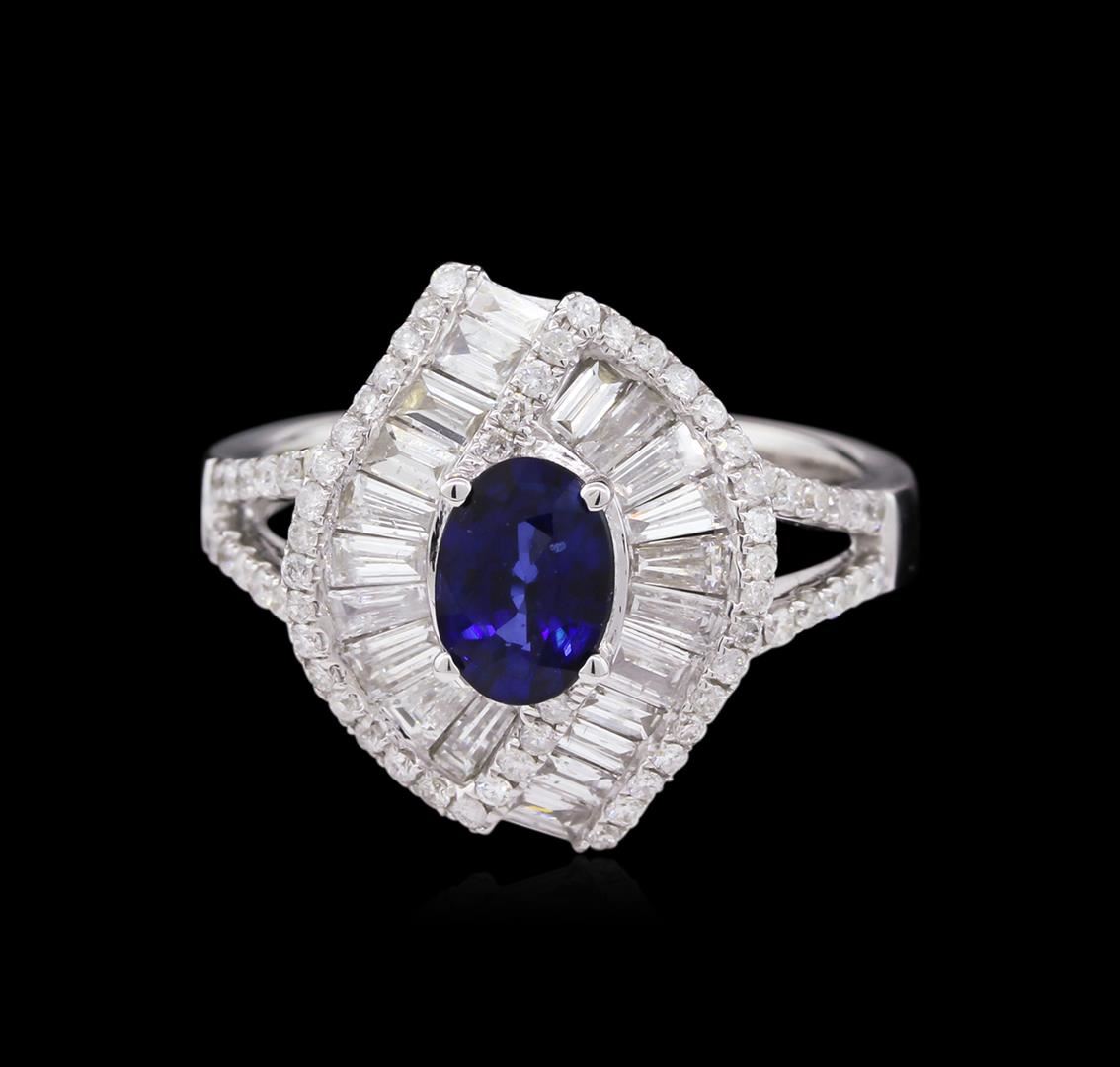 One electronically tested 14KT white gold ladies cast sapphire and diamond ring with a bright polish finish. Condition is new, good workmanship. The featured sapphire is set within a wrap around diamond bezel, supported by diamond set split shoulders and completed by a three millimeter wide band. Identified with markings of "14K". Containing: One prong set oval mixed cut natural blue sapphire, measuring 6.90 x 5.00 x 3.00mm, 6%. bulge factor, approximate weight of 1.01ct., clarity is eye clean, type II, medium dark, moderately strong, violetish blue color, (GIA vB 6/4), cut is good. Transmitting light with no distortion, transparent. Indications of laboratory high temperature diffusion treatment. Graded in the setting. Sixty-Eight prong set round brilliant cut diamonds, measuring 1.10 - 1.00 x 0.63mm (depth est.) approximate. Total Weight of 68 Stones = 0.38ct. Graded in the setting. Clarity: I-1 to I-2. Color: F - H Twenty-One channel set baguette cut diamonds, measuring from 2.40 x 1.20 x 0.84mm (depth est.) to 3.20 x 1.70 x 1.19mm (depth est.) approximate. Total Weight of 21 Stones = 0.79ct. Graded in the setting. Clarity: SI-1 to SI-2. Color: G - I. Total Weight of Colored Stones 1.01ct. Total Weight of Diamonds 1.17ct. Total Weight of Ring 5.80grams. AIG Appraised at $5,125.00.