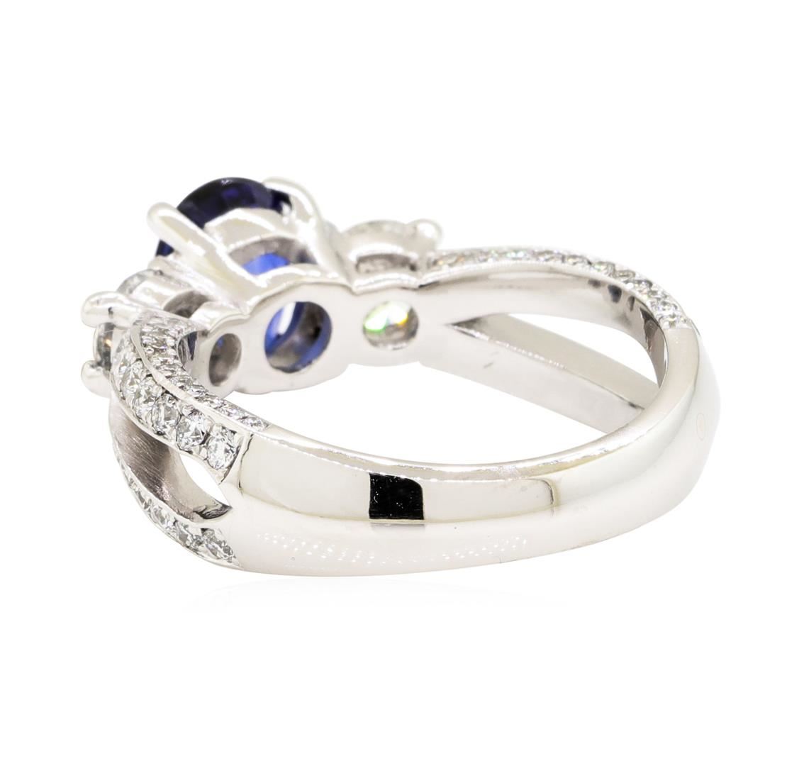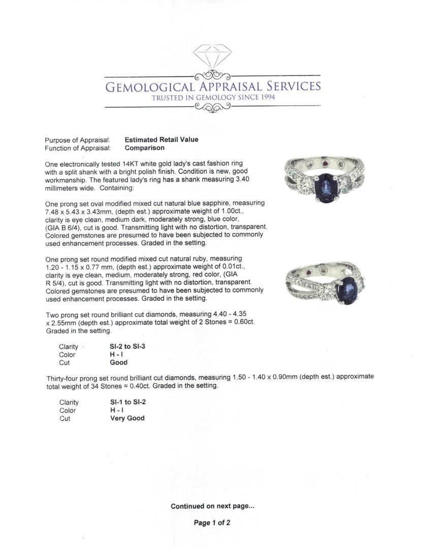 One electronically tested 14KT white gold lady's cast fashion ring with a split shank with a bright polish finish. The featured lady's ring has a shank measuring 3.40 millimeters wide. Condition is new, good workmanship. Containing: One prong set oval modified mixed cut natural blue sapphire, measuring 7.48 x 5.43 x 3.43mm, (depth est.) approximate weight of 1.00ct., clarity is eye clean, medium dark, moderately strong, blue color, (GIA B 6/4), cut is good. Transmitting light with no distortion, transparent. Colored gemstones are presumed to have been subjected to commonly used enhancement processes. Graded in the setting. One prong set round modified mixed cut natural ruby, measuring 1.20 - 1.15 x 0.77 mm, (depth est.) approximate weight of 0.01ct., clarity is eye clean, medium, moderately strong, red color, (GIA R 5/4), cut is good. Transmitting light with no distortion, transparent. Colored gemstones are presumed to have been subjected to commonly used enhancement processes. Graded in the setting. Two prong set round brilliant cut diamonds, measuring 4.40 - 4.35 x 2.55mm (depth est.) approximate total weight of 2 Stones = 0.60ct. Graded in the setting. Color H - I Clarity SI-2 to SI-3 Cut Good Thirty-Four prong set round brilliant cut diamonds, measuring 1.50 - 1.40 x 0.90mm (depth est.) approximate total weight of 34 Stones = 0.40ct. Graded in the setting. Color H - I Clarity SI-1 to SI-2 Cut Very Good Forty-Four prong set round brilliant cut diamonds, measuring 1.10 - 0.80 x 0.59mm (depth est.) approximate total weight of 44 Stones = 0.22ct. Graded in the setting. Color H - I Clarity VS-2 to SI-1 Cut Very Good. Total Weight of Colored Stones 1.01ct.. Total Weight of Diamonds 1.22ct.. Total Weight of Ring 7.10gm. GAS Appraised.