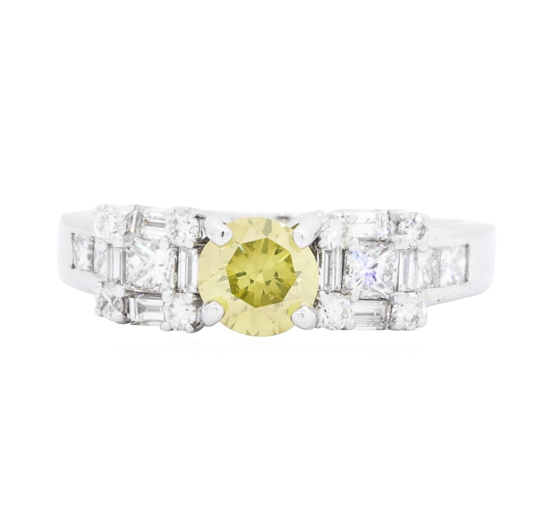 One electronically tested 14KT white gold Ladies cast wedding ring with a bright polish finish. The featured Ladies ring has a shank measuring 2.30 millimeters wide. Condition is like new, good workmanship. Containing: One prong set round brilliant cut treated diamond, measuring 6.10 - 6.02 x 4.00mm (depth est.) , 10.00.%. GTCF approximate weight of 1.01ct. Colored gemstones are presumed to have been subjected to commonly used enhancement processes. Graded in the setting. Color Fancy Orangy Brownish Yellow Clarity SI-1 Cut Fair Six channel set princess cut diamonds, measuring 2.50 x 2.10 x 1.58mm (depth est.) approximate total weight of 6 Stones = 0.42ct. Graded in the setting. Color G - H Clarity VS-1 to VS-2 Cut Very Good Eight prong set baguette cut diamonds, measuring from 2.20 x 1.50 x 1.28mm (depth est.) to 2.30 x 1.60 x 1.36mm (depth est.) approximate total weight of 8 Stones = 0.34ct. Graded in the setting. Color G - H Clarity VS-2 to SI-1 Cut Very Good Eight prong set round brilliant cut diamonds, measuring 2.00 - 1.95 x 1.23mm (depth est.) approximate total weight of 8 Stones = 0.24ct. Graded in the setting. Color G - H Clarity VS-2 to SI-1 Cut Good. Total Weight of Diamonds 2.01ct. Total Weight of Ring 5.90gm. GAS Appraised.