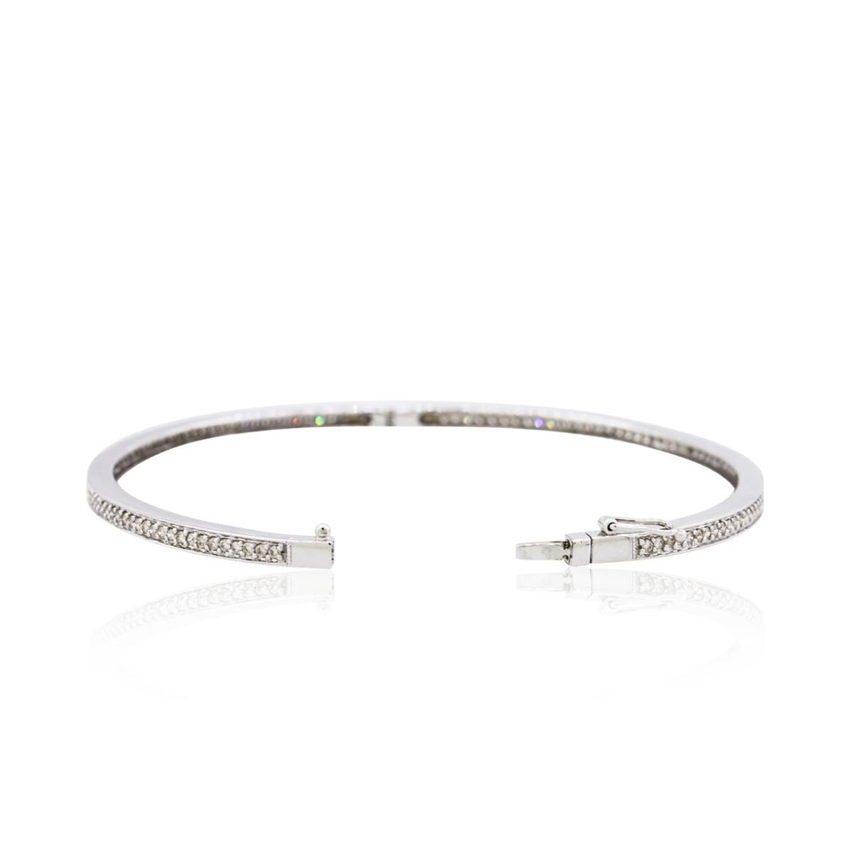 One electronically tested 14KT white gold ladies cast & assembled diamond bangle bracelet. Six and one-half inch wearable length bangle bracelet features mirroring diamond set curvatures supported by a hinged shoulder, completed by a concealed clasp with safety. Bright polish finish with milgrain detailing. Identified with markings of "14K". Condition is new, good workmanship. Containing: One Hundred Twenty-Four bead set round brilliant cut diamonds, measuring 1.30 - 1.30 x 0.78mm (depth est.) approximate total weight of 124 Stones = 1.01ct. Faint brown secondary color throughout. Graded in the setting. Clarity: SI-2 to I-1. Color: J - L. Total Weight of Diamonds 1.01ct. Total Weight of Bangle Bracelet 9.91 grams. AIG Appraised at $4,595.00.