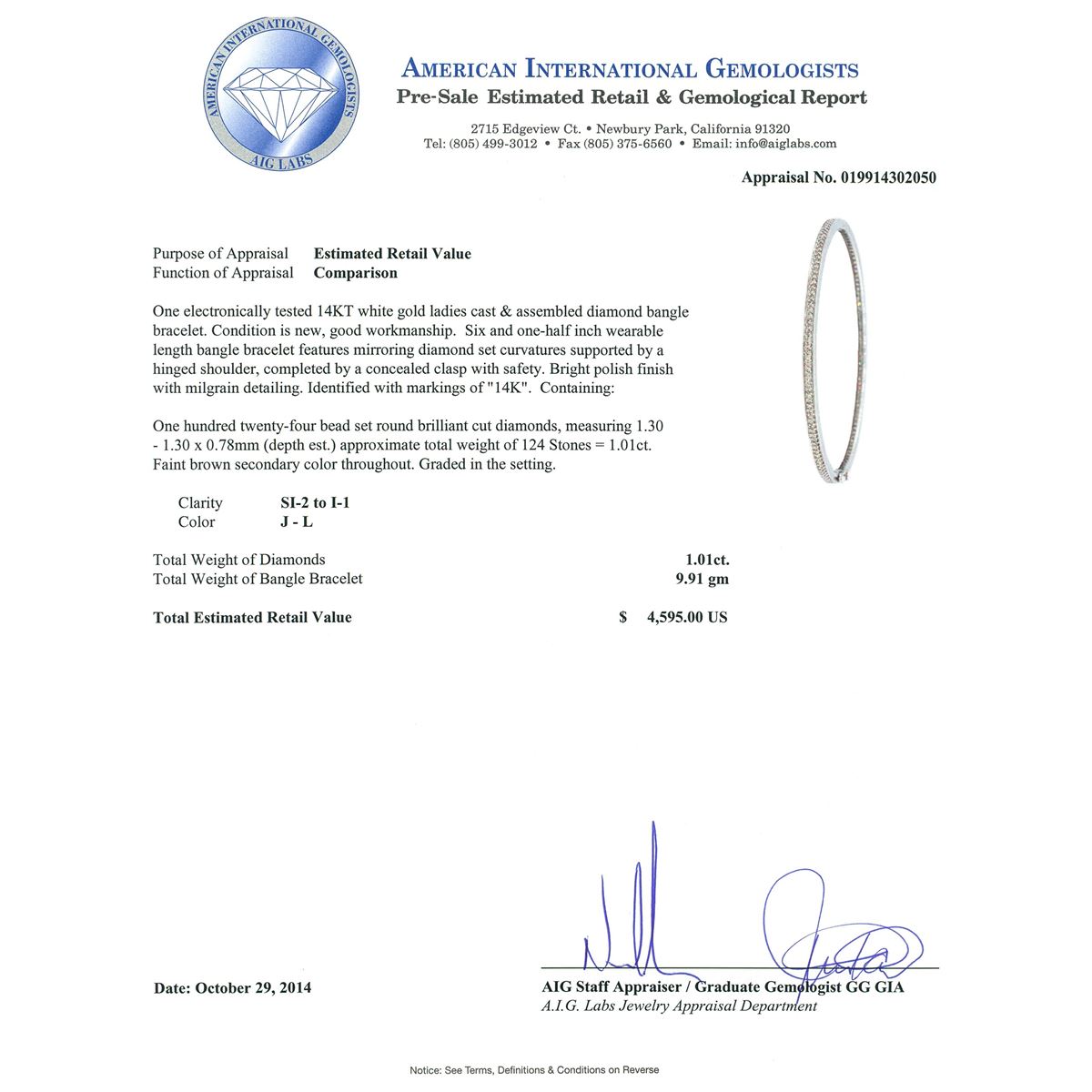 One electronically tested 14KT white gold ladies cast & assembled diamond bangle bracelet. Six and one-half inch wearable length bangle bracelet features mirroring diamond set curvatures supported by a hinged shoulder, completed by a concealed clasp with safety. Bright polish finish with milgrain detailing. Identified with markings of "14K". Condition is new, good workmanship. Containing: One Hundred Twenty-Four bead set round brilliant cut diamonds, measuring 1.30 - 1.30 x 0.78mm (depth est.) approximate total weight of 124 Stones = 1.01ct. Faint brown secondary color throughout. Graded in the setting. Clarity: SI-2 to I-1. Color: J - L. Total Weight of Diamonds 1.01ct. Total Weight of Bangle Bracelet 9.91 grams. AIG Appraised at $4,595.00.