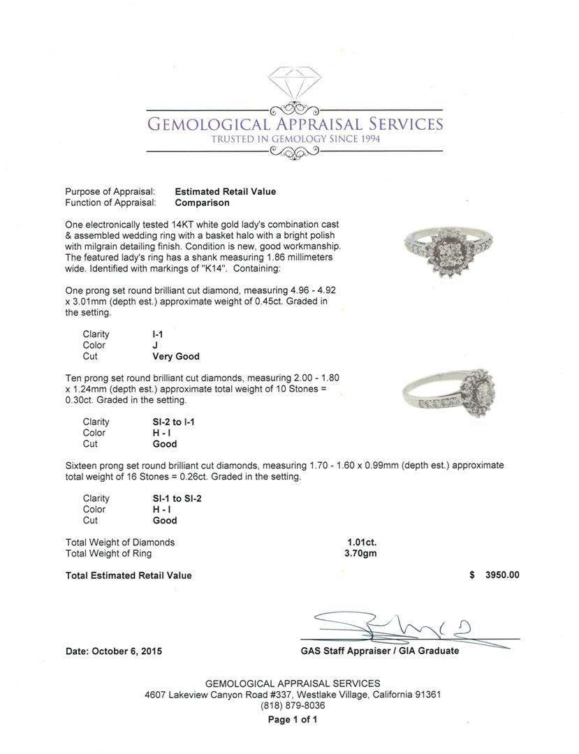 One electronically tested 14KT white gold lady's combination cast & assembled wedding ring with a basket halo with a bright polish with milgrain detailing finish. The featured lady's ring has a shank measuring 1.86 millimeters wide. Identified with markings of "K14". Condition is new, good workmanship. Containing: One prong set round brilliant cut diamond, measuring 4.96 - 4.92 x 3.01mm (depth est.) approximate weight of 0.45ct. Graded in the setting. Clarity: I-1. Color: Very Good Ten prong set round brilliant cut diamonds, measuring 2.00 - 1.80 x 1.24mm (depth est.) approximate total weight of 10 Stones = 0.30ct. Graded in the setting. Clarity: SI-2 to I-1. Color: H - I. Cut Good Sixteen prong set round brilliant cut diamonds, measuring 1.70 - 1.60 x 0.99mm (depth est.) approximate total weight of 16 Stones = 0.26ct. Graded in the setting. Clarity: SI-1 to SI-2. Color: H - I. Cut Good. Total Weight of Diamonds 1.01ct. Total Weight of Ring 3.70gm. GAS Appraised at $3,950.00.