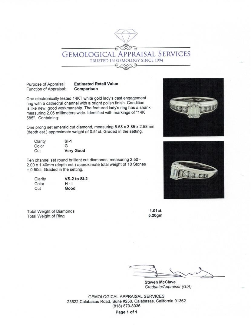One electronically tested 14KT white gold lady's cast engagement ring with a cathedral channel with a bright polish finish. The featured lady's ring has a shank measuring 2.06 millimeters wide. Identified with markings of "14K 585". Condition is like new, good workmanship. Containing: One prong set emerald cut diamond, measuring 5.58 x 3.85 x 2.58mm (depth est.) approximate weight of 0.51ct. Graded in the setting. Clarity: SI-1. Color: G Cut Very Good Ten channel set round brilliant cut diamonds, measuring 2.50 - 2.00 x 1.40mm (depth est.) approximate total weight of 10 Stones = 0.50ct. Graded in the setting. Clarity: VS-2 to SI-2. Color: H - ICut Good. Total Weight of Diamonds 1.01ct. Total Weight of Ring 5.20gm. GAS Appraised.