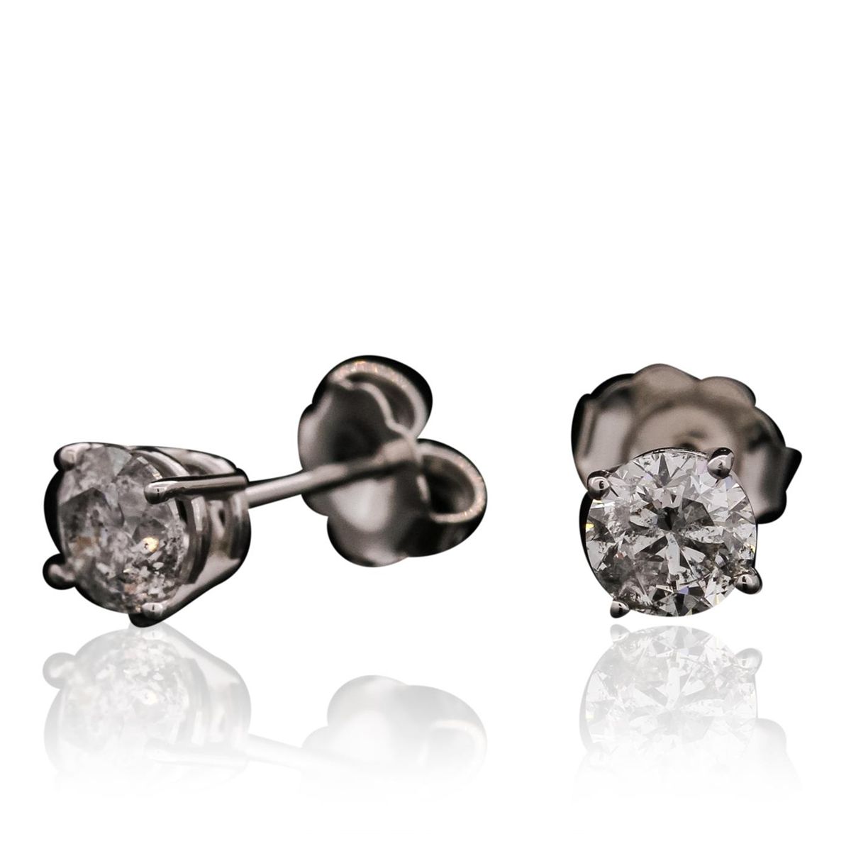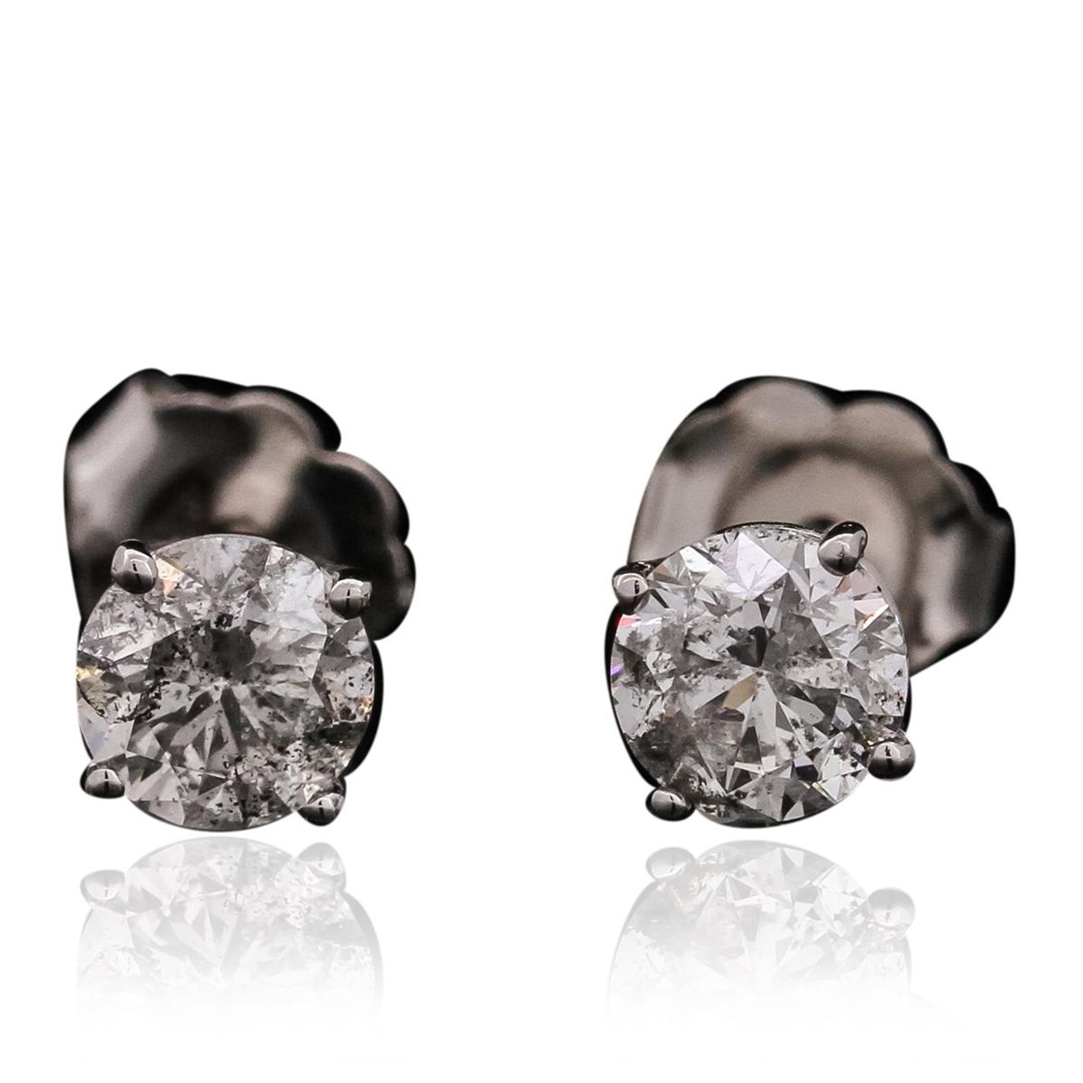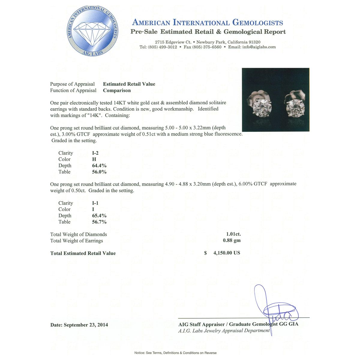 One pair electronically tested 14KT white gold cast & assembled diamond solitaire earrings with standard backs. Identified with markings of "14K". Condition is new, good workmanship. Containing: One prong set round brilliant cut diamond, measuring 5.00 - 5.00 x 3.22mm (depth est.), 3.00% GTCF approximate weight of 0.51ct with a medium strong blue fluorescence. Graded in the setting. Clarity: I-2. Color: 64.4%. Table 56.0%. One prong set round brilliant cut diamond, measuring 4.90 - 4.88 x 3.20mm (depth est.), 6.00% GTCF approximate weight of 0.50ct. Graded in the setting. Clarity: I-1. Color: I. Depth 65.4%. Table 56.7%. Total Weight of Diamonds 1.01ct. Total Weight of Earrings 0.88 grams. AIG Appraised at $4,150.00.