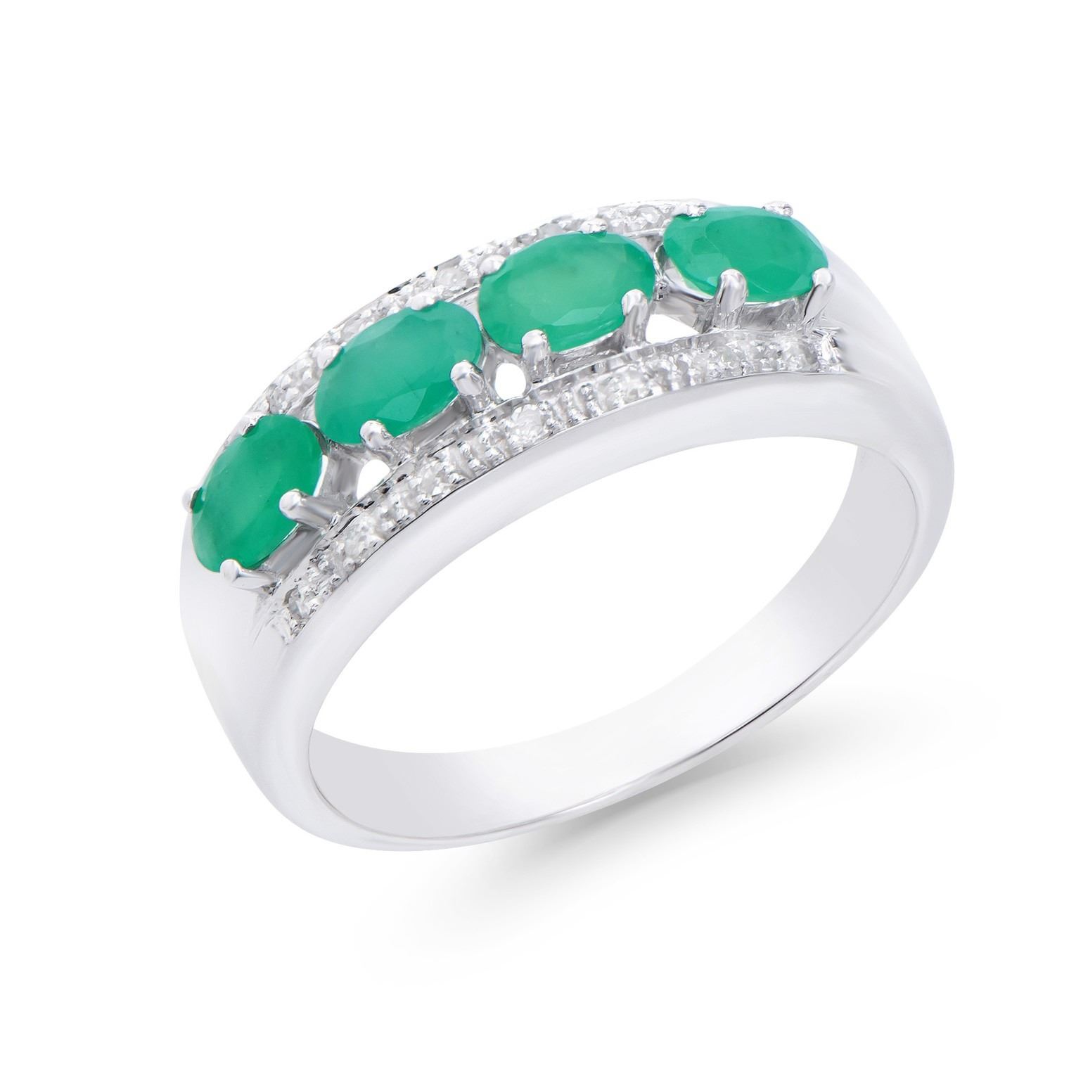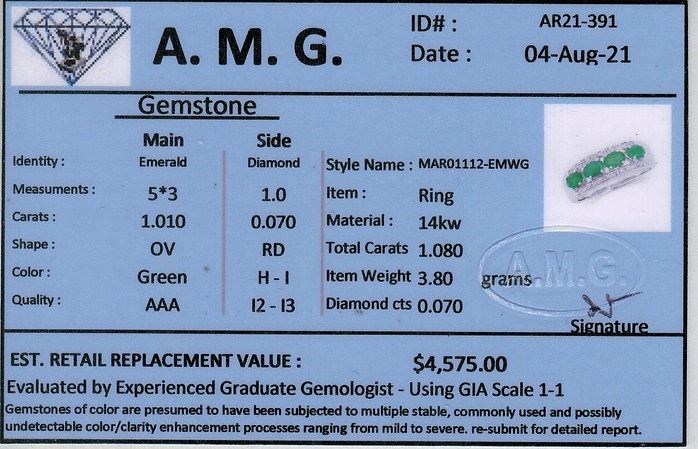 (4) Emeralds with a total weight of 1.01cts. (14) round Diamonds with a total weight of 0.07cts with a color of H-I and clarity of I2-I3. Total weight of the ring is 3.80 grams. Ring size 7.5.