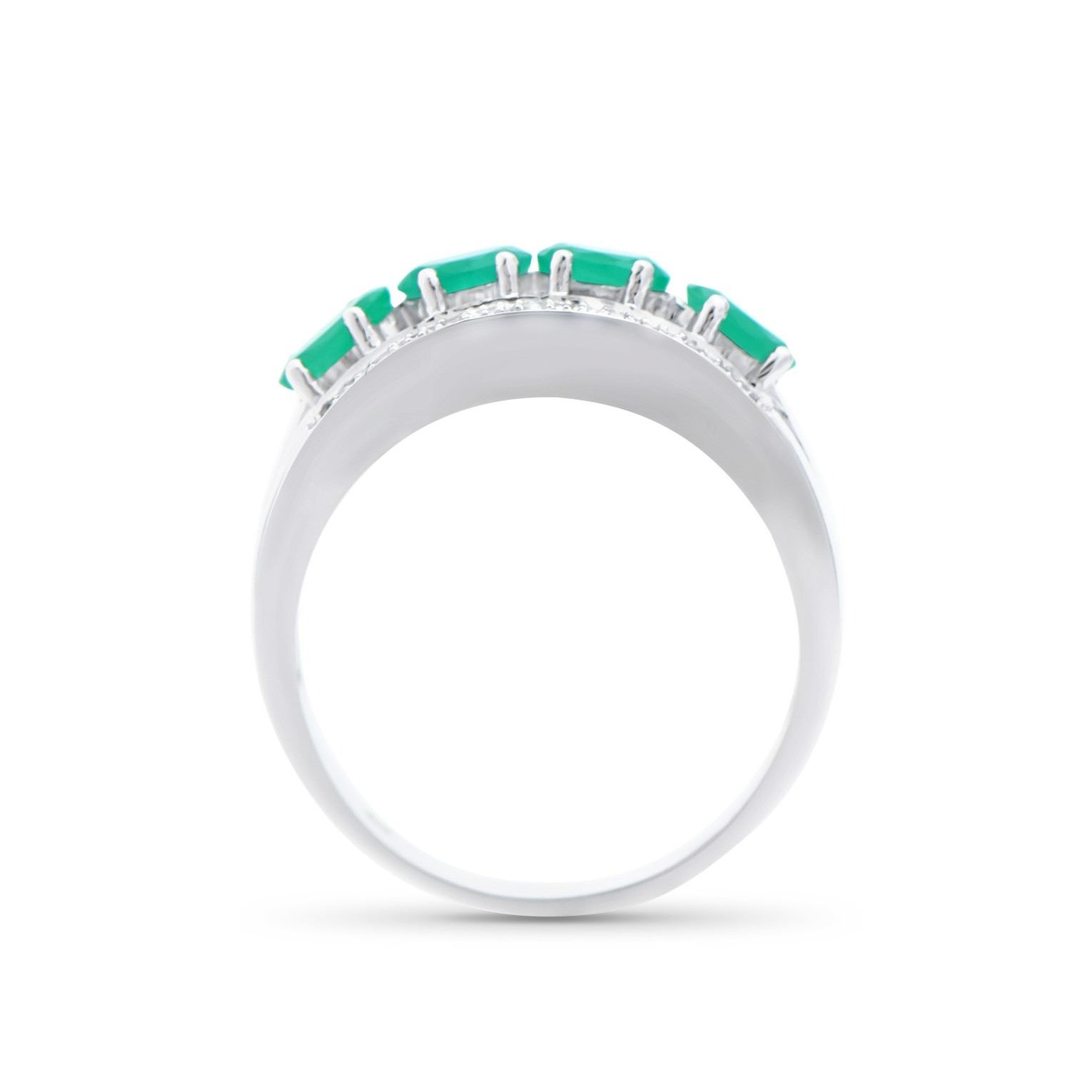 (4) Emeralds with a total weight of 1.01cts. (14) round Diamonds with a total weight of 0.07cts with a color of H-I and clarity of I2-I3. Total weight of the ring is 3.80 grams. Ring size 7.5.