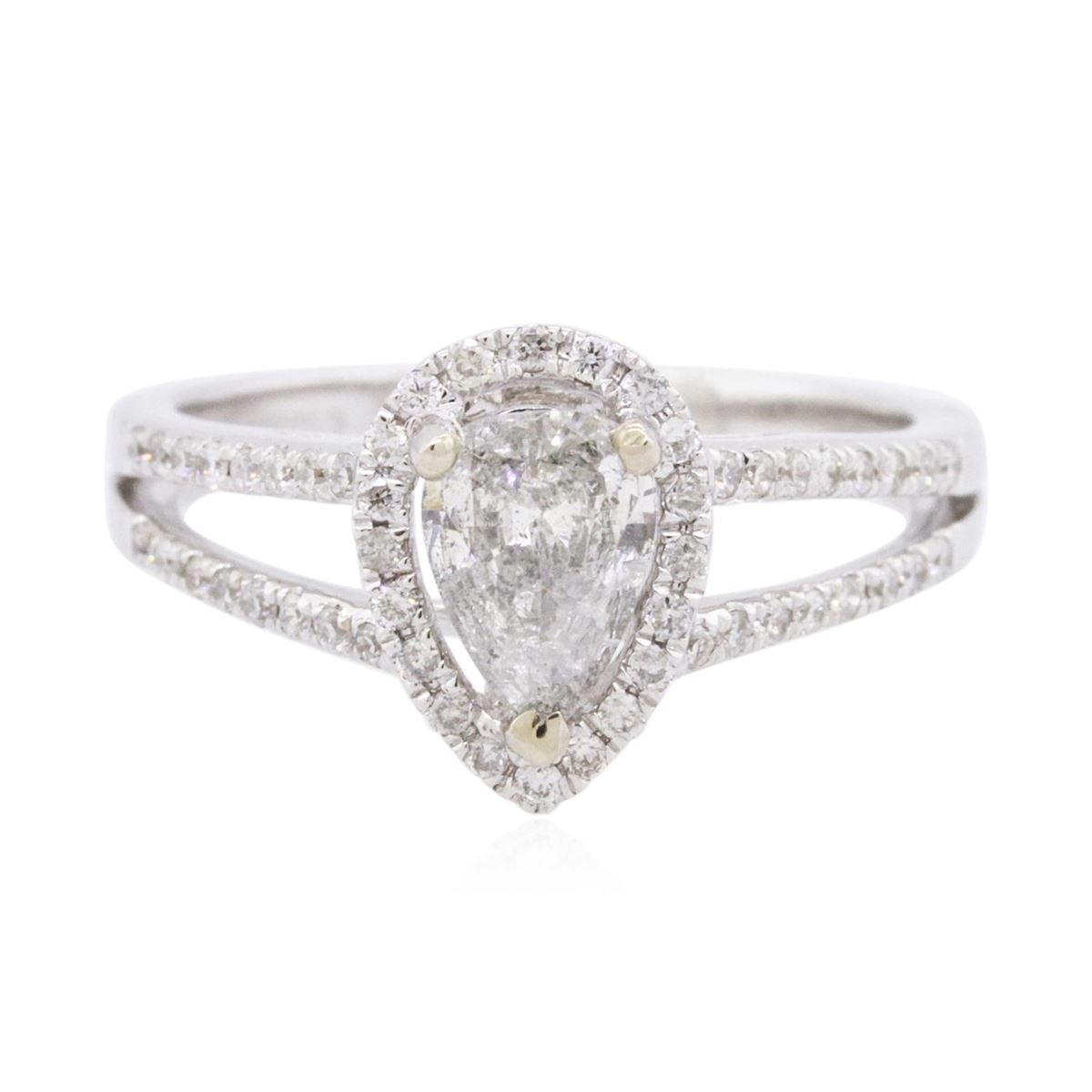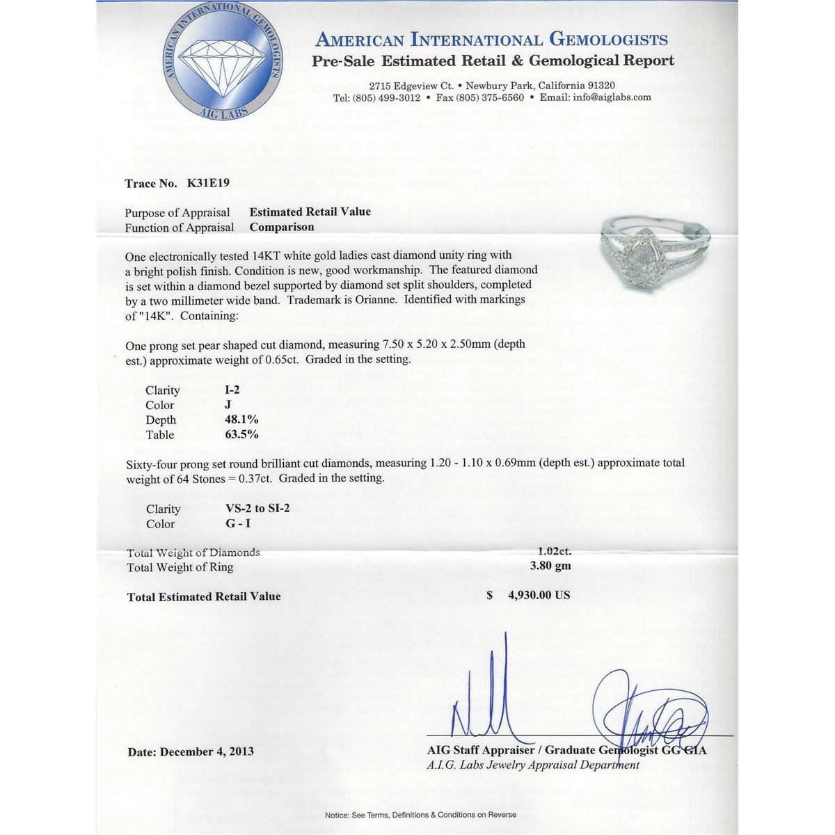 One electronically tested 14KT white gold ladies cast diamond unity ring with a bright polish finish. Condition is new, good workmanship. The featured diamond is set within a diamond bezel supported by diamond set split shoulders, completed by a two millimeter wide band. Trademark is Orianne. Identified with markings of 14K. Containing: One prong set pear shaped cut diamond, measuring 7.50 x 5.20 x 2.50mm (depth est.) approximate weight of 0.65ct. Graded in the setting. Clarity: I-2. Color: J. Depth. 48.1%. Table: 63.5%. Sixty-four prong set round brilliant cut diamonds, measuring 1.20 - 1.10 x 0.69mm (depth est.) approximate total weight of 64 stones = 0.37ct. Graded in the setting. Clarity: VS-2 to SI-2. Color: G-I. Total Weight of Diamonds 1.02ct. Total Weight of Ring 3.80 grams. AIG Appraised at $4,930.00.