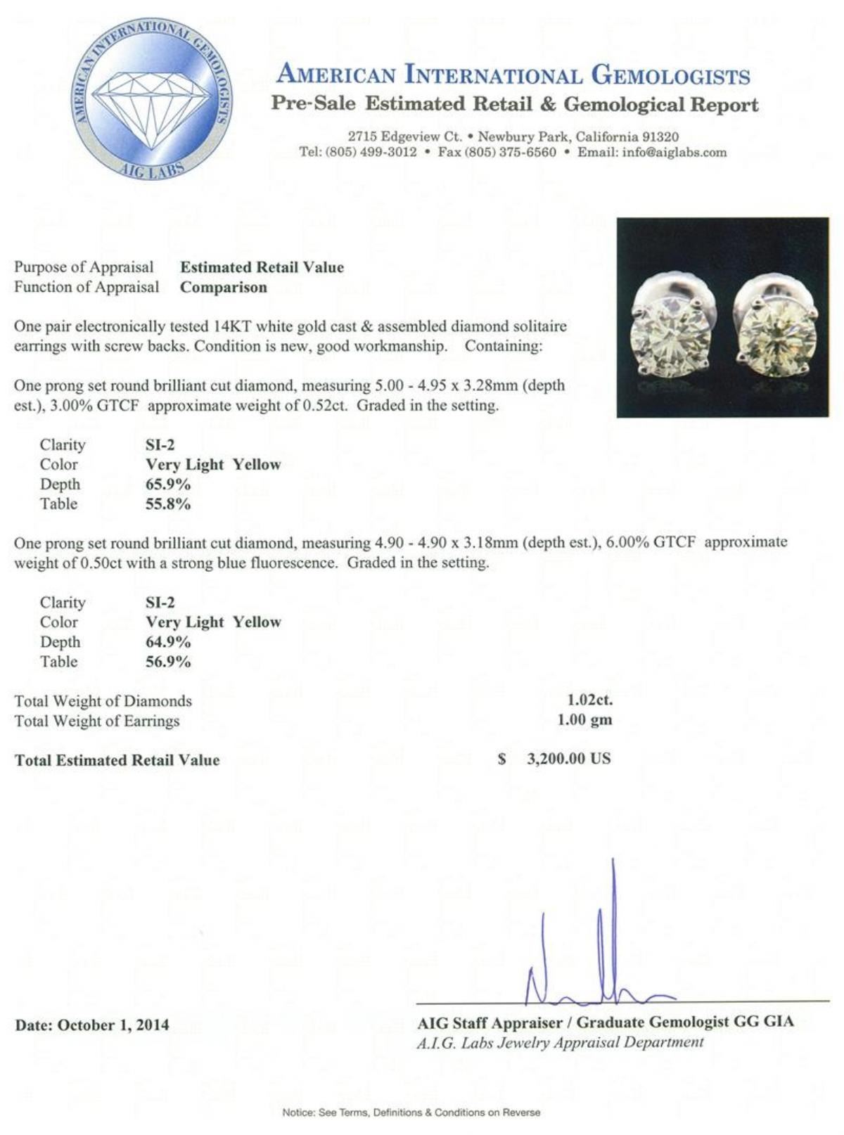 One pair electronically tested 14KT white gold cast & assembled diamond solitaire earrings with screw backs. Condition is new, good workmanship. Containing: One prong set round brilliant cut diamond, measuring 5.00 - 4.95 x 3.28mm (depth est.), 3.00% GTCF approximate weight of 0.52ct. Graded in the setting. Clarity: SI-2. Depth: 65.9%. Table 55.8%. One prong set round brilliant cut diamond, measuring 4.90 - 4.90 x 3.18mm (depth est.), 6.00% GTCF approximate weight of 0.50 ct with a strong blue fluorescence. Graded in the setting. Clarity: SI-2. Depth: 64.9%. Table 56.9%. Total Weight of Diamonds 1.02ct. Total Weight of Earrings 1.00 grams. AIG Appraised.