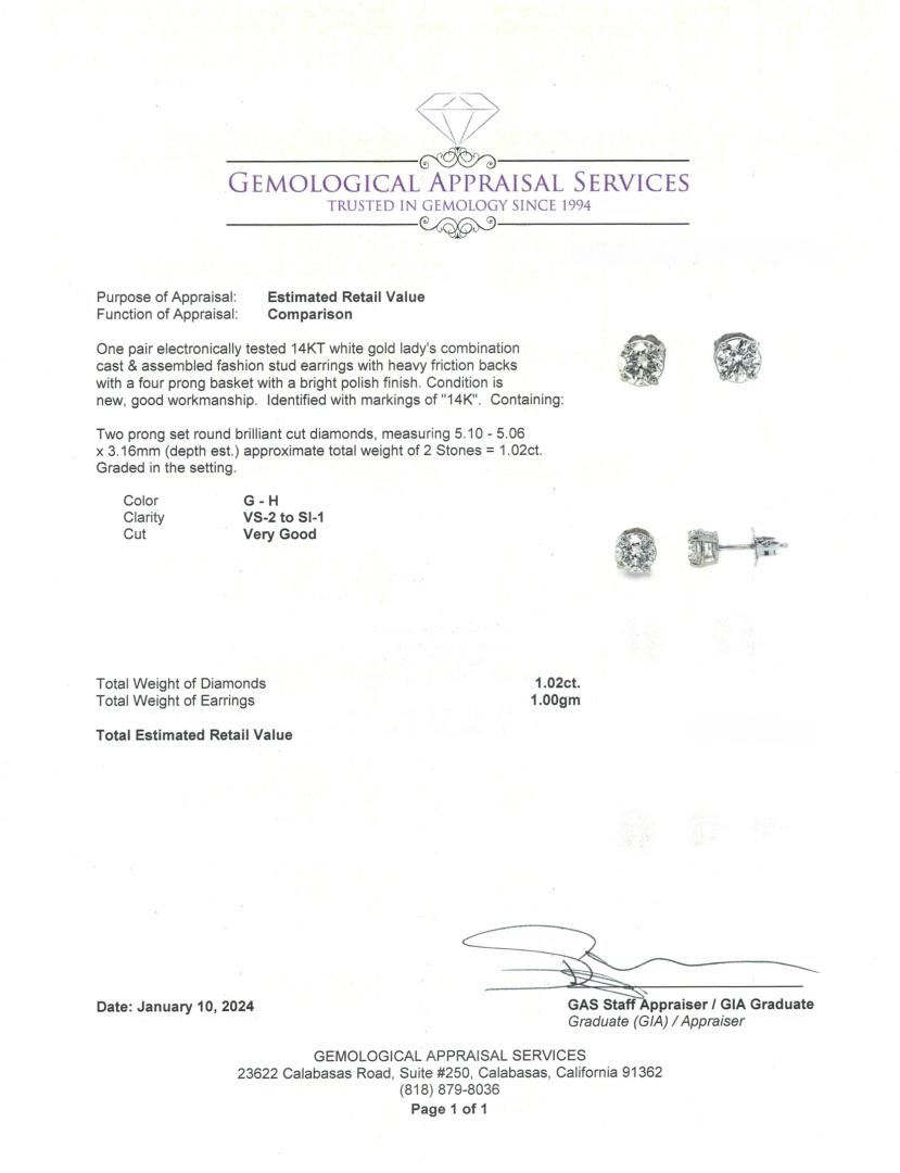 One pair electronically tested 14KT white gold lady's combination cast & assembled fashion stud earrings with heavy friction backs with a four prong basket with a bright polish finish. Condition is new, good workmanship. Identified with markings of "14K". GAS Appraised.