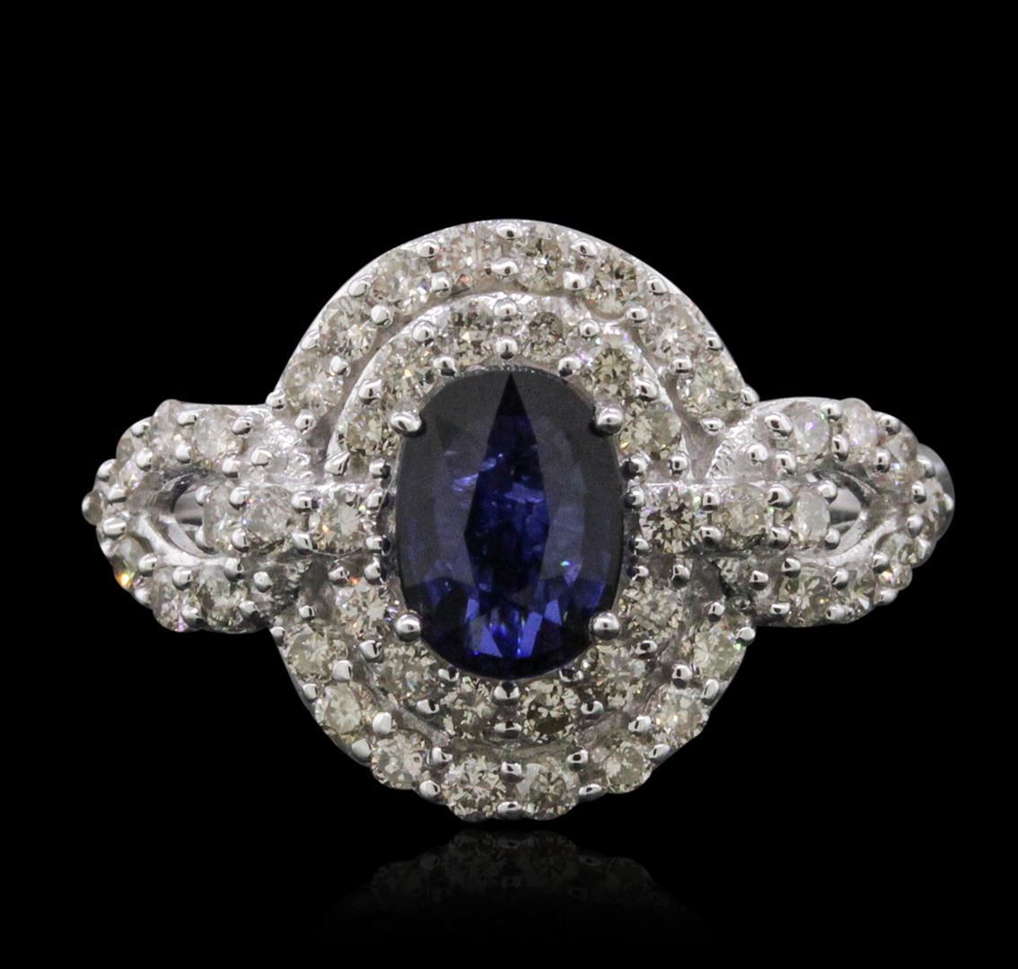 One electronically tested 14KT white gold ladies combination cast & assembled sapphire and diamond ring with a flat shank with a bright polish finish. Identified with markings of "14K". Condition is new. Containing: One prong set oval modified brilliant cut natural blue sapphire, measuring 7.09 x 5.19 x 3.37mm, approximate weight of 1.02ct., clarity is eye clean, type II, medium dark, moderately strong, blue color, (GIA B 6/4), cut is very good. Forty-Eight prong set round brilliant cut diamonds, measuring 1.50 - 1.50 x 0.90mm (depth est.) approximate total weight of 48 Stones = 0.59ct. Clarity: I-1 to I-2. Color: J - K, Cut is Good. Colored gemstones are presumed to have been subjected to commonly used enhancement processes. All diamonds and colored gemstones are graded in the mounting, unless otherwise stated. Total Weight of Colored Stones 1.02ct. Total Weight of Diamonds 0.59ct. Total Weight of Ring 3.80 grams. GGL Appraised at $3,230.00.