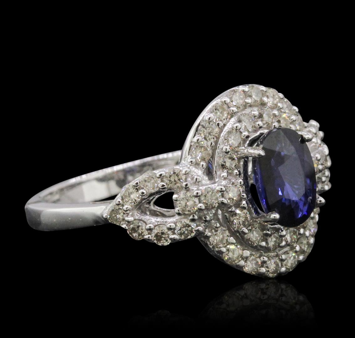 One electronically tested 14KT white gold ladies combination cast & assembled sapphire and diamond ring with a flat shank with a bright polish finish. Identified with markings of "14K". Condition is new. Containing: One prong set oval modified brilliant cut natural blue sapphire, measuring 7.09 x 5.19 x 3.37mm, approximate weight of 1.02ct., clarity is eye clean, type II, medium dark, moderately strong, blue color, (GIA B 6/4), cut is very good. Forty-Eight prong set round brilliant cut diamonds, measuring 1.50 - 1.50 x 0.90mm (depth est.) approximate total weight of 48 Stones = 0.59ct. Clarity: I-1 to I-2. Color: J - K, Cut is Good. Colored gemstones are presumed to have been subjected to commonly used enhancement processes. All diamonds and colored gemstones are graded in the mounting, unless otherwise stated. Total Weight of Colored Stones 1.02ct. Total Weight of Diamonds 0.59ct. Total Weight of Ring 3.80 grams. GGL Appraised at $3,230.00.