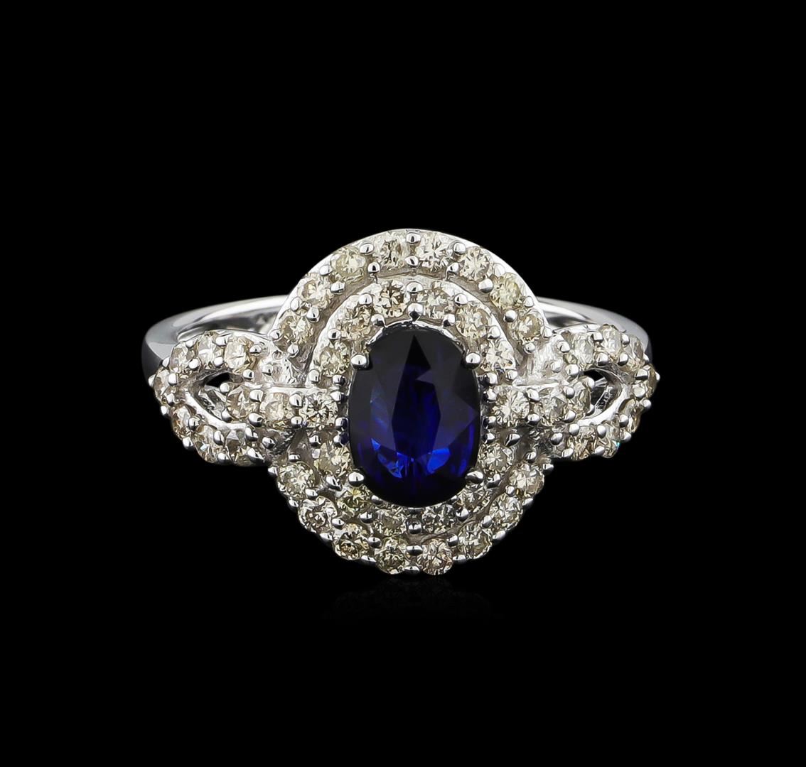 One electronically tested 14KT white gold ladies combination cast & assembled sapphire and diamond ring with a flat shank with a bright polish finish. Identified with markings of "14K". Condition is new. Containing: One prong set oval modified brilliant cut natural blue sapphire, measuring 7.09 x 5.19 x 3.37mm, approximate weight of 1.02ct., clarity is eye clean, type II, medium dark, moderately strong, blue color, (GIA B 6/4), cut is very good. Forty-Eight prong set round brilliant cut diamonds, measuring 1.50 - 1.50 x 0.90mm (depth est.) approximate total weight of 48 Stones = 0.59ct. Clarity: I-1 to I-2. Color: J - K, Cut is Good. Colored gemstones are presumed to have been subjected to commonly used enhancement processes. All diamonds and colored gemstones are graded in the mounting, unless otherwise stated. Total Weight of Colored Stones 1.02ct. Total Weight of Diamonds 0.59ct. Total Weight of Ring 3.80 grams. GGL Appraised at $3,230.00.