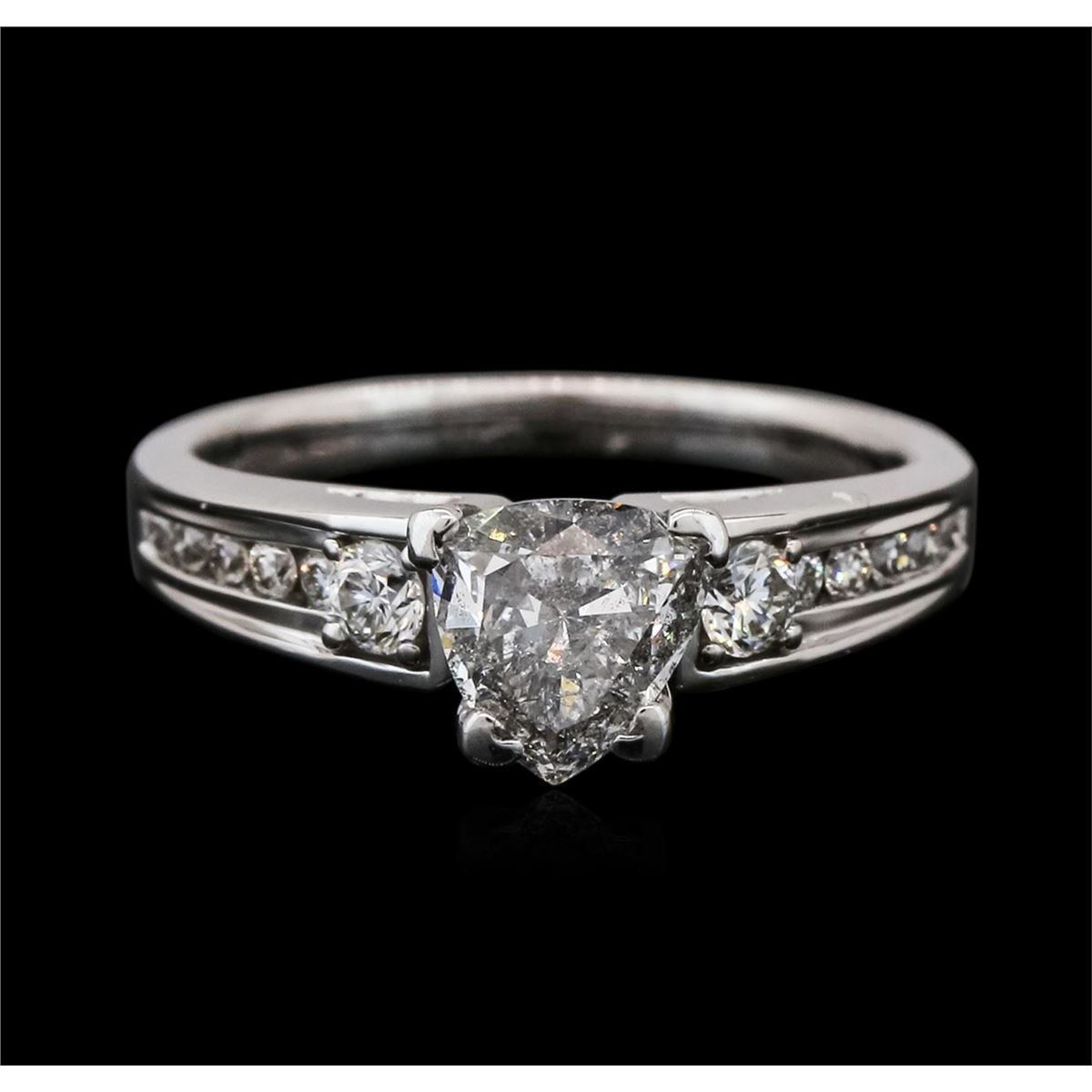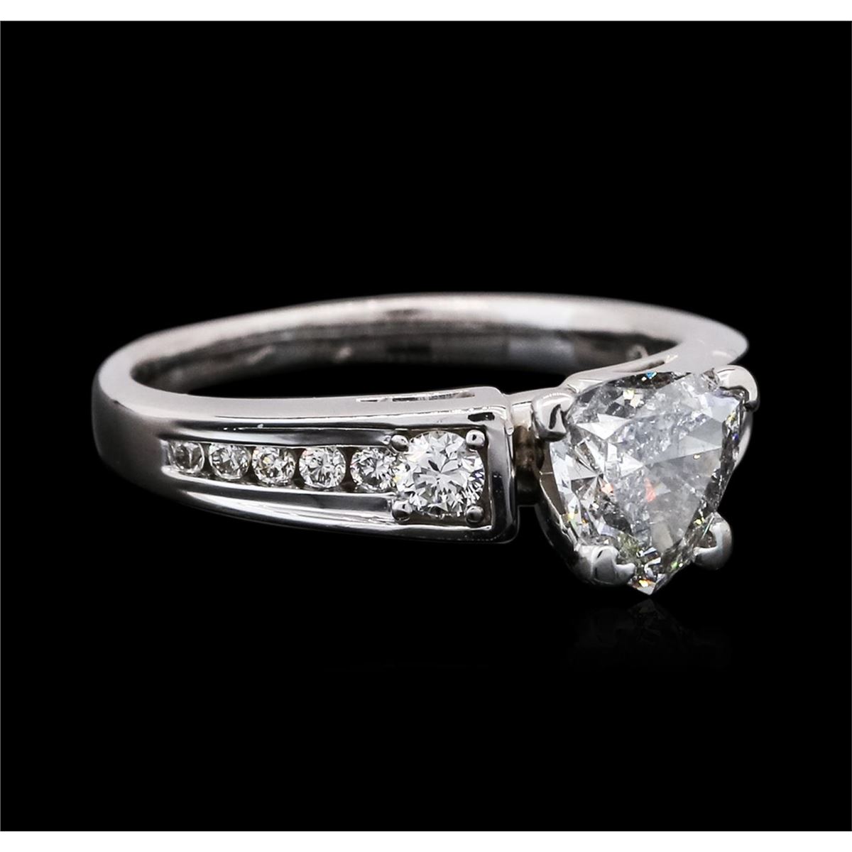 One electronically tested 14KT white gold ladies cast diamond engagement ring with a bright polish finish. Identified with markings of "14K". Condition is new. Containing: One prong set triangle brilliant cut diamond, measuring 6.20 x 6.20 x 3.84mm (depth est.) approximate weight of 0.84ct. Clarity: I-2. Color: K, Cut is Good. Twelve channel set round brilliant cut diamonds, measuring 2.50 - 1.30 x 1.14mm (depth est.) approximate total weight of 12 Stones = 0.18ct. Clarity: SI-2 to I-1. Color: I, Cut is Good. All diamonds are graded in the mounting, unless otherwise stated. Total Weight of Diamonds 1.02ct. Total Weight of Ring 3.60 grams. GGL Appraised at $4,490.00.