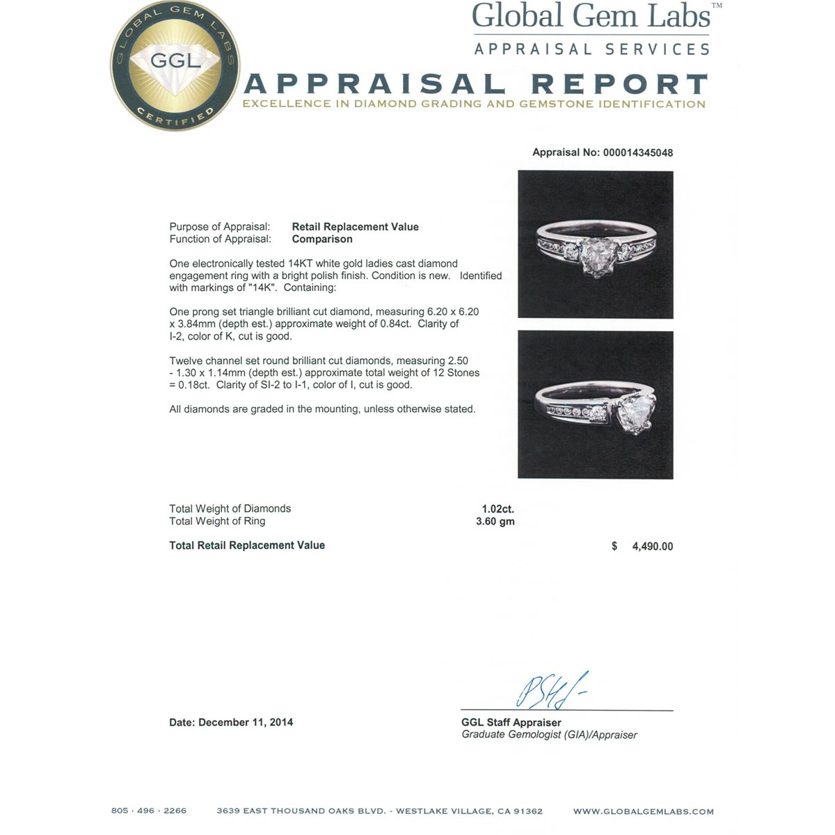One electronically tested 14KT white gold ladies cast diamond engagement ring with a bright polish finish. Identified with markings of "14K". Condition is new. Containing: One prong set triangle brilliant cut diamond, measuring 6.20 x 6.20 x 3.84mm (depth est.) approximate weight of 0.84ct. Clarity: I-2. Color: K, Cut is Good. Twelve channel set round brilliant cut diamonds, measuring 2.50 - 1.30 x 1.14mm (depth est.) approximate total weight of 12 Stones = 0.18ct. Clarity: SI-2 to I-1. Color: I, Cut is Good. All diamonds are graded in the mounting, unless otherwise stated. Total Weight of Diamonds 1.02ct. Total Weight of Ring 3.60 grams. GGL Appraised at $4,490.00.
