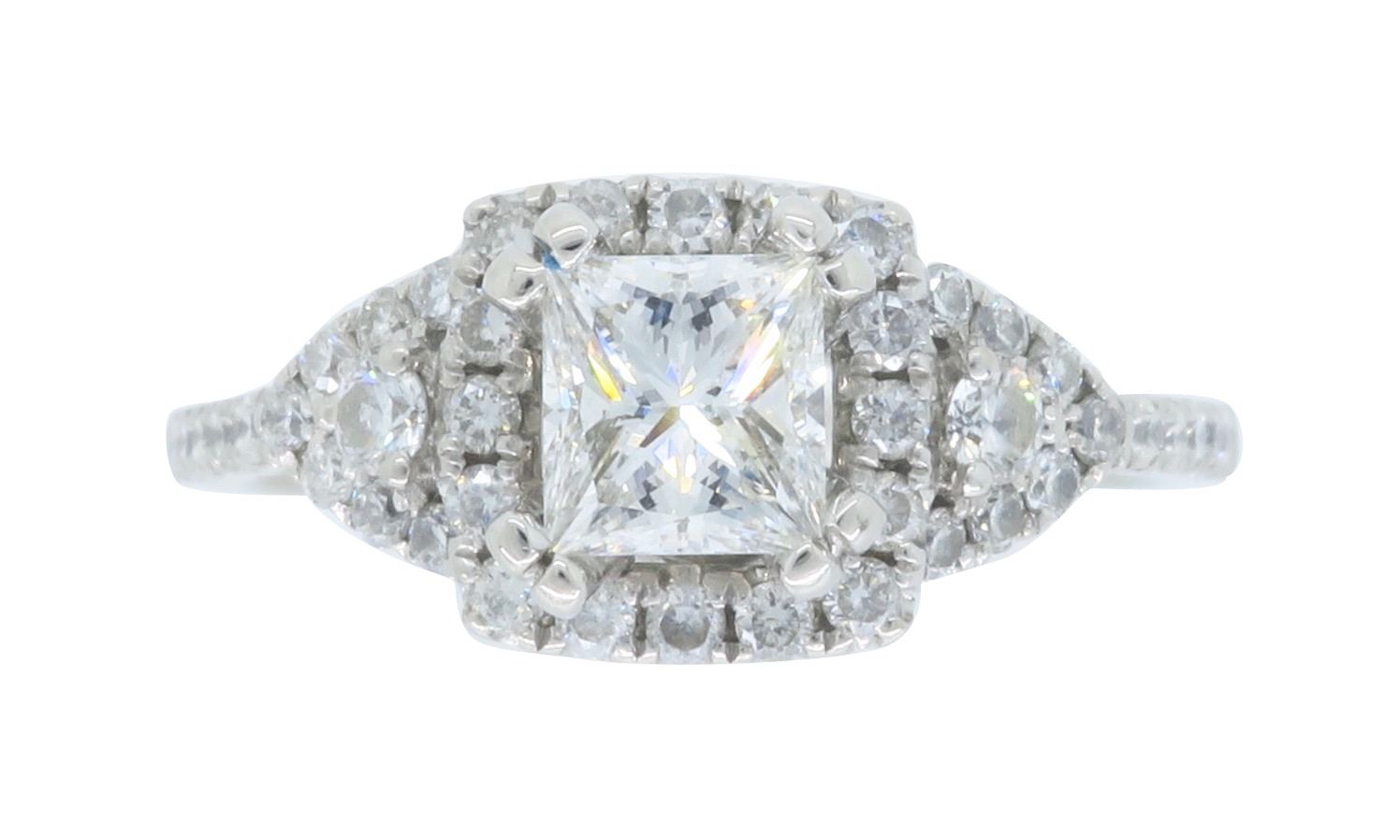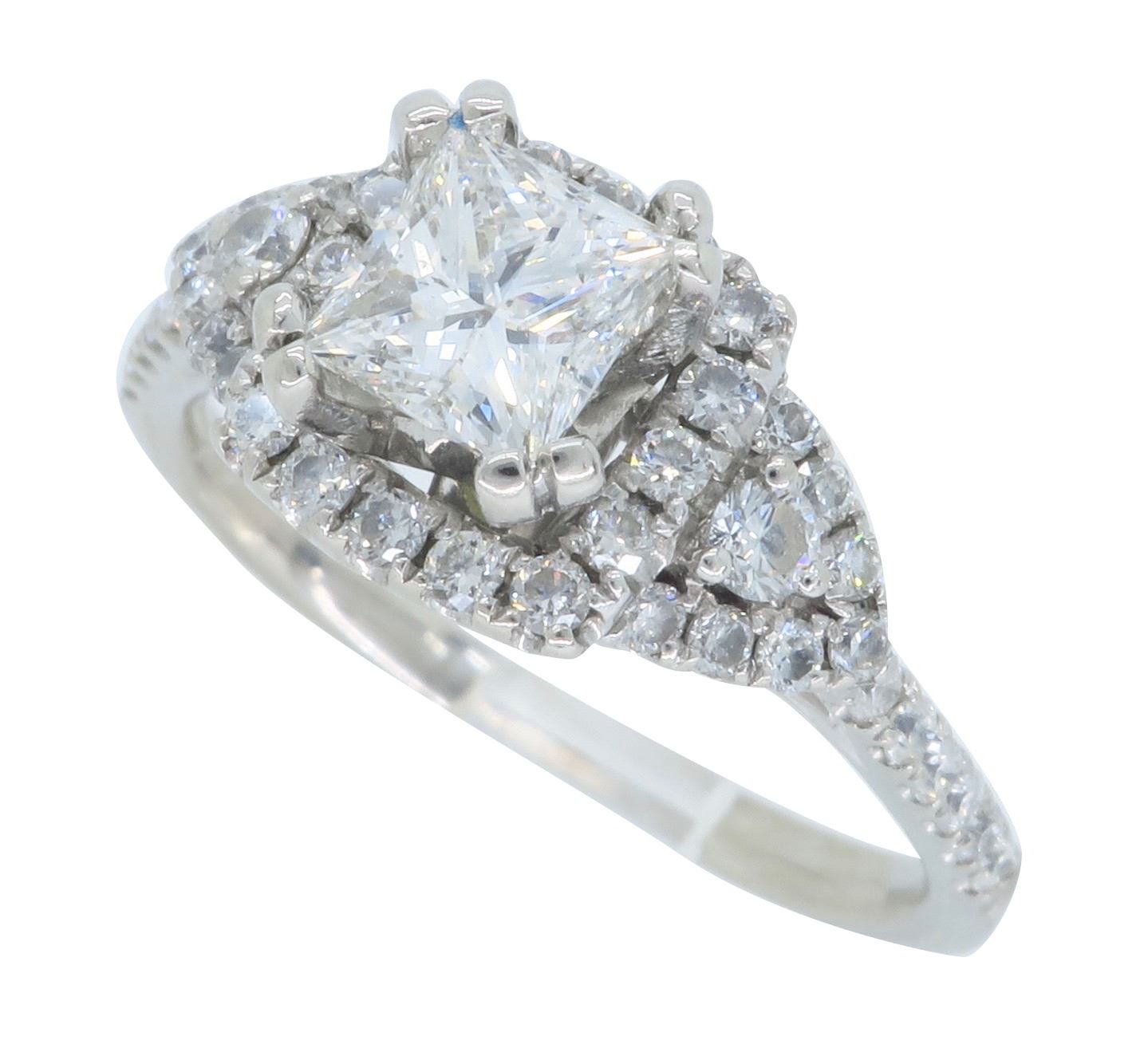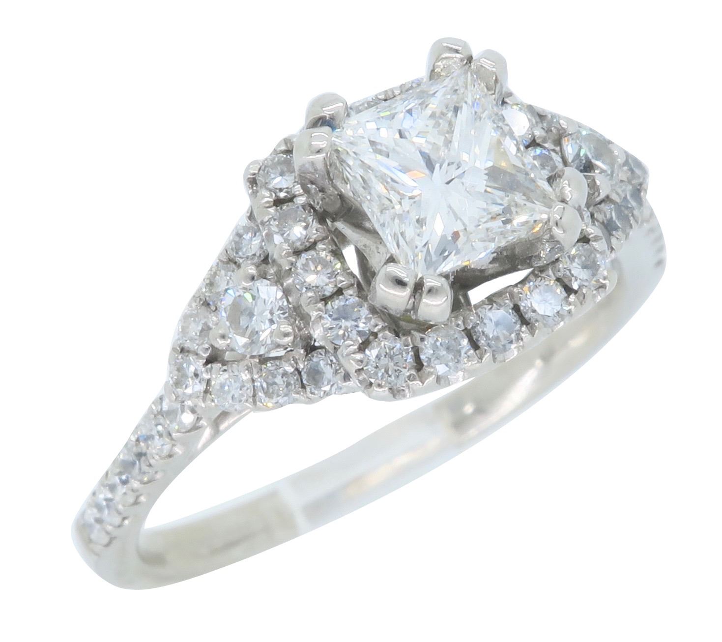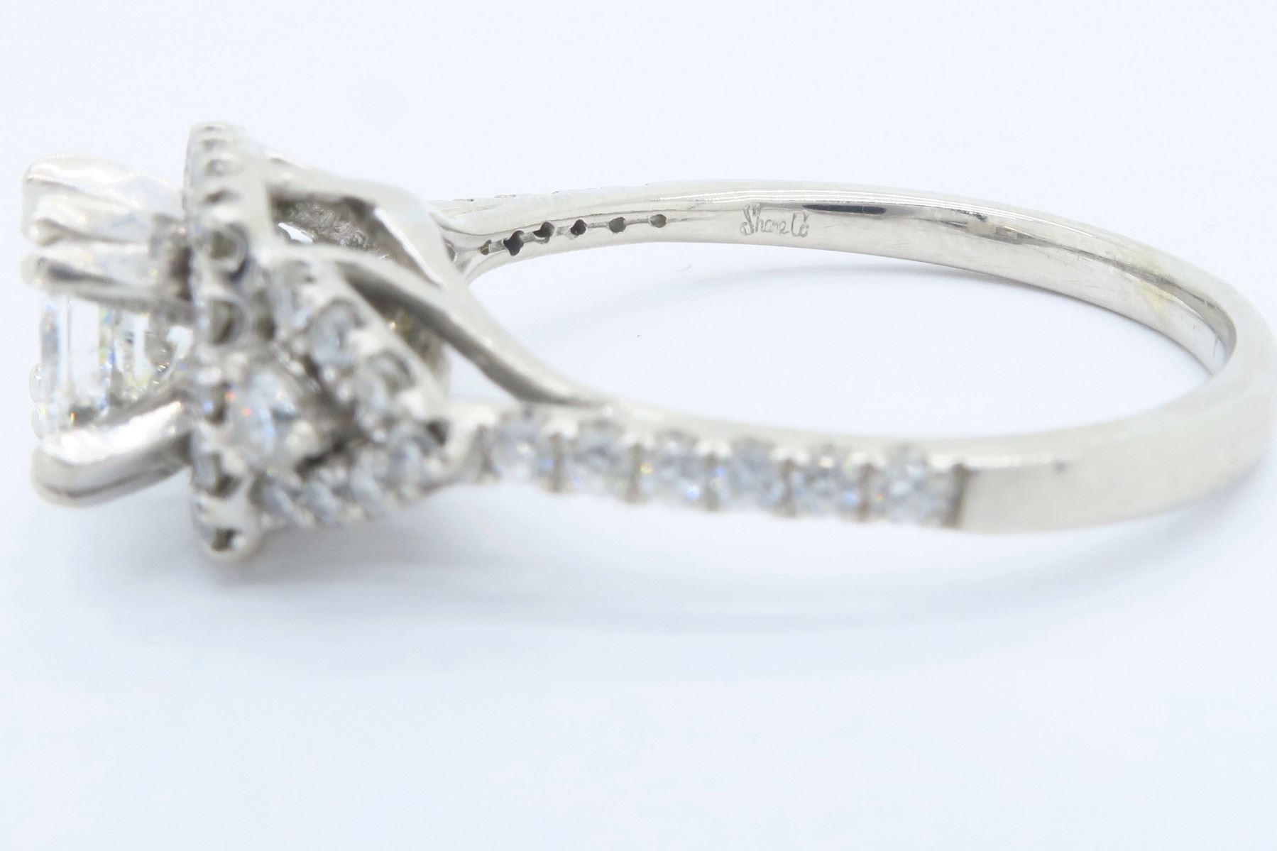 One 14KT White Gold 1.02ctw Diamond Ring. (1) Princess cut Diamond with a total weight of 0.60cts with a color of H-I and clarity of SI-2. (44) Round Diamonds with a total weight of 0.42cts. Total weight of this ring is 3.6 grams. Ring size is 7.25.