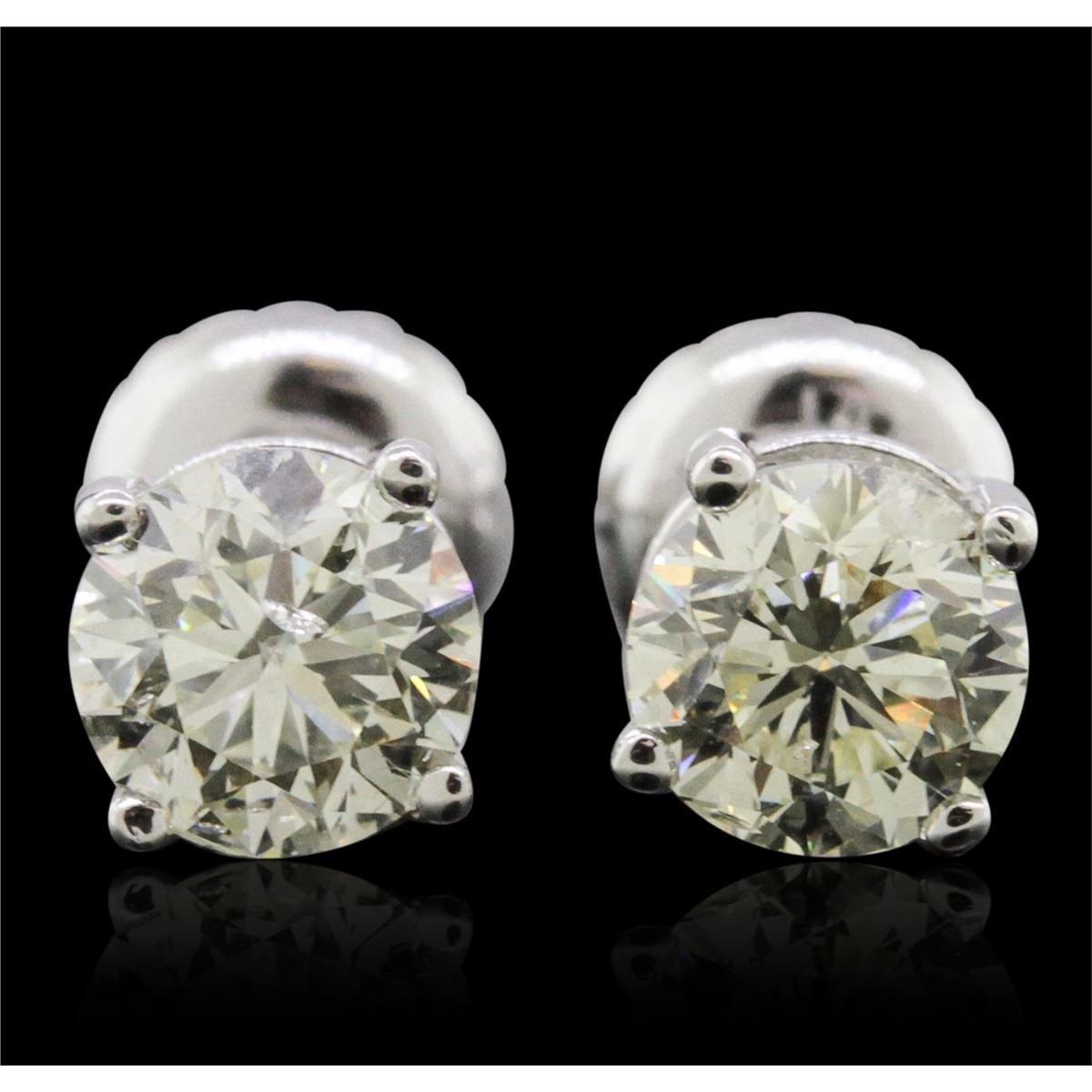 One pair electronically tested 14KT white gold cast & assembled diamond solitaire earrings with screw backs. Condition is new, good workmanship. Containing: One prong set round brilliant cut diamond, measuring 5.00 - 4.95 x 3.28mm (depth est.), 3.00% GTCF approximate weight of 0.52ct. Graded in the setting. Clarity: SI-2. Depth: 65.9%. Table 55.8%. One prong set round brilliant cut diamond, measuring 4.90 - 4.90 x 3.18mm (depth est.), 6.00% GTCF approximate weight of 0.50ct with a strong blue fluorescence. Graded in the setting. Clarity: SI-2. Depth: 64.9%. Table 56.9%. Total Weight of Diamonds 1.02ct. Total Weight of Earrings 1.00 grams. AIG Appraised at $3,200.00.
