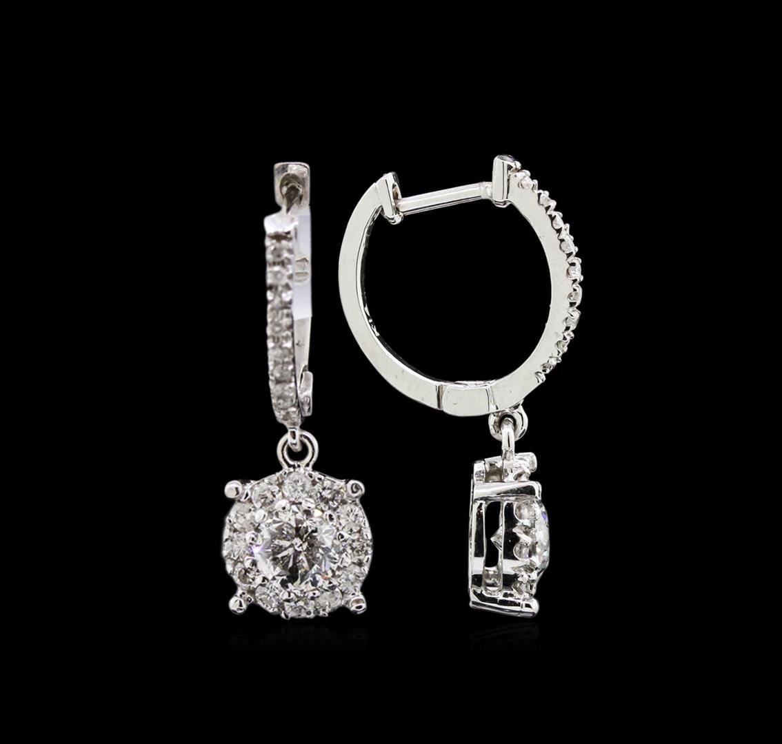 One pair electronically tested 14KT white gold ladies cast diamond earrings with hinged clip backs with a bright polish finish. Identified with markings of "14K". Condition is new. Containing: Two prong set round brilliant cut diamonds, measuring 5.00 - 5.00 x 3.00mm (depth est.) approximate total weight of 2 Stones = 0.92ct. Clarity: I-1 to I-2. Color: H - I, Cut is Good. Twenty-Four prong set round brilliant cut diamonds, measuring 1.10 - 1.10 x 0.66mm (depth est.) approximate total weight of 24 Stones = 0.12ct. Clarity: SI-2 to I-2. Color: H - I, Cut is Good. All diamonds are graded in the mounting, unless otherwise stated. Total Weight of Diamonds 1.03ct. Total Weight of Earrings 3.80 grams. GGL Appraised at $4,100.00.