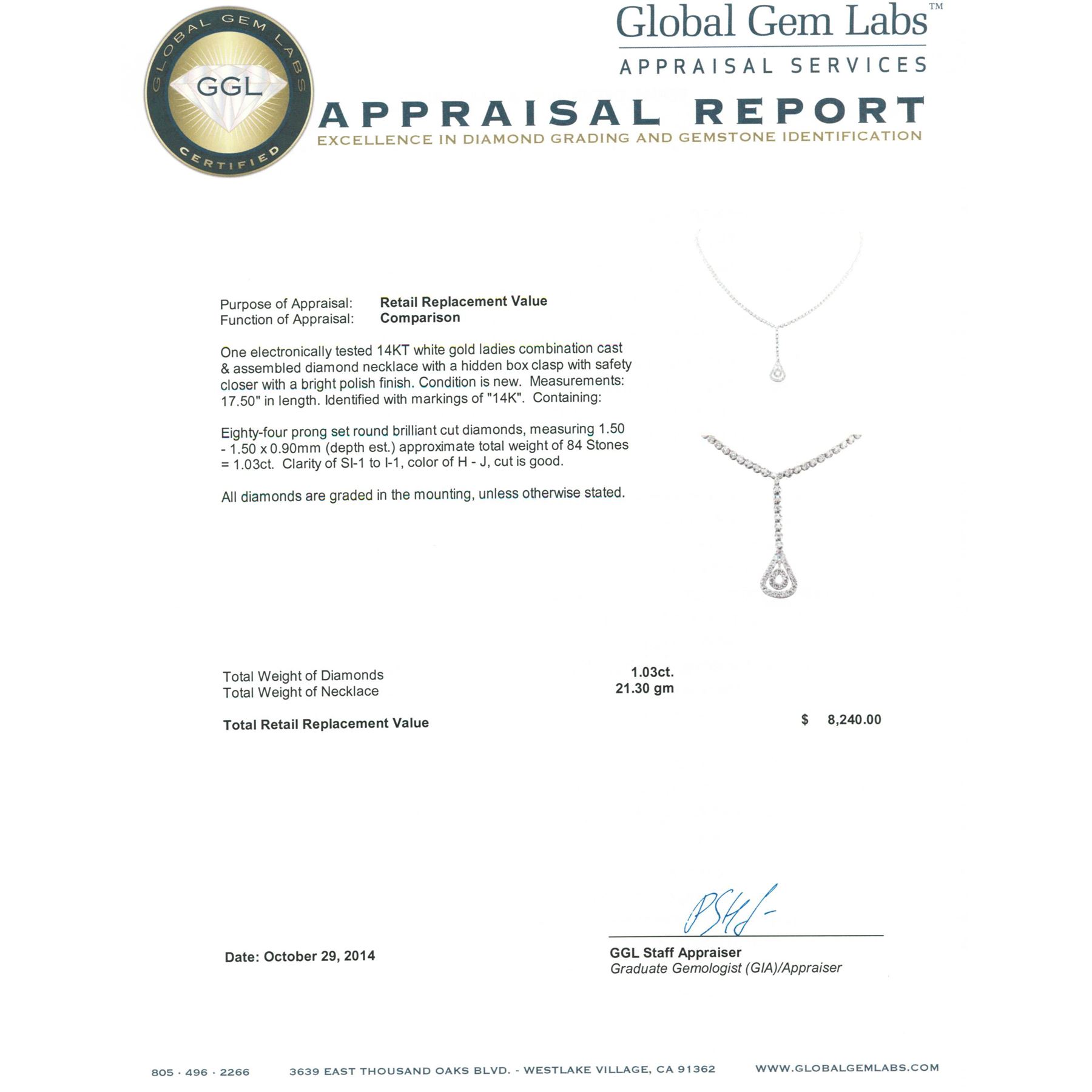 One electronically tested 14KT white gold ladies combination cast & assembled diamond necklace with a hidden box clasp with safety closer with a bright polish finish. Measurements: 17.50 in length. Identified with markings of 14K. Condition is new. Containing: Eighty-Four prong set round brilliant cut diamonds, measuring 1.50 - 1.50 x 0.90mm (depth est.) approximate total weight of 84 Stones = 1.03ct. Clarity: SI-1 to I-1. Color: H - J, Cut is Good. All diamonds are graded in the mounting, unless otherwise stated. Total Weight of Diamonds 1.03ct. Total Weight of Necklace 21.30 grams. GGL Appraised.