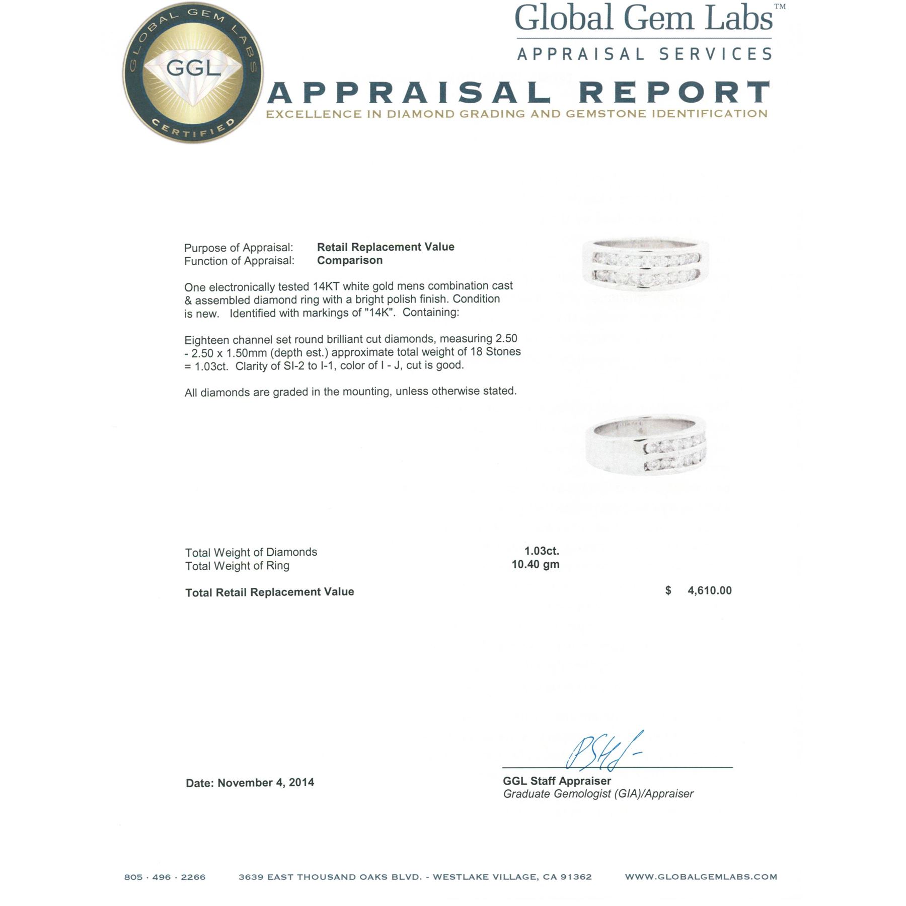 One electronically tested 14KT white gold mens combination cast & assembled diamond ring with a bright polish finish. Identified with markings of "14K". Condition is new. Containing: Eighteen channel set round brilliant cut diamonds, measuring 2.50 - 2.50 x 1.50mm (depth est.) approximate total weight of 18 Stones = 1.03ct. Clarity: SI-2 to I-1. Color: I - J, Cut is Good. All diamonds are graded in the mounting, unless otherwise stated. Total Weight of Diamonds 1.03ct. Total Weight of Ring 10.40 grams. GGL Appraised at $4,610.00.