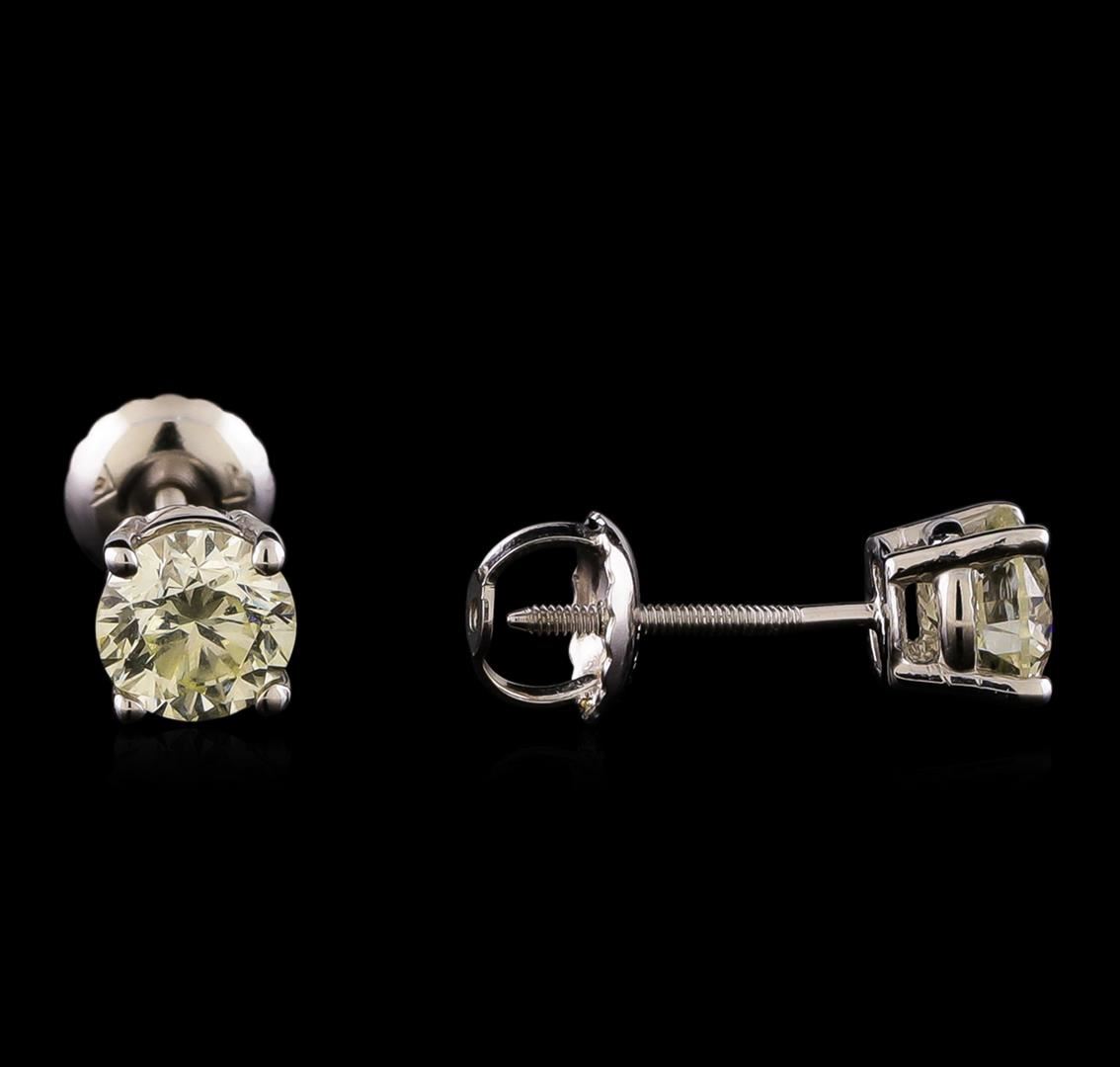 One pair electronically tested 14KT white gold cast & assembled diamond solitaire earrings with screw backs. Condition is new, good workmanship. Containing: One prong set round brilliant cut diamond, measuring 5.08 - 5.00 x 3.18mm (depth est.) approximate weight of 0.50ct. Graded in the setting. Clarity: SI-2. Depth: 63.1%. Table 53.6%. One prong set round brilliant cut diamond, measuring 5.10 - 5.07 x 3.30mm (depth est.) approximate weight of 0.53ct with a strong blue fluorescence. Graded in the setting. Clarity: I-1. Depth: 64.8%. Table 55.0%. Total Weight of Diamonds 1.03ct. Total Weight of Earrings 0.97 grams. AIG Appraised at $3,100.00.