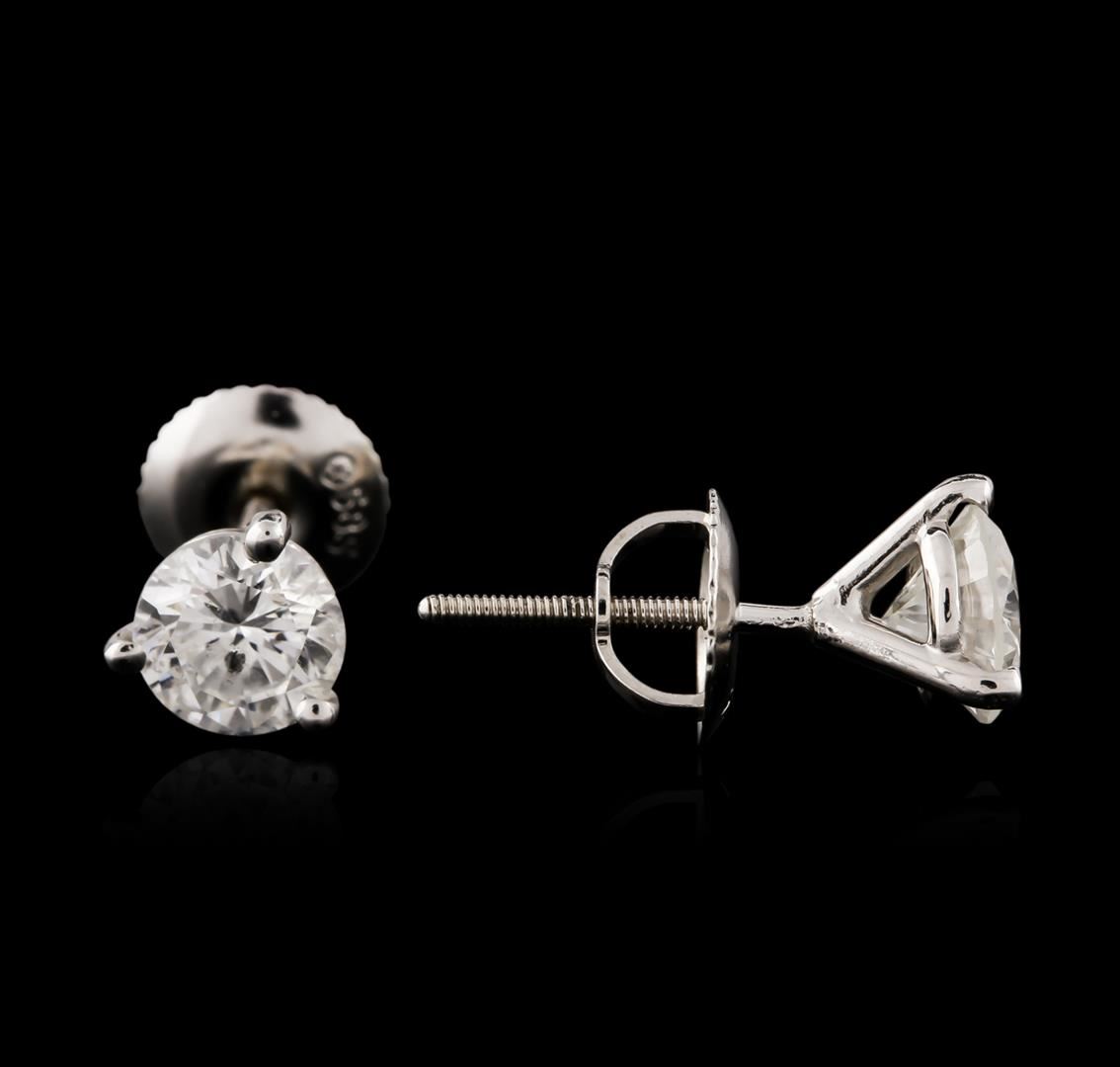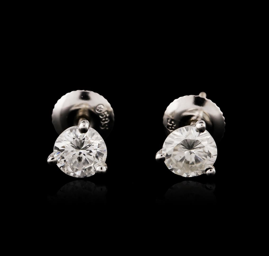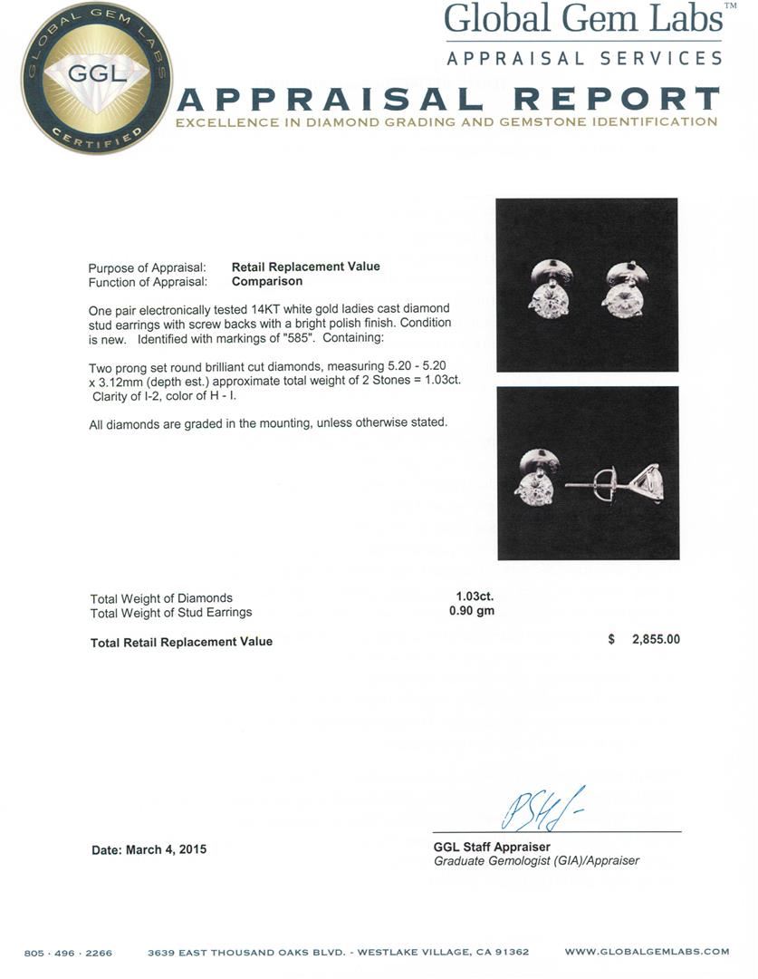 One pair electronically tested 14KT white gold ladies cast diamond stud earrings with screw backs with a bright polish finish. Identified with markings of "585". Condition is new. Containing: Two prong set round brilliant cut diamonds, measuring 5.20 - 5.20 x 3.12mm (depth est.) approximate total weight of 2 Stones = 1.03ct. Clarity: I-2. Color: H - I. All diamonds are graded in the mounting, unless otherwise stated. Total Weight of Diamonds 1.03ct. Total Weight of Stud Earrings 0.90 grams. GGL Appraised at $2,855.00.