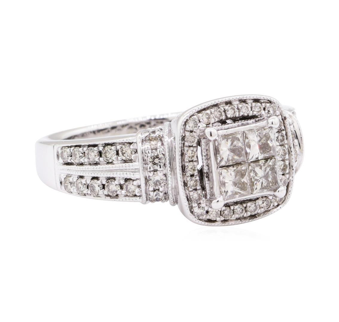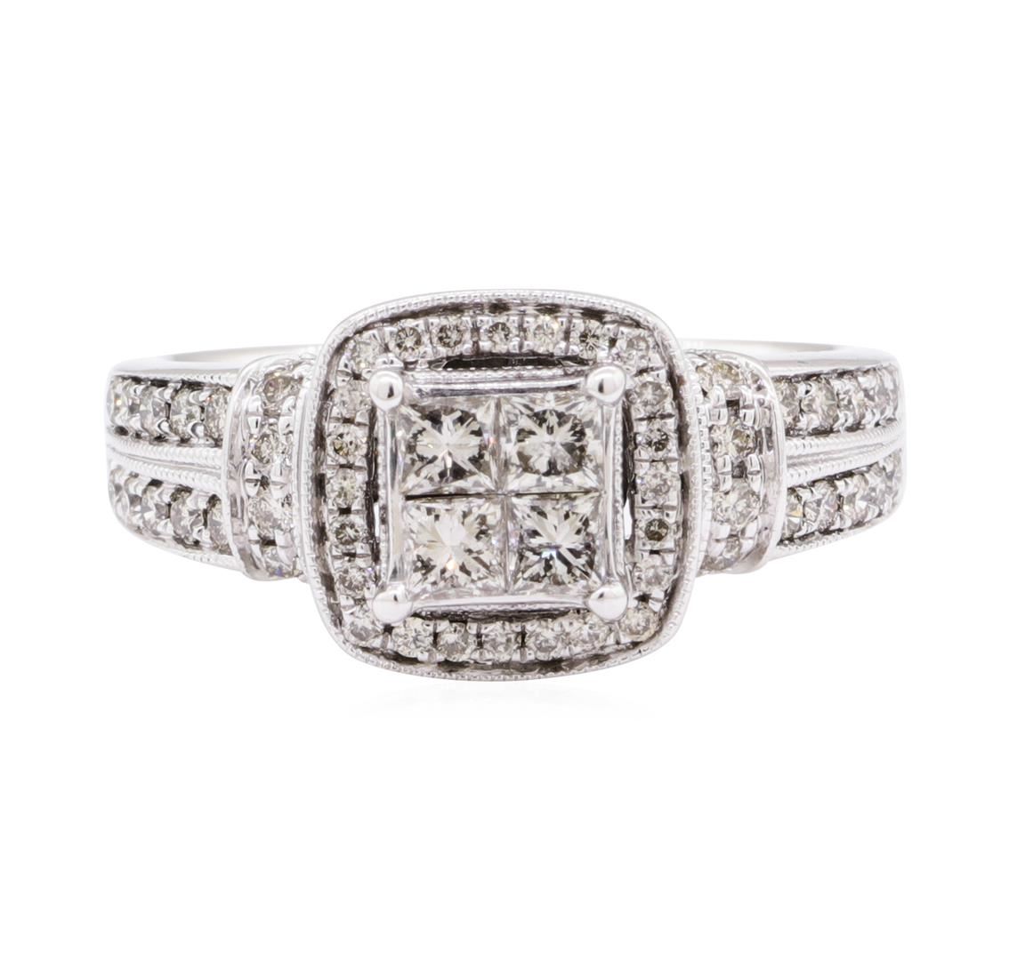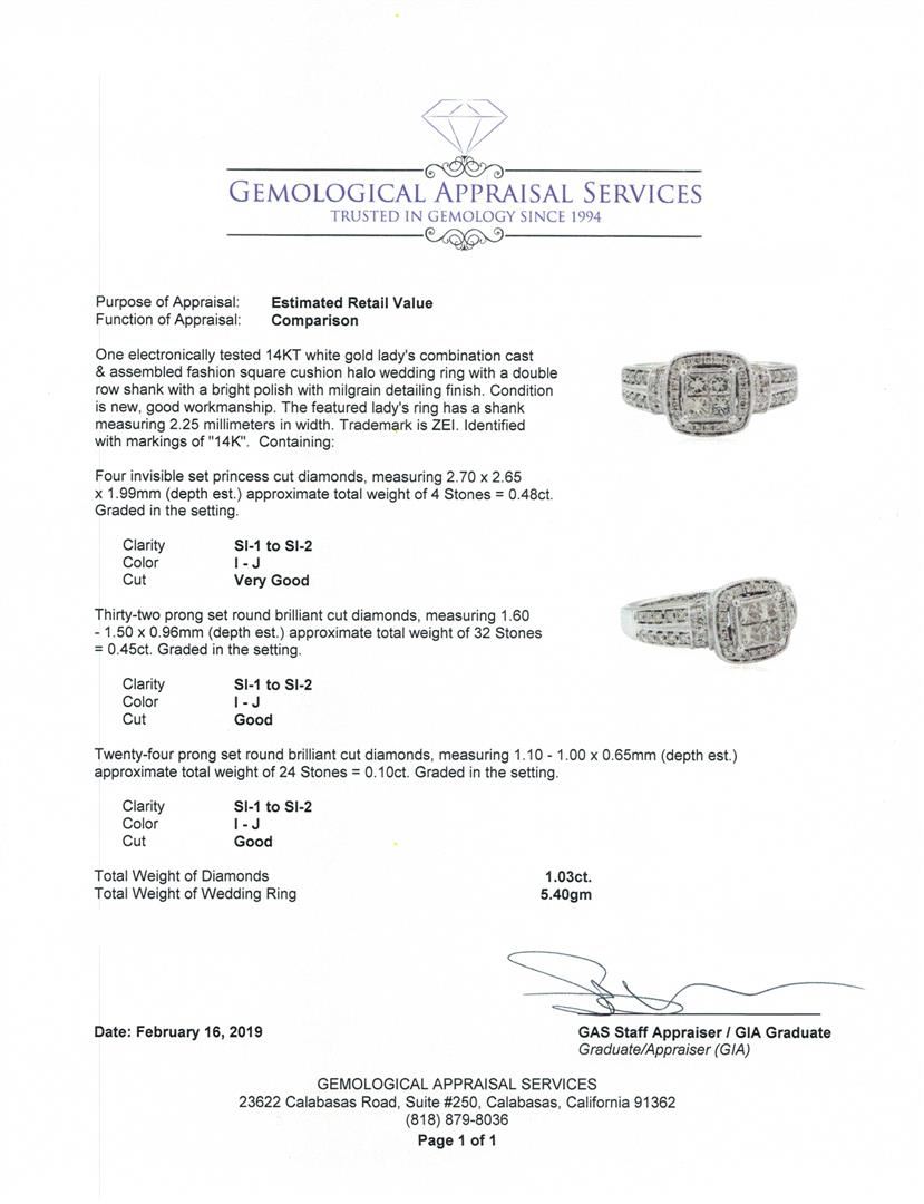 One electronically tested 14KT white gold lady's combination cast & assembled fashion square cushion halo wedding ring with a double row shank with a bright polish with milgrain detailing finish. The featured lady's ring has a shank measuring 2.25 millimeters in width. Trademark is ZEI. Identified with markings of '14K'. Condition is new, good workmanship. Containing: Four invisible set princess cut diamonds, measuring 2.70 x 2.65 x 1.99mm (depth est.) approximate total weight of 4 Stones = 0.48ct. Graded in the setting. Color I - J, Clarity SI-1 to SI-2, Cut Very Good Thirty-Two prong set round brilliant cut diamonds, measuring 1.60 - 1.50 x 0.96mm (depth est.) approximate total weight of 32 Stones = 0.45ct. Graded in the setting. Color I - J, Clarity SI-1 to SI-2 Cut Good Twenty-Four prong set round brilliant cut diamonds, measuring 1.10 - 1.00 x 0.65mm (depth est.) approximate total weight of 24 Stones = 0.10ct. Graded in the setting. Color I - J, Clarity SI-1 to SI-2 Cut Good. Total Weight of Diamonds 1.03ct. Total Weight of Wedding Ring 5.40gm. GAS Appraised.