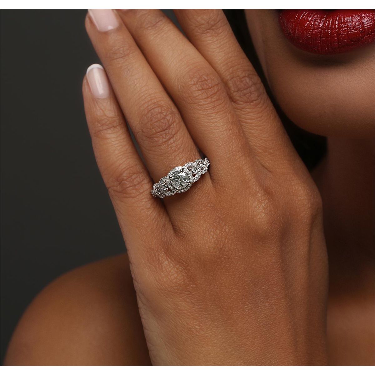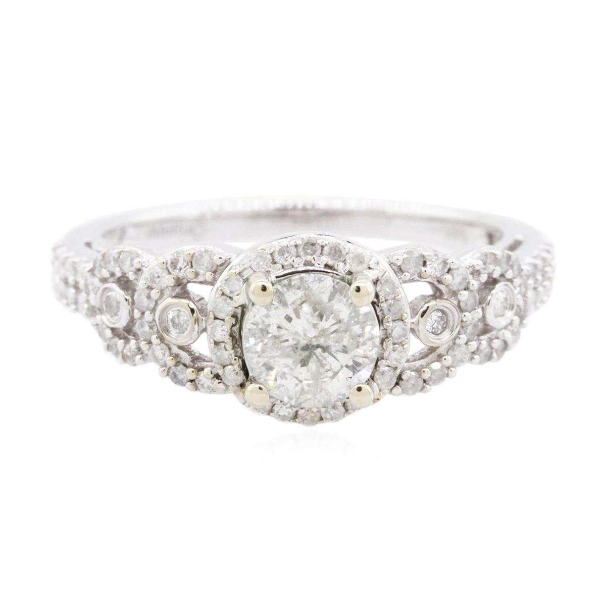 One electronically tested 14KT white gold ladies combination cast & assembled engagement ring with a flat shank with a bright polish finish. Identified with markings of "14K". Condition is new. Containing: One prong set round brilliant cut diamond, measuring 5.73 - 5.70 x 3.43mm (depth est.) approximate weight of 0.68ct. Clarity: I-2. Color: J, Cut is Good. Seventy-Three prong set round brilliant cut diamonds, measuring 1.10 - 1.10 x 0.66mm (depth est.) approximate total weight of 73 Stones = 0.35ct. Clarity: I-1 to I-3. Color: I - J, Cut is Good. All diamonds are graded in the mounting, unless otherwise stated. Total Weight of Diamonds 1.03ct. Total Weight of Ring 4.10 grams. GGL Appraised at $5,375.00.