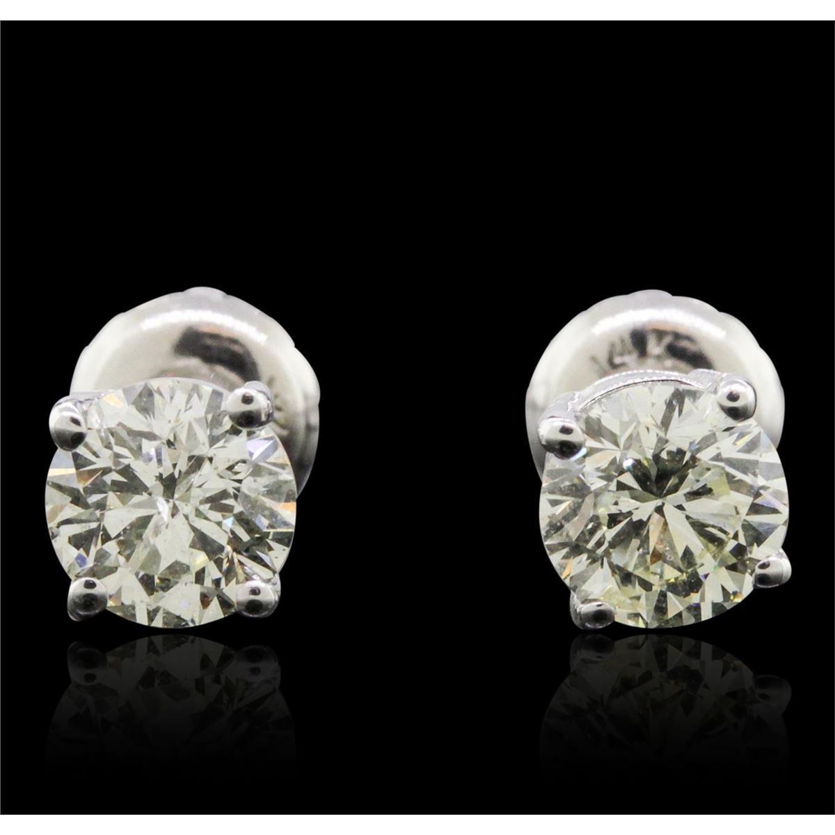 One pair electronically tested 14KT white gold cast & assembled diamond solitaire earrings with screw backs. Condition is new, good workmanship. Containing: One prong set round brilliant cut diamond, measuring 5.10 - 5.10 x 3.23mm (depth est.) approximate weight of 0.51ct with a medium blue fluorescence. Graded in the setting. Clarity: I-1. Color: L. Depth 63.3%. Table 54.3%. One prong set round brilliant cut diamond, measuring 5.10 - 5.00 x 3.30mm (depth est.), 2.00% GTCF approximate weight of 0.52ct with a very strong blue fluorescence. Graded in the setting. Clarity: I-1. Color: N. Depth 65.4%. Table 56.4%. Total Weight of Diamonds 1.03ct. Total Weight of Earrings 0.95 grams. AIG Appraised at $3,450.00.