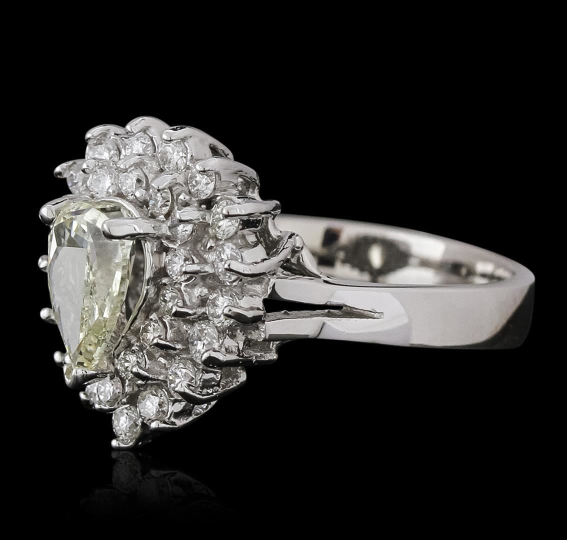 One electronically tested 14KT white gold ladies combination cast & assembled engagement ring with a flat shank with a bright polish finish. Identified with markings of "14K". Condition is new. Containing: One prong set pear shaped cut diamond, measuring 8.50 x 4.70 x 2.51mm (depth est.) approximate weight of 0.58ct. Clarity: SI-2, Cut is Good. Thirty-One prong set round brilliant cut diamonds, measuring 1.80 - 1.40 x 0.96mm (depth est.) approximate total weight of 31 Stones = 0.46ct. Clarity: SI-1 to SI-2. Color: G - H, Cut is Good. All diamonds are graded in the mounting, unless otherwise stated. Total Weight of Diamonds 1.04ct. Total Weight of Ring 5.30 grams. GGL Appraised at $6,765.00.