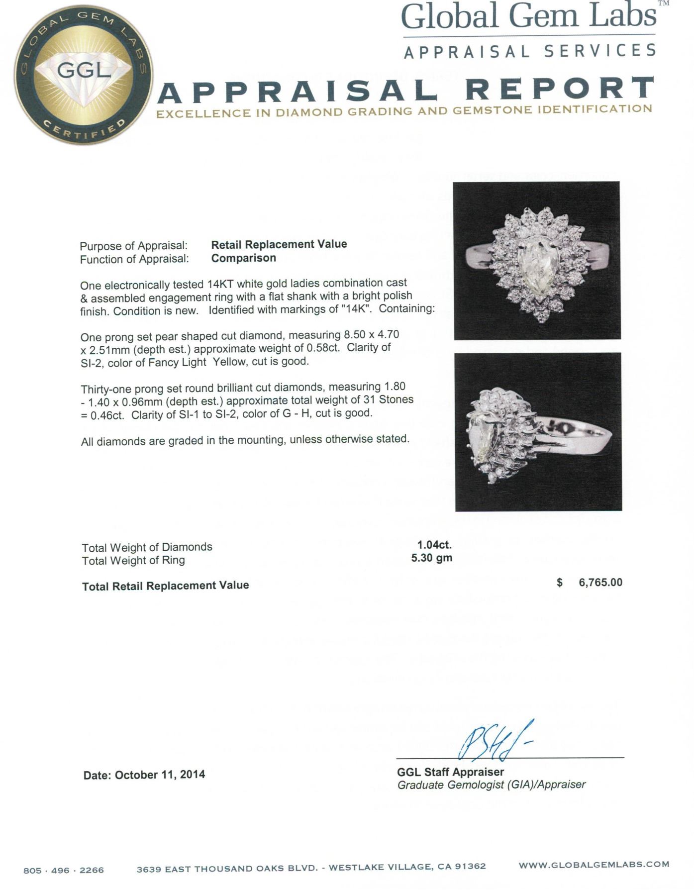One electronically tested 14KT white gold ladies combination cast & assembled engagement ring with a flat shank with a bright polish finish. Identified with markings of "14K". Condition is new. Containing: One prong set pear shaped cut diamond, measuring 8.50 x 4.70 x 2.51mm (depth est.) approximate weight of 0.58ct. Clarity: SI-2, Cut is Good. Thirty-One prong set round brilliant cut diamonds, measuring 1.80 - 1.40 x 0.96mm (depth est.) approximate total weight of 31 Stones = 0.46ct. Clarity: SI-1 to SI-2. Color: G - H, Cut is Good. All diamonds are graded in the mounting, unless otherwise stated. Total Weight of Diamonds 1.04ct. Total Weight of Ring 5.30 grams. GGL Appraised.