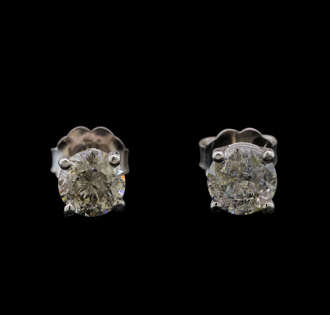 One pair electronically tested 14KT white gold ladies cast diamond stud earrings with friction posts with a bright polish finish. Identified with markings of "14K". Condition is new. Containing: Two prong set round brilliant cut diamonds, measuring 5.20 - 5.20 x 3.14mm (depth est.) approximate total weight of 2 Stones = 1.04ct. Clarity: I-3 to I-3. Color: J, Cut is Good. Diamonds are graded in the mounting, unless otherwise stated. Total Weight of Diamonds 1.04ct. Total Weight of Stud Earrings 1.00 grams. GGL Appraised at $1,490.00.