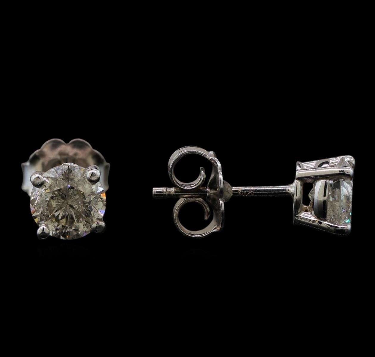 One pair electronically tested 14KT white gold ladies cast diamond stud earrings with friction posts with a bright polish finish. Identified with markings of "14K". Condition is new. Containing: Two prong set round brilliant cut diamonds, measuring 5.20 - 5.20 x 3.14mm (depth est.) approximate total weight of 2 Stones = 1.04ct. Clarity: I-3 to I-3. Color: J, Cut is Good. Diamonds are graded in the mounting, unless otherwise stated. Total Weight of Diamonds 1.04ct. Total Weight of Stud Earrings 1.00 grams. GGL Appraised.